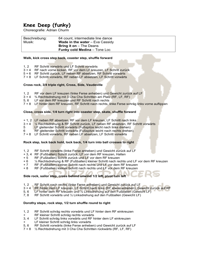 Knee Deep (funky) Choreografie: Adrian Churm Beschreibung: Musik: 64 count, intermediate line dance Wade in the water – Eva Cassidy Bring it on – The Deans Funky cold Medina – Tone Loc Walk, kick cross step back, coaster step, shuffle forward 1, 2 3+4 5+6 7+8 RF Schritt vorwärts und LF Schritt vorwärts RF nach vorne kicken, RF vor dem LF kreuzen, LF Schritt zurück RF Schritt zurück, LF neben RF absetzen, RF Schritt vorwärts LF Schritt vorwärts, RF neben LF absetzen, LF Schritt vorwärts Cross rock, 3/4 triple right, Cross, Side, Vaudeville 1, 2 3+4 5, 6 7+8 RF vor dem LF kreuzen (linke Ferse anheben) und Gewicht zurück auf LF ¾ Rechtsdrehung mit 3 Cha Cha Schritten am Platz (RF, LF, RF) LF vor dem RF kreuzen und RF Schritt nach rechts LF hinter dem RF kreuzen, RF Schritt nach rechts, linke Ferse schräg links vorne auftippen Close, cross side, 1/4 turn right into coaster step, skate, shuffle forward + 1, 2 3+4 5 6 7+8 LF neben RF absetzen, RF vor dem LF kreuzen, LF Schritt nach links ¼ Rechtsdrehung & RF Schritt zurück, LF neben RF absetzen, RF Schritt vorwärts LF gleitender Schritt vorwärts (Fußspitze leicht nach links drehen) RF gleitender Schritt vorwärts (Fußspitze leicht nach rechts drehen) LF Schritt vorwärts, RF neben LF absetzen, LF Schritt vorwärts Rock step, lock back hold, lock back, 1/4 turn into ball crosses to right 1, 2 + 3, 4 +5 +6 +7 +8 RF Schritt vorwärts (linke Ferse anheben) und Gewicht zurück auf LF RF (Fußballen) Schritt zurück, LF vor dem RF kreuzen, Halten RF (Fußballen) Schritt zurück und LF vor dem RF kreuzen ¼ Rechtsdrehung & RF (Fußballen) kleiner Schritt nach rechts und LF vor dem RF kreuzen RF (Fußballen) kleiner Schritt nach rechts und LF vor dem RF kreuzen RF (Fußballen) kleiner Schritt nach rechts und LF vor dem RF kreuzen Side rock, sailor step, cross behind unwind 1/2 left, pivot turn left 1, 2 3+4 5, 6 7, 8 RF Schritt nach rechts (linke Ferse anheben) und Gewicht zurück auf LF RF hinter dem LF kreuzen, LF Schritt nach links (RF etwas anheben), Gewicht zurück auf RF LF hinter dem RF kreuzen und ½ Linksdrehung auf den Fußballen (Gewicht LF) RF Schritt vorwärts und ½ Linksdrehung auf den Fußballen (Gewicht LF) Dorothy steps, rock step, 1/2 turn shuffle round to right 1, 2 + 3, 4 + 5, 6 7+8 RF Schritt schräg rechts vorwärts und LF hinter dem RF einkreuzen RF kleiner Schritt schräg rechts vorwärts LF Schritt schräg links vorwärts und RF hinter dem LF einkreuzen LF kleiner Schritt schräg links vorwärts RF Schritt vorwärts (linke Ferse anheben) und Gewicht zurück auf LF ½ Rechtsdrehung mit 3 Cha Cha Schritten rückwärts (RF, LF, RF) Dorothy steps, rock step, 1/2 turn shuffle round to left 1, 2 + 3, 4 + 5, 6 7+8 LF Schritt schräg links vorwärts und RF hinter dem LF einkreuzen LF kleiner Schritt schräg links vorwärts RF Schritt schräg rechts vorwärts und LF hinter dem RF einkreuzen RF kleiner Schritt schräg rechts vorwärts LF Schritt vorwärts (rechte Ferse anheben) und Gewicht zurück auf RF ½ Linksdrehung mit 3 Cha Cha Schritten rückwärts (LF, RF, LF) Rock step, jazz jump back, kick, back, heel tap, close tap, back, heel tap, close 1, 2 +3 4 5+6 +7 +8+ RF Schritt vorwärts (linke Ferse anheben) und Gewicht zurück auf LF RF kleiner hüpfender Schritt nach hinten und LF kleiner hüpfender Schritt nach links Halten RF nach vorne kicken, RF Schritt zurück, linke Ferse vorne auftippen LF neben RF absetzen und RF neben LF auftippen RF Schritt zurück, linke Ferse vorne auftippen, LF neben RF absetzen Tanz beginnt von vorne Inhalt, Beschreibung, Rechtschreibung, usw. Ohne Gewähr, Sabine, 0176/213 18 729