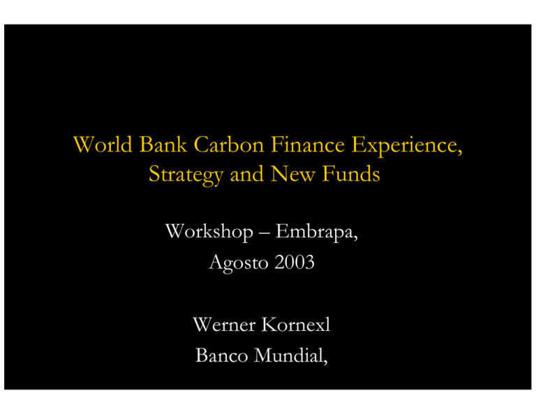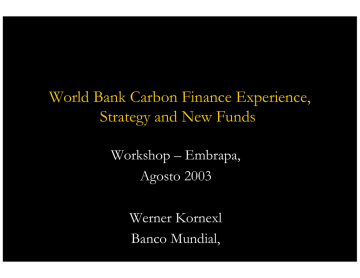 World Bank Carbon Finance Experience, Strategy and New Funds Workshop – Embrapa, Agosto 2003 Werner Kornexl Banco Mundial, Projetos de Financiamento de Carbono Investidor Bancos Capital Empréstimos Promover Desenvolvimento Sustentável Power Purchase Agreement $$ $ $ Produtos prinicipal P.e. eleticidade Carbon Credits Carbon Fund 2 $$ 2 Emission Reduction Purchase Agreement 2 Negócios de Carbono do Banco Mundial Linha de Produtos • Prototype Carbon Fund - PCF: $180 milhões • Netherlands Clean Development Facility – apenas CDM, $30 milhões/ano entre 2002-2005 • Community Development Carbon Fund (CDCF): iniciou Junho 2003 com $40 milhões • BioCarbon Fund (BioCF): vai iniciar final de 2003 com $30-40 milhões • Climate Neutral Bank; iniciou Maço, 2003 3 PCF Participantes ($180 milhões) Public Sector (6) Governments of Netherlands, Finland, Sweden, Norway, Canada, and Japan Bank for International Cooperation Private Sector: (17) RWE - Germany, Gaz de France, Tokyo Electric Power, Deutsche Bank, Chubu Electric, Chugoku Electric, Kyushu Electric, Shikoku Electric, Tohoku Electric, Mitsui, Mitsubishi, Electrabel, NorskHydro- Norway, Statoil -Norway, BP, Fortum, RaboBank, NL 4 Resumo dos Negócios de Carbono do Banco Mundial • Número e valor dos Emissions Reductions Purchase Agreements (ERPAs) negociado: 16, $43m • Número e valor de projetos aprovados pelo PCF: 28, $119.2m • Número e valor de projetos do NDCF: 13, US$ 157.1m • Investimento total dos projetos aprovados (estimativa): US$ 1.081 bilhões 5 Lições e mensagens mais importantes • Incerteza regulatória permanece após Marrakesh: • • • • • • CDM Executive Board está ainda definindo metodologias adequadas para projetos de CDM Kyoto Protocol não entrou em vigor LULUCF regras não foram aprovadas Criação efetiva de Emissões Reduzidas de CDM/JI permanece complexa e demorada: aprox. 3-7 years do desenho até venda de ERs. Setor Privado não compra diretamente de projetos em escala significante Necessidade para Capacitação • • Primeiro negócio em cada país é essencial para criar interesse e elevar o nível de conhecimento CDM e AT devem andar junto para apoiar o desenvolvimento do mercado 6 Lições e mensagens mais importantes • • • • Pequenos projetos e países e comunidades carentes estão excluídos do mercado. Os riscos e custos devem ser compartilhados por intermediários LULUCF – “Sinks” contribuem para desenvolvimento sustentável, mas são pouco compreendidos e pouco aceitos pelos compradores Levar um projeto para a viabilidade financeira é muito complexo e complicado: Possibilidade de financiamento com lastro de contratos de carbono Riscos de desempenho é altíssimo – período de contrato são de longo prazo 7 18 Carbon Finance flows 2001-2002 Volume of ER Projects (MtCo2e) 16 Australia 14 12 10 Canada 8 Asia Africa 6 4 2 USA Latin America 0 Annex II JI Countries CDM Countries 8 Source: Authors’ own calculation, based on transaction database assembled with Natsource, Co2e.com and PointCarbon Tamando do mercado – as incertezas permanecem • Questionável se o PK entra em vigor • Participação do setor privado, principalmente o dos Estados Unidos • Regras do LULUCF • Inclusão do CDM/JI no European Emission Trading Scheme • Hot Air dos Países em transição • Capacidade dos países em desenvolvimento • Time is running 9 Desenvolvimento Sustentável: Resultados certificados • PCF demonstrou a viabilidade e eficiência de criar benefícios ambientais e sociais além do carbono: • Exemplos do PCF: – Colombia Jepirachi Wind Power Plant (19MW) certifica também: • água potável, • eletricidade para escolas/hospitais, e • porto para pescadores indígenas; – Plantar Project no Brasil (23,400ha plantações para carvão vegetal) certifica também: • • • • Melhoramento da saúde dos trabalhadores ABRINQ certificação Benefícios de biodiversidade FSC certificação para Manejo Florestal 10 Carbon Asset Creation and Maintenance Manufacturing Process and Costs based on Bank experience ont hs Up to 21 ye ars 3m 2 mon ths 1-3 yea 2m on ths rs 3 months 11 Impacto do Financiamento de Carbono ROI ($3/tCO2e) Technology ∆ROI Hydro Wind Bagasse Energy Eff.-District Heating Gas Flare Reduction Biomass Municipal Solid Waste 0.8-2.6 1.0-1.3 0.4-3.6 ~ 2.0 2-4 2-7 5-10 12 Estratégia do Banco Mundial : Além do PCF • Desenvolvimento do Mercado de Carbono 9 Promover primeiras experiências : novos países, novos projetos 9 Criar modelos e manter o nível alto: Reduzir bareiras de entrada • • • • Melhorar AT/Capacitação Demonstrar atividades agroflorestias viáveis Abrir mercado para pequenos projetos e pequenos países: Disponibilizar documentos standardizados (contratos, baseline, protocolo de monitoramento, inormação sobre o mercado) 13 • Pequenos projetos estão sendo prejudicados por altos custos de desenvolvimento • Pequenos países vão perder o interesse dos investidores de financiamento de carbono • Esforço especial para: – Mitigar riscos, juntar muitas pequenas transações – Standardizar requerimentos para CDM/JI e processos comerciais 14 • Sequestro de Carbono é importante para o desenvolvimento rural redução de pobreza, manejo de recursos naturais e implicações ambientais globais • PCF demonstra que projetos de sequestro conseguem contribuir para conservação da biodiversidade e promover melhores condições para populações locais, mas não pode financiar mais que 3 projetos • Necessidade de um fundo especial para ativiades agrícolas e florestais, manejo de recursos naturais e conservação da biodiversidade 15 • Falta ainda a definição das regras para projetos LULUCF – Reflorestamento/Aforestamento: data para a linha de base – Questão da permanência do carbon sequestrado (sistema de seguros, creditos temporários) – Metodologias de linha de base – incluindo o progresso d