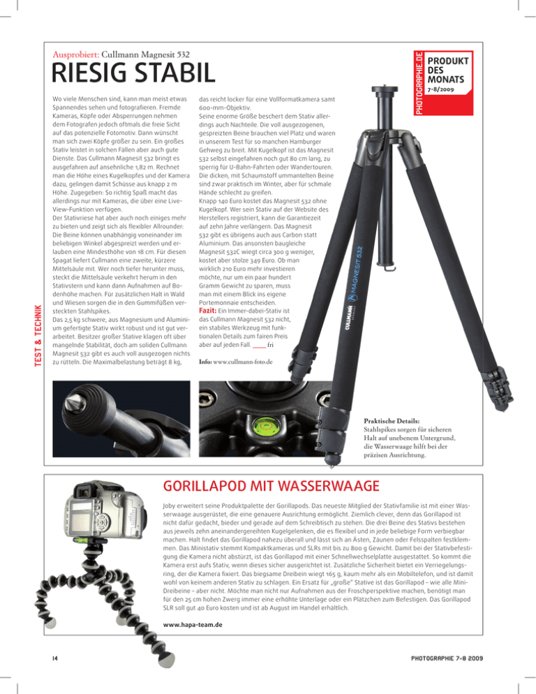 Ausprobiert: Cullmann Magnesit 532 TEST & TECHNIK RIESIG STABIL Wo viele Menschen sind, kann man meist etwas Spannendes sehen und fotografieren. Fremde Kameras, Köpfe oder Absperrungen nehmen dem Fotografen jedoch oftmals die freie Sicht auf das potenzielle Fotomotiv. Dann wünscht man sich zwei Köpfe größer zu sein. Ein großes Stativ leistet in solchen Fällen aber auch gute Dienste. Das Cullmann Magnesit 532 bringt es ausgefahren auf ansehnliche 1,82 m. Rechnet man die Höhe eines Kugelkopfes und der Kamera dazu, gelingen damit Schüsse aus knapp 2 m Höhe. Zugegeben: So richtig Spaß macht das allerdings nur mit Kameras, die über eine LiveView-Funktion verfügen. Der Stativriese hat aber auch noch einiges mehr zu bieten und zeigt sich als flexibler Allrounder: Die Beine können unabhängig voneinander im beliebigen Winkel abgespreizt werden und erlauben eine Mindesthöhe von 18 cm. Für diesen Spagat liefert Cullmann eine zweite, kürzere Mittelsäule mit. Wer noch tiefer herunter muss, steckt die Mittelsäule verkehrt herum in den Stativstern und kann dann Aufnahmen auf Bodenhöhe machen. Für zusätzlichen Halt in Wald und Wiesen sorgen die in den Gummifüßen versteckten Stahlspikes. Das 2,5 kg schwere, aus Magnesium und Aluminium gefertigte Stativ wirkt robust und ist gut verarbeitet. Besitzer großer Stative klagen oft über mangelnde Stabilität, doch am soliden Cullmann Magnesit 532 gibt es auch voll ausgezogen nichts zu rütteln. Die Maximalbelastung beträgt 8 kg, 7-8/2009 das reicht locker für eine Vollformatkamera samt 600-mm-Objektiv. Seine enorme Größe beschert dem Stativ allerdings auch Nachteile. Die voll ausgezogenen, gespreizten Beine brauchen viel Platz und waren in unserem Test für so manchen Hamburger Gehweg zu breit. Mit Kugelkopf ist das Magnesit 532 selbst eingefahren noch gut 80 cm lang, zu sperrig für U-Bahn-Fahrten oder Wandertouren. Die dicken, mit Schaumstoff ummantelten Beine sind zwar praktisch im Winter, aber für schmale Hände schlecht zu greifen. Knapp 140 Euro kostet das Magnesit 532 ohne Kugelkopf. Wer sein Stativ auf der Website des Herstellers registriert, kann die Garantiezeit auf zehn Jahre verlängern. Das Magnesit 532 gibt es übrigens auch aus Carbon statt Aluminium. Das ansonsten baugleiche Magnesit 532C wiegt circa 300 g weniger, kostet aber stolze 349 Euro. Ob man wirklich 210 Euro mehr investieren möchte, nur um ein paar hundert Gramm Gewicht zu sparen, muss man mit einem Blick ins eigene Portemonnaie entscheiden. Fazit: Ein Immer-dabei-Stativ ist das Cullmann Magnesit 532 nicht, ein stabiles Werkzeug mit funktionalen Details zum fairen Preis aber auf jeden Fall. _ fri Info: www.cullmann-foto.de Praktische Details: Stahlspikes sorgen für sicheren Halt auf unebenem Untergrund, die Wasserwaage hilft bei der präzisen Ausrichtung. GORILLAPOD MIT WASSERWAAGE Joby erweitert seine Produktpalette der Gorillapods. Das neueste Mitglied der Stativfamilie ist mit einer Wasserwaage ausgerüstet, die eine genauere Ausrichtung ermöglicht. Ziemlich clever, denn das Gorillapod ist nicht dafür gedacht, bieder und gerade auf dem Schreibtisch zu stehen. Die drei Beine des Stativs bestehen aus jeweils zehn aneinandergereihten Kugelgelenken, die es flexibel und in jede beliebige Form verbiegbar machen. Halt findet das Gorillapod nahezu überall und lässt sich an Ästen, Zäunen oder Felsspalten festklemmen. Das Ministativ stemmt Kompaktkameras und SLRs mit bis zu 800 g Gewicht. Damit bei der Stativbefestigung die Kamera nicht abstürzt, ist das Gorillapod mit einer Schnellwechselplatte ausgestattet. So kommt die Kamera erst aufs Stativ, wenn dieses sicher ausgerichtet ist. Zusätzliche Sicherheit bietet ein Verriegelungsring, der die Kamera fixiert. Das biegsame Dreibein wiegt 165 g, kaum mehr als ein Mobiltelefon, und ist damit wohl von keinem anderen Stativ zu schlagen. Ein Ersatz für „große“ Stative ist das Gorillapod – wie alle MiniDreibeine – aber nicht. Möchte man nicht nur Aufnahmen aus der Froschperspektive machen, benötigt man für den 25 cm hohen Zwerg immer eine erhöhte Unterlage oder ein Plätzchen zum Befestigen. Das Gorillapod SLR soll gut 40 Euro kosten und ist ab August im Handel erhältlich. www.hapa-team.de 14 PHOTOGRAPHIE 78 2009