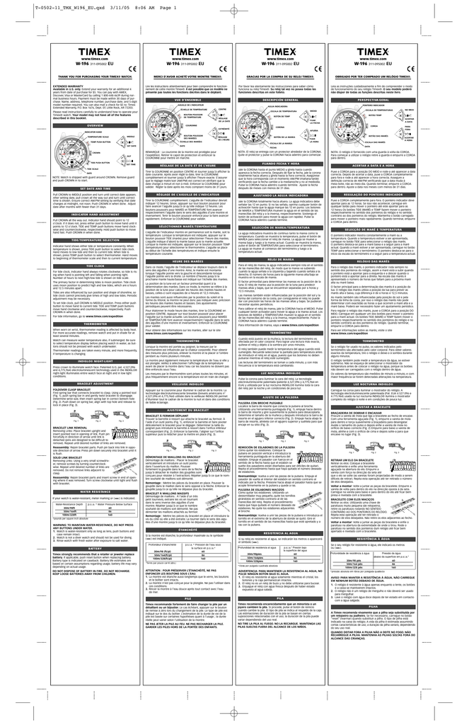 T-0502-11_TMX_W196_EU.qxd 3/11/05 8:06 AM Page 1 www.timex.com W-196 311-095002 www.timex.com EU W-196 THANK YOU FOR PURCHASING YOUR TIMEX® WATCH. EXTENDED WARRANTY Available in U.S. only. Extend your warranty for an additional 4 years from date of purchase for $5. You can pay with AMEX, Discover, Visa or MasterCard by calling 1 800-448-4639 during normal business hours. Payment must be made within 30 days of purchase. Name, address, telephone number, purchase date, and 5-digit model number required. You can also mail a check for $5 to: Timex Extended Warranty, P.O. Box 1676, Dept. EF, Little Rock, AR 72203. 311-095002 www.timex.com EU W-196 MERCI D’AVOIR ACHETÉ VOTRE MONTRE TIMEX®. Lire les instructions attentivement pour bien comprendre le fonctionnement de cette montre Timex®. Il est possible que ce modèle ne présente pas toutes les fonctions décrites dans le dépliant. W-196 GRACIAS POR LA COMPRA DE SU RELOJ TIMEX®. Por favor lea atentamente las instrucciones para saber cómo funciona su reloj Timex®. Su reloj tal vez no posea todas las funciones descritas en este folleto. AIGUILLE DE L’INDICATEUR CENTRE BOUTON POUSSOIR DE TEMPÉRATURE PONTEIRO INDICADOR BOTÃO TEMP RÉGLAGE DE LA DATE BOUTON POUSSOIR DES MARÉES SET DATE CROWN OUT TIDE PUSH BUTTON SET TIME COROA CORONA NOTE: Watch is shipped with guard around CROWN. Remove guard and push CROWN in to start. SET DATE AND TIME Pull CROWN to MIDDLE position and turn until correct date appears. After setting date, pull crown all the way out and turn until correct time is shown. Ensure correct AM/PM setting by verifying that date changes at midnight, not noon. Push CROWN in when done. Adjust date after months with fewer than 31 days. I N D I C ATOR HAND A D J U S T M E N T Pull CROWN all the way out. Indicator hand should point to 12 o’clock. If it does not, press either push button to move hand until it points to 12 o’clock. TIDE and TEMP push buttons move hand clockwise and counterclockwise, respectively. Hold push button to move hand fast. Push CROWN in when done. T I D E / T E M P E R ATURE SELECTION Indicator hand shows either tide or temperature constantly. When temperature is shown, press TIDE push button to select tide clock. Hand moves to low tide and then to current tide. When tide is shown, press TEMP push button to select thermometer. Hand moves to beginning of thermometer scale and then to current temperature. For tide clock, indicator hand always rotates clockwise, so tide is rising when hand is pointing left and falling when pointing right. Number of hours to next high/low tide is shown on tide scale. The primary factor in determining tides is moon position. Tide clock uses moon position to predict high and low tides, which are 6 hours and 12.5 minutes apart. Tides are also influenced by sun position and shape of shoreline, so tide clock cannot precisely give times of high and low tides. Periodic adjustment may be necessary. To set tide clock, pull CROWN to MIDDLE position. Press either push button to move hand to current tide. TIDE and TEMP push buttons move hand clockwise and counterclockwise, respectively. Push CROWN in when done. For tide information, go to www.timex.com/expedition THERMOMETER When worn on wrist, thermometer reading is affected by body heat. For more accurate readings, remove watch and put in shade for at least several minutes. Watch can measure water temperature also, if submerged. Be sure to select temperature display before placing watch in water, as buttons should not be pressed with watch underwater. Thermometer readings are taken every minute, and more frequently, if temperature is changing. INDIGLO® NIGHT- L I G H T Press crown to illuminate watch face. Patented (U.S. pat. 4,527,096 and 4,775,964) electroluminescent technology used in the INDIGLO® night-light illuminates entire watch face at night and in low light conditions. R É G L AGE DE LA DATE ET DE L’ H E U R E Tirer la COURONNE en position CENTRE et tourner jusqu’à afficher la date courante. Après avoir réglé la date, tirer la COURONNE complètement et tourner jusqu’à afficher l’heure exacte. S’assurer que le réglage matin/soir (AM/PM) est correct en vérifiant que la date change à minuit et non à midi. Enfoncer la COURONNE pour valider. Régler la date après les mois comptant moins de 31 jours. R É G L AGE DE L’AIGUILLE DE L’ I N D I C AT E U R Tirer la COURONNE complètement. L’aiguille de l’indicateur devrait indiquer 12 heures. Sinon, appuyer sur tout bouton poussoir pour faire avancer l’aiguille jusqu’à ce qu’elle indique 12 heures. Les boutons poussoirs pour MARÉE et TEMPÉRATURE font avancer respectivement l’aiguille dans le sens des aiguilles d’une montre et inversement. Tenir le bouton poussoir enfoncé pour la faire avancer rapidement. Enfoncer la COURONNE pour valider. F I JANDO FECHA Y HORA A J U S TANDO LA AG U JA INDICADORA Jale la CORONA totalmente hacia afuera. La aguja indicadora debe señalar las 12 en punto. Si no las señala, oprima cualquier botón de activación hasta que la aguja marque las 12 en punto. Los botones de MAREA y TEMPERATURA mueven la aguja en el sentido de las manecillas del reloj y a la inversa, respectivamente. Sostenga el botón de activación para mover la aguja con rapidez. Pulse la CORONA hacia adentro cuando termine. SELECCIÓN DE MAREA/TEMPERAT U R A La aguja indicadora muestra de continuo tanto la marea como la temperatura. Cuando se muestra la temperatura, pulse el botón de MAREA para seleccionar el reloj de marea. La aguja se mueve a marea baja y luego a la marea actual. Cuando se muestra la marea, pulse el botón de TEMPERATURA para seleccionar el termómetro. La aguja se mueve al comienzo del termómetro y luego a la temperatura actual. La position de la lune est un facteur primordial quant à la détermination des marées. Dans ce mode, la montre se réfère à la position de la lune pour calculer les heures des marées hautes et