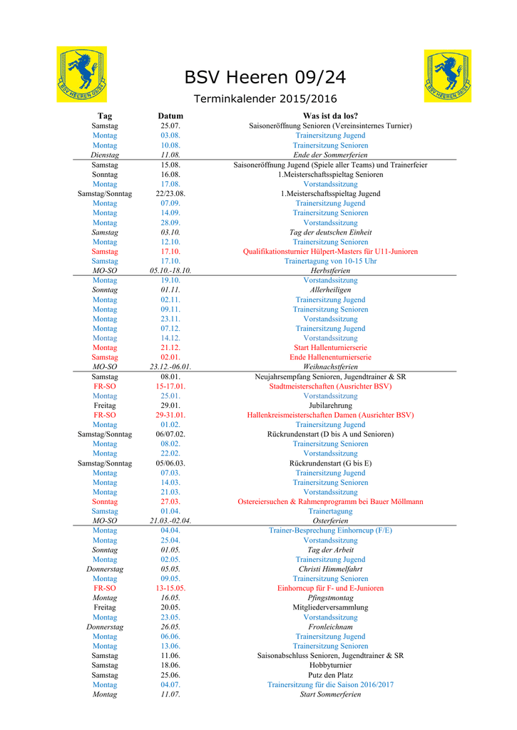 BSV Heeren 09/24 Terminkalender 2015/2016 Tag Datum Was ist da los? Samstag Montag Montag Dienstag Samstag Sonntag Montag Samstag/Sonntag Montag Montag Montag Samstag Montag Samstag Samstag MO-SO Montag Sonntag Montag Montag Montag Montag Montag Montag Samstag MO-SO Samstag FR-SO Montag Freitag FR-SO Montag Samstag/Sonntag Montag Montag Samstag/Sonntag Montag Montag Montag Sonntag Samstag MO-SO Montag Montag Sonntag Montag Donnerstag Montag FR-SO Montag Freitag Montag Donnerstag Montag Montag Samstag Samstag Samstag Montag Montag 25.07. 03.08. 10.08. 11.08. 15.08. 16.08. 17.08. 22/23.08. 07.09. 14.09. 28.09. 03.10. 12.10. 17.10. 17.10. 05.10.-18.10. 19.10. 01.11. 02.11. 09.11. 23.11. 07.12. 14.12. 21.12. 02.01. 23.12.-06.01. 08.01. 15-17.01. 25.01. 29.01. 29-31.01. 01.02. 06/07.02. 08.02. 22.02. 05/06.03. 07.03. 14.03. 21.03. 27.03. 01.04. 21.03.-02.04. 04.04. 25.04. 01.05. 02.05. 05.05. 09.05. 13-15.05. 16.05. 20.05. 23.05. 26.05. 06.06. 13.06. 11.06. 18.06. 25.06. 04.07. 11.07. Saisoneröffnung Senioren (Vereinsinternes Turnier) Trainersitzung Jugend Trainersitzung Senioren Ende der Sommerferien Saisoneröffnung Jugend (Spiele aller Teams) und Trainerfeier 1.Meisterschaftsspieltag Senioren Vorstandssitzung 1.Meisterschaftsspieltag Jugend Trainersitzung Jugend Trainersitzung Senioren Vorstandssitzung Tag der deutschen Einheit Trainersitzung Senioren Qualifikationsturnier Hülpert-Masters für U11-Junioren Trainertagung von 10-15 Uhr Herbstferien Vorstandssitzung Allerheiligen Trainersitzung Jugend Trainersitzung Senioren Vorstandssitzung Trainersitzung Jugend Vorstandssitzung Start Hallenturnierserie Ende Hallenenturnierserie Weihnachstferien Neujahrsempfang Senioren, Jugendtrainer & SR Stadtmeisterschaften (Ausrichter BSV) Vorstandssitzung Jubilarehrung Hallenkreismeisterschaften Damen (Ausrichter BSV) Trainersitzung Jugend Rückrundenstart (D bis A und Senioren) Trainersitzung Senioren Vorstandssitzung Rückrundenstart (G bis E) Trainersitzung Jugend Trainersitzung Senioren Vorstandssitzung Ostereiersuchen & Rahmenprogramm bei Bauer Möllmann Trainertagung Osterferien Trainer-Besprechung Einhorncup (F/E) Vorstandssitzung Tag der Arbeit Trainersitzung Jugend Christi Himmelfahrt Trainersitzung Senioren Einhorncup für F- und E-Junioren Pfingstmontag Mitgliederversammlung Vorstandssitzung Fronleichnam Trainersitzung Jugend Trainersitzung Senioren Saisonabschluss Senioren, Jugendtrainer & SR Hobbyturnier Putz den Platz Trainersitzung für die Saison 2016/2017 Start Sommerferien