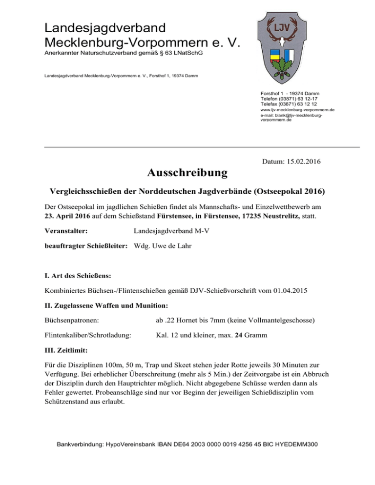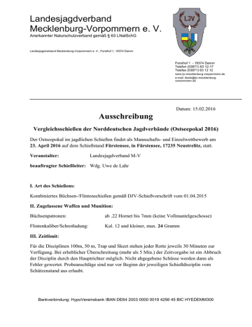Landesjagdverband Mecklenburg-Vorpommern e. V. Anerkannter Naturschutzverband gemäß § 63 LNatSchG Landesjagdverband Mecklenburg-Vorpommern e. V., Forsthof 1, 19374 Damm Forsthof 1 - 19374 Damm Telefon (03871) 63 12-17 Telefax (03871) 63 12 12 www.ljv-mecklenburg-vorpommern.de e-mail: [email protected] Datum: 15.02.2016 Ausschreibung Vergleichsschießen der Norddeutschen Jagdverbände (Ostseepokal 2016) Der Ostseepokal im jagdlichen Schießen findet als Mannschafts- und Einzelwettbewerb am 23. April 2016 auf dem Schießstand Fürstensee, in Fürstensee, 17235 Neustrelitz, statt. Veranstalter: Landesjagdverband M-V beauftragter Schießleiter: Wdg. Uwe de Lahr I. Art des Schießens: Kombiniertes Büchsen-/Flintenschießen gemäß DJV-Schießvorschrift vom 01.04.2015 II. Zugelassene Waffen und Munition: Büchsenpatronen: ab .22 Hornet bis 7mm (keine Vollmantelgeschosse) Flintenkaliber/Schrotladung: Kal. 12 und kleiner, max. 24 Gramm III. Zeitlimit: Für die Disziplinen 100m, 50 m, Trap und Skeet stehen jeder Rotte jeweils 30 Minuten zur Verfügung. Bei erheblicher Überschreitung (mehr als 5 Min.) der Zeitvorgabe ist ein Abbruch der Disziplin durch den Hauptrichter möglich. Nicht abgegebene Schüsse werden dann als Fehler gewertet. Probeanschläge sind nur vor Beginn der jeweiligen Schießdisziplin vom Schützenstand aus erlaubt. Bankverbindung: HypoVereinsbank IBAN DE64 2003 0000 0019 4256 45 BIC HYEDEMM300 Landesjagdverband Mecklenburg-Vorpommern e. V. Anerkannter Naturschutzverband gemäß § 63 LNatSchG Landesjagdverband Mecklenburg-Vorpommern e. V., Forsthof 1, 19374 Damm Forsthof 1 - 19374 Damm Telefon (03871) 63 12-17 Telefax (03871) 63 12 12 www.ljv-mecklenburg-vorpommern.de e-mail: [email protected] Datum: 15.02.2016 IV. Teilnahmebedingungen: Am Ostseepokalschießen können alle Jagdschützen teilnehmen, die Mitglied im Landesjagdverband Brandenburg, Hamburg, Schleswig-Holstein und MecklenburgVorpommern sind, und einen gültigen Jagdschein besitzen, oder eine ausreichende Haftpflichtversicherung nachweisen können. V. Anmeldung: Die Teilnehmerzahl ist auf 42 Teilnehmer begrenzt. Meldeschluss ist der 15.04.2016 Die Meldung erfolgt telefonisch oder schriftlich an: Uwe de Lahr Plantagenring 8 18190 Sanitz Tel.: 0174-1853898 Mail: [email protected] Nachmeldungen sind je nach Verfügbarkeit von Startplätzen am Tag des Wettkampfes möglich. Hierüber entscheidet die Schießleitung. VI. Nenngeld: Das Nenngeld beträgt je Teilnehmer 35,- Euro, und ist am Tag des Schießens auf dem Schießstand zu entrichten. VII. Zeitplan: Der Wettkampf beginnt am Samstag pünktlich um 09:00 Uhr (Begrüßung 08:45 Uhr). Den detaillierten Zeitplan entnehmen Sie bitte dem Aushang auf dem Schießplatz. VIII. Schiedsgericht: Das Schiedsgericht wird zu Beginn des Schießens bekanntgegeben. Ein Protest ist sofort anzumelden und es wird bei der Anmeldung eine Protestgebühr in Höhe von 25,- Euro erhoben. Bei berechtigten Protest wird die Gebühr zurückerstattet. Proteste sind nur möglich, Bankverbindung: HypoVereinsbank IBAN DE64 2003 0000 0019 4256 45 BIC HYEDEMM300 Landesjagdverband Mecklenburg-Vorpommern e. V. Anerkannter Naturschutzverband gemäß § 63 LNatSchG Landesjagdverband Mecklenburg-Vorpommern e. V., Forsthof 1, 19374 Damm Forsthof 1 - 19374 Damm Telefon (03871) 63 12-17 Telefax (03871) 63 12 12 www.ljv-mecklenburg-vorpommern.de e-mail: [email protected] Datum: 15.02.2016 wenn sich die Mannschaft oder ein Schütze in der Bewertung des eigenen Schießergebnisses benachteiligt sieht. IX. Wichtige Hinweise: - Das Abrufen der Tauben erfolgt durch das sogenannte Abwinken (deutlich sichtbares kurzes Absenken des Laufes) - Im Interesse eines kontinuierlichen Ablaufes kann die Schießleitung Mannschaften mit weniger als 6 Schützen zur Auffüllung von Schießrotten aufteilen. - Die Schießrotten haben 15 Minuten vor Schießbeginn am Stand zu erscheinen - Der Genuss von Alkohol vor und während des Schießens ist untersagt - Alle Teilnehmer treten zum Wettkampf in jagdlicher Kleidung an. - Der Mannschaftsleiter ist für den Empfang und die ordnungsgemäße sowie vollständige Rückgabe der Startnummern verantwortlich. Für jede nicht oder beschädigt zurückgegebene Startnummer wird eine Gebühr in Höhe von 10,- Euro erhoben. - Den Anweisungen der Standaufsichten ist Folge zu leisten. Die Vorführung der Scheibe vor Beendigung der jeweiligen Disziplin ist nicht zulässig. - Wir bitten um eine möglichst vollständige Teilnahme an der Siegerehrung. Grobe Verstöße gegen die DJV-Schießvorschrift und diese Ausschreibung können zur Disqualifikation führen. X. Wertung und Siegerehrung: Die Ehrung der Einzelschützen und Mannschaften erfolgt ca. 45 Minuten nach Beendigung des Schießens. Gewertet werden je Bundesland die 4 besten Schützen zur Ermittlung des Gewinners des Wanderpokals. Mit Pokalen werden die jeweils besten Schützen in den Einzeldisziplinen und in der Kombination geehrt. Uwe de Lahr Landesschießobmann Landesjagdverband Mecklenburg-Vorpommern Bankverbindung: HypoVereinsbank IBAN DE64 2003 0000 0019 4256 45 BIC HYEDEMM300