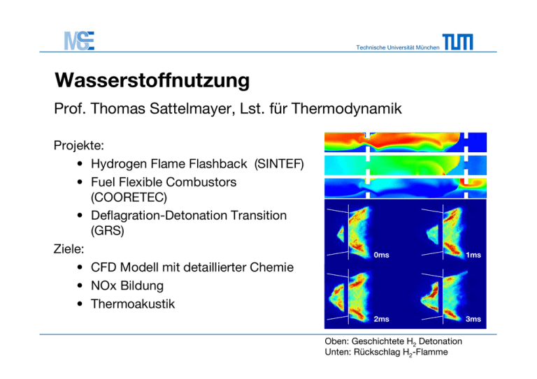 Technische Universität München Wasserstoffnutzung Prof. Thomas Sattelmayer, Lst. für Thermodynamik Projekte: • Hydrogen Flame Flashback (SINTEF) • Fuel Flexible Combustors (COORETEC) • Deflagration-Detonation Transition (GRS) Ziele: • CFD Modell mit detaillierter Chemie • NOx Bildung • Thermoakustik 0ms 1ms 2ms 3ms Oben: Geschichtete H2 Detonation Unten: Rückschlag H2-Flamme Technische Universität München Solare Wasseraufbereitung Prof. T. Sattelmayer, Prof. W. Polifke, Lst. f. Thermodynamik Projekte: • TUM DeSal Challenge 2011 • Solare Feuchtluftdestillation mit Latentwärmespeichern (MEDRC / BMBF) • Feuchtluftdestillation zur Gärrestaufbereitung (BMWi) • Solare Membrandestillation mit CPV/T Solevorwärmung (BMBF) Ziele: • CFD Modelle, 1-D Modelle • Neue Technologien / Effizienzsteigerung in der Entsalzung Oben: Anlagenlayout Gärreste Unten: TUM DeSal Challenge, HD-Teststand Technische Universität München Solar Engineering Prof. Thomas Sattelmayer, Lst. für Thermodynamik Projekte: • Solar Power Block for MSF Desalination (BMBF) • Solar CSP Processing of Lunar Regolith (DLR) • Unsicherheiten in der PV-Ertragssimulation Ziele: • Transienter Betrieb von MSF • Wärme-/Stofftransportvorgänge in Regolith, Spiegelungenauigkeiten • Optische Verluste, Modultemperatur April 28th, 2010 (Good Day) Mai, 1st, 2010 (Bad Day) Oben: CSP-System für MSF, Lunar Lander Unten: Simulation von PV-Modultemperaturen