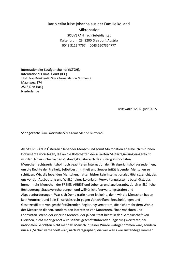 karin erika luise johanna aus der Familie kolland Mikronation SOUVERÄN nach Subsidiarität Kaltenbrunn 23, 8200 Gleisdorf, Austria 0043 3112 7767 0043 6507354777 Internationaler Strafgerichtshof (ISTGH), International Crimal Court (ICC) z.Hd. Frau Präsidentin Silvia Fernandez de Gurmendi Maanweg 174 2516 Den Haag Niederlande Mittwoch 12. August 2015 Sehr geehrte Frau Präsidentin Silvia Fernandez de Gurmendi Als SOUVERÄN in Österreich lebender Mensch und somit Mikronation erlaube ich mir Ihnen Dokumente vorzulegen, die an die Botschaften der alliierten Militärregierung eingereicht wurden. Ich ersuche Sie den Zuständigkeitsbereich des bislang als höchsten Menschenrechtsgerichtshof hoch geachteten Internationalen Strafgerichtshof auszudehnen, um die Rechte der Freiheit, Selbstbestimmtheit und Souveränität lebender Menschen zu schützen. Wir, die lebenden Menschen, hatten bisher kein internationales Höchstgericht, das uns vor der Ausbeutung und Willkür eines kolonialen Verwaltungssystems beschützt, das immer mehr Menschen der FREIEN ARBEIT und Lebensgrundlage beraubt, durch willkürliche Besteuerung, Staatsverschuldungen und willkürliche Verwaltungsstrafen und Abgabenforderungen. Was sich Demokratie nennt ist keine, denn wir die Menschen haben kein Vetorecht und kein Einspruchsrecht gegen Vorschriften, Entscheidungen und Gesetzesdiktate von geschäftsführenden Regierungsvertretern, die nicht mehr dem Wohle der Menschen dienen, sondern den Interessen von Konzernen, Finanzmächten und Lobbyisten. Wenn der einzelne Mensch, der ja den Staat bildet in der Gemeinschaft von Gleichen, nicht mehr gehört wird seitens geschäftsführender Regierungsvertreter, bei nationalen Gerichten nicht mehr als Mensch in seiner Würde wahrgenommen wird, sondern nur als „Sache“ verhandelt wird, nach Paragraphen, die wer weiss wie zustandegekommen sind, dann wird es Zeit aufzustehen um das RECHT der FREIHEIT und Souveränität für sich selbst und somit alle Menschen geltend zu machen. Ein Strafgerichtshof ist sicher wichtig. Aber noch wichtiger wäre ein Gerichtshof der bereits präventiv die Rechte der Menschen schützt, bevor sie verhungern, da ihre Lebensräume ausgeraubt werden, bevor sie in die Flucht getrieben werden, da ihre Rechte nicht anerkannt werden, bevor ihnen Steuern und Abgaben aufgezwungen werden die sie nicht leisten können in selbständiger Arbeit, wodurch sie in Abhängigkeit von Arbeitsplätzen als Lohnsklaven geraten. Bevor sie Banken als Kontoführungsinstitute und Kreditgeber ausgeliefert werden, und bevor ihnen Wohnungen, Häuser, Landwirtschaft und Gewerbebetriebe einfach per Gerichtsbeschluss enteignet werden. Wir haben keine Möglichkeit gegen Richter zu klagen, die nichteinmal mehr ihre Unterschrift unter Urteile und Beschlüsse setzen. Es scheint keinen Menschen mehr zu geben, der VERANTWORTLICH ist. Gewählte Regierungsvertreter stellen sich unter Immunität und erklären sich als „nicht verantwortlich“. Es steht kein freies Geld mehr zur Verfügung, was Unrecht ist, denn es steht ja auch keine freie Natur mehr zur Verfügung mit ihren Schätzen für alle Erdenbewohner. Alles muss in Abhängigkeit von Krediten finanziert werden. Es wäre aber das RECHT der Menschen an der Währung ihres Landes ohne Zinsen und Auflagen zu partizipieren! Denn jede Währung ist durch den Wert des Menschen und den Wert der Natur gesichert und die Menschen haben das Recht – Währungshoheit – ihren Wert als Geldenergie in der Gemeinschaft als ihre Währung zu drucken und zu verwalten. So wie sie das Recht haben auf eine globale Währung die von einem Trustee geschützt wird, der Verantwortung, Transparenz und Rechenschaftspflicht garantiert. Daher setzte ich mich im Kreise weltweit vernetzter Menschen für eine Finanzsystemumstellung ein, die jedem Menschen ein bedingungsloses Grundeinkommen und die Sicherung seiner wahren Werte und Rechte ermöglicht. Ich arbeite seit vielen Jahren ehrenamtlich an einer Heilung dieser Probleme. Bitte, sehr geehrte Frau Präsidentin Silvia Fernandez de Gurmendi lesen Sie meine Dokumente. Ich wäre sehr dankbar, wenn der hoch angesehene Menschenrechtsgerichtshof in Den Haag, Strafverfolgung betreiben würde, auch bei verdeckt begangenen Verbrechen, und auch die Rechte der Menschen per Erlass schützen würde, so dass auch der einzelne Mensch in seinem Recht und seiner Würde anerkannt wird in seiner Souveränität. Ich mache daher einen Anfang als verantwortungsbewusste Österreicherin. Da sowohl der Staatsvertrag 1955 als auch der Vertrag für die Immerwährende Neutralität Österreichs in Moskau liegen, erlaube ich mir Ihnen eine Zweitschrift der Dokumente vorzulegen, wie sie an den Generalstaatsanwalt der Russischen Föderation Haupt Militär Staatsanwalt und an die Botschaft der Russischen Föderation zu Handen des Hohen Kommissars der Militärregierung Herrn Botschafter S. E. Vladimir M. Grinin eingereicht wurden (einmal in meiner Muttersprache Deutsch, einmal Englisch übersetzt). Es ist ein komplexes Thema, das ich Ihnen sehr geehrte Frau Präsidentin Silvia Fernandez de Gurmendi ans Herz legen möchte. Danke. Hochachtungsvoll karin erika luise johanna aus der Familie kolland Diese Anträge und Dokumente wurden an übermittelt an: Generalstaatsanwalt der Russischen Föderation Haupt Militär Staatsanwalt per. Cholsunowa 14 119160 Moskau Главный военный прокурор per. Cholsunowa 14 119160 Москва Российская Федерация Botschaft der Russischen Föderation z. Hd. Des Hohen Kommissars der Militärregierung Herrn Botschafter S. E. Vladimir M. Grinin Unter den Linden 63‐65 D‐10117 Berlin Botschaft des Vereinigten Königreichs von England z.Hd. Des Hohen Kommisars der Militärregierung Herrn Botschafter S. E. Simon McDonald Wilhelmstraße 70‐71 D 10117 Berlin Botschaft von Frankreich z.H.d. Des Hohen Kommisars der Militärregierung Herrn Botschafter S. E. Phillipp Etienne Pariser Platz 5 D 10117 B