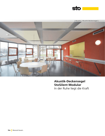 | Akustik | Akustik-Deckensegel | Akustik-Deckensegel StoSilent Modular In der Ruhe liegt die Kraft Die einfache Lösung gegen Lärm Ohren können aufatmen Ob wir uns in einem Raum wohl fühlen, hängt ganz entscheidend von der Akustik ab. Eine schlechte Raumakustik beeinträchtigt die Konzentrations- und Leistungsfähigkeit. Sinnvolle Kommunikation ist kaum möglich. Auf Dauer leidet die Gesundheit. Die Lösung: StoSilent Modular. Die flexiblen Deckensegel sorgen für einen angenehmen Geräuschpegel und sind einfach zu montieren – auch nachträglich. Störfall Hall Entschuldigung? Wie bitte? Was ist los? Ob im Büro, in Hotelfoyers oder in Versammlungsräumen – beinahe jeder hat schon Erfahrungen mit schlechter Raumakustik gemacht. Schuld daran ist der so genannte Nachhalleffekt: Schall wellen werden vom Boden, Wänden, der Decke und den Möbeln reflektiert. Ist die Nachhallzeit zu lang, wirkt der Klang verschwommen. Das gespro chene Wort wird unverständlich. Es entsteht eine unangenehme Raum akustik. Unheimlich schnell und leise Mit StoSilent Modular herrscht endlich Ruhe. Oder wissenschaftlicher formu liert: Die Deckensegel absorbieren die Schallwellen und optimieren die Nach hallzeit. Wie der Name schon sagt, ist das System sehr flexibel und schnell zu montieren: Basis sind vorgefertigte Grundmodule, die frei kombiniert und erweitert werden können. Steht ein Umzug an oder ändert sich das Raum konzept – kein Problem, selbst bei laufendem Betrieb: Die Deckensegel hängen an einer denkbar einfachen Seilkonstruktion und können ruck, zuck auf- und abgehängt werden. StoSilent Modular Spezialanfertigung, Basilika, Weingarten/Deutschland StoSilent Modular bringt: • Weniger Nachhallzeit und einen geringeren Lärmpegel • Höhere Konzentrationsfähigkeit • Bessere Verständlichkeit • Mehr Behaglichkeit 2 | StoSilent Modular Links: Ohne Sto-Akustiksystem. Die Decke reflektiert 100 Prozent des Schalls. Rechts: Mit Sto-Akustiksystem. Eine Decke mit einem Sto-Akustiksystem absorbiert den Schall. StoSilent Modular | 3 Vielschichtig, vielseitig, vielversprechend StoSilent Modular im Detail Das System StoSilent Modular gibt es mit unterschiedlichen Schlussbeschichtungen, die in Sachen Farbigkeit und Struktur kaum Wünsche offen lassen. Dank der besonders stabilen Trägerplatte können Leuchten, Beamer oder auch Lautsprecher problemlos integriert werden. Und wer noch mehr Individualität möchte, kann die Deckensegel auch seinen persönlichen Vorstellungen entsprechend anfertigen lassen. Der Aufbau von StoSilent Modular. Basis von StoSilent Modular ist das bewährte StoSilent Panel aus schall absorbierendem recyceltem Glas. Für eine ansprechende Optik sorgen zwei mögliche Schlussbeschichtungen: • StoSilent Top, die feine putzähnliche Oberfläche, tönbar in über 250 Farbtönen • StoSilent Supferein, die raue putzähn liche Oberfläche, tönbar in über 450 Farbtönen Noch mehr Schallreduktion – nämlich bis zu 35 % – bringt eine Schaumauf lage auf der Oberseite der Trägerplatte. Sie absorbiert auch die Schallwellen, die von der Decke reflektiert werden und von oben auf die Trägerplatte treffen. Glaselemente und integrierte Lichtsysteme. Integrierte Lichtsysteme des PremiumHerstellers Gera Leuchten setzen besondere Akzente in Sachen Ästhetik und Funktion. Dank der Mischung aus 30 % direkter und 70 % indirekter Beleuchtung herrschen optimale Licht verhältnisse ohne Schatten und Reflexi onen. Optionale Dekoflächen wie beispielsweise Glaskörper unterstreichen den hochwertigen Charakter der Module. 1 Die unterschiedlichen Schlussbeschichtungen: 1 StoSilent Top (fein, tönbar in über 250 Farbtönen) 2 StoSilent Superfein (rau, tönbar in über 450 Farbtönen) 2x StoSilent Modular 100 kombiniert mit einer Stableuchte, Verwaltungsgebäude AS Fassaden, Gars/Österreich 4 | StoSilent Modular StoSilent Modular Spezialanfertigung, Messe Bau/Deutschland 2 StoSilent Modular 400 European Investment Bank, London/ Großbritannien 1 2 2 Ideal für Decken mit Kühlfunktion (thermische Bauteilaktivierung) Für eine optimale Raumakustik reicht eine Deckenbelegung von rund 40 % meistens aus. Im Gegensatz zu einem durchgehenden Akustikplattensystem wird so die Kühlfunktion kaum beeinträchtigt. 1 Kühlwasserleitungen verlaufen in der Decke (thermische Bauteilaktivierung) 2 Deckensegel StoSilent Modular | 5 Jetzt geht’s ums Ganze StoSilent Modular im Überblick Reduktion des Lärmpegels in großen Räumen. (StoSilent Modular 100, AS Fassaden, Gars/Österreich) Bessere Verständlichkeit in Besprechungsräumen. (StoSilent Modular 50, Xpress Business, Freiburg/Deutschland) Wahrung der Diskretion in Verkaufsräumen. (StoSilent Modular 100 und 200, Gera-Leuchten, Messe Bau/Deutschland) Optisch ansprechend Technisch überzeugend • Filigranes Design und unauffällige Drahtseilabhängung • Auswahl aus 2 werkseitig beschichteten Oberflächen: StoSilent Top (fein, tönbar in über 250 Farbtönen), StoSilent Superfein (rau, tönbar in über 450 Farbtönen) • Integrierbare Funktionselemente dank stabiler Trägerplatte • Hochwertige Glasumrandung möglich • Optische Aufwertung von Räumen • Möglichkeit zur individuellen Formgebung (z. B. geometrische Formen im Rahmen der maximalen Plattengröße 2400 x 1200 mm) • Überzeugende Schallabsorption zur optimalen Nachhallzeitregulierung • Max. bewerteter Schallabsorptionsgrad aw = 0,85 ohne Schaumauflage • Max. bewerteter Schallabsorptionsgrad aw = 1,00 mit Schaumauflage • Optimale Lichtverhältnisse durch integrierte Beleuchtung • Bildschirmarbeit ohne Reflexion und Schatten • Einfache und schnelle Montage – auch nachträglich • Vorgefertigte Module können jederzeit erweitert, versetzt oder beim Umzug mitgenommen werden • Optimale Lösung in Verbindung mit thermischer Bauteilaktivierung • Gilt als Möbelstück – daher keine Anforderungen an Brandschutz 6 | StoSilent Modular StoSilent Modular 50 StoSilent Modular 200 M