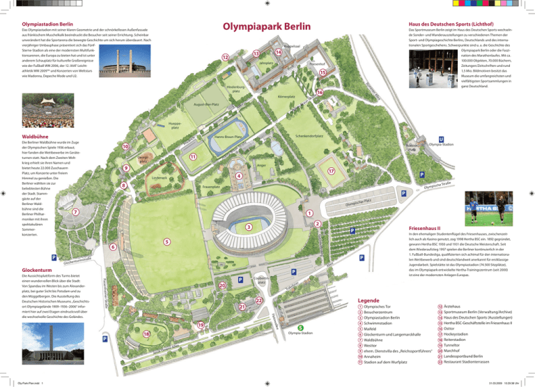 Olympiapark Berlin Olympiastadion Berlin Das Olympiastadion mit seiner klaren Geometrie und der schnörkellosen Außenfassade aus fränkischem Muschelkalk beeindruckt die Besucher seit seiner Errichtung. Scheinbar unverändert hat die Sportarena die bewegte Geschichte um sich herum überdauert. Nach vierjähriger Umbauphase präsentiert sich das FünfSterne-Stadion als eine der modernsten Multifunktionsarenen, die Europa zu bieten hat und ist unter anderem Schauplatz für kulturelle Großereignisse wie der Fußball WM 2006, der 12. IAAF Leichtathletik WM 2009TM und Konzerten von Weltstars wie Madonna, Depeche Mode und U2. 14 13 12 Jahnplatz Friesenhof 15 Ro m ed Fri 10 Ha nn r s- B au ß tr a n-S Anger 9 17 4 Lindeneck 8 P Olymp Frauenplatz ll e e n -A es e r i ch -Fri Olymp is latz ch e r P Frie d 1 2 Friesenhaus II P 5 sweg s tr aß e P Al le e P Passenheimer Str 20 P Coubertinplatz keh Tra ne Legende aße 21 1 Olympisches Tor w Flato a ll e e 18 S Olympia-Stadion J es we se - O ns - A ll e e In den ehemaligen Studentenflügel des Friesenhauses, zwischenzeitlich auch als Kasino genutzt, zog 1998 Hertha BSC ein. 1892 gegründet, gewann Hertha BSC 1930 und 1931 die Deutsche Meisterschaft. Seit dem Wiederaufstieg 1997 spielen die Berliner kontinuierlich in der 1. Fußball-Bundesliga, qualifizierten sich achtmal für den internationalen Wettbewerb und sind deutschlandweit anerkannt für erstklassige Jugendarbeit. Spielstätte ist das Olympiastadion (74.500 Sitzplätze), das im Olympiapark entwickelte Hertha-Trainingszentrum (seit 2000) ist eine der modernsten Anlagen Europas. r 22 19 P tr aß e ische S P 3 Die Aussichtsplattform des Turms bietet einen wundervollen Blick über die Stadt: Von Spandau im Westen bis zum Alexanderplatz, bei guter Sicht bis Potsdam und zu den Müggelbergen. Die Ausstellung des Deutschen Historischen Museums „Geschichtsort Olympiagelände 1909–1936–2006“ informiert hier auf zwei Etagen eindrucksvoll über die wechselvolle Geschichte des Geländes. Olympia-Stadion Rossiter Platz Glockenturm Oly-Park-Plan.indd 1 U e Gutsmuth nt u r m Schenkendorfplatz Hanns-Braun-Platz h- 11 Georgiiplatz 6 Glocke ric n- g Waldbühne we Hueppeplatz se r au le e hs e Fri -B 16 Al ut Ha s nn ße er ee t sm A ll Gu August-Bier-Platz tr a n-S i nt Körnerplatz P Das Sportmuseum Berlin zeigt im Haus des Deutschen Sports wechselnde Sonder- und Wanderausstellungen zu verschiedenen Themen der Sport- und Olympiageschichte Berlins, Deutschlands und des internationalen Sportgeschehens. Schwerpunkte sind u. a. die Geschichte des Olympiapark Berlin oder die Faszination des Marathonlaufes. Mit ca. 100.000 Objekten, 70.000 Büchern, Zeitungen/Zeitschriften und rund 1,5 Mio. Bildmotiven besitzt das Museum die umfangreichsten und vielfältigsten Sportsammlungen in ganz Deutschland. Kuppelsaal Hindenburgplatz Die Berliner Waldbühne wurde im Zuge der Olympischen Spiele 1936 erbaut; hier fanden die Wettbewerbe im Geräteturnen statt. Nach dem Zweiten Weltkrieg erhielt sie ihren Namen und bietet heute 22.000 Zuschauern Platz, um Konzerte unter freiem Himmel zu genießen. Die Berliner wählten sie zur beliebtesten Bühne der Stadt. Stammgäste auf der Berliner Waldbühne sind die 7 Berliner Philharmoniker mit ihren spektakulären Sommerkonzerten. Haus des Deutschen Sports (Lichthof) 12 Ärztehaus 2 Besucherzentrum 13 Sportmuseum Berlin (Verwaltung/Archive) 3 Olympiastadion Berlin 14 Haus des Deutschen Sports (Ausstellungen) 4 Schwimmstadion 15 Hertha BSC-Geschäftstelle im Friesenhaus II 5 Maifeld 16 Osttor 6 Glockenturm und Langemarckhalle 17 Hockeystadion 7 Waldbühne 18 Reiterstadion 8 Westtor 19 Tunneltor 9 ehem. Dienstvilla des „Reichssportführers“ 20 Marchhof 10 Annaheim 21 Landessportbund Berlin 11 Stadion auf dem Wurfplatz 22 Restaurant Stadionterrassen 31.03.2009 10:29:38 Uhr
