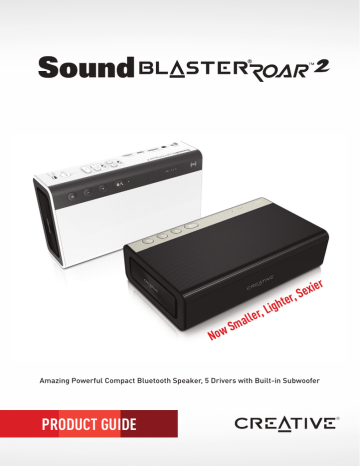 Now ier x e er, S t h , Lig r e l l Sma Amazing Powerful Compact Bluetooth Speaker, 5 Drivers with Built-in Subwoofer PRODUCT GUIDE ® CONTENTS THE SOUND BLASTER ROAR 2: AN OVERVIEW page 4 Get acquainted with the Sound Blaster Roar 2’s controls, connectors, and connectivity options. We’ve also included a brief description of the speaker’s architecture and the technologies found within it. EXPERIENCING THE SOUND BLASTER ROAR 2 page 13 page 21 Find out how the Sound Blaster Roar 2 brings your audio experience to a whole new level. APPENDIX: ENHANCING AUDIO PLAYBACK Learn how to easily enhance your audio with the Sound Blaster Control Panel. Now Smaller, Lighter, Sexier Read our Sound Blaster Roar 2 Story here Mind-Shattering Performance • Precision-Tuned Fidelity • ROAR & TeraBass Audio™ Power The original Classic Sound Blaster Roar was an amazing feat of audio engineering. It was truly a speaker that defied the laws of acoustic engineering. With the all new smaller, lighter, sexier Sound Blaster Roar 2, we have upped our game and taken the miniaturization to the next level. It is 20%* more compact than the Classic Roar, while still retaining its critically acclaimed killer audio signature with the same mind-blowing 5 speaker drivers, the same electrical design and the same battery capacity as the Classic Roar. This time, with a smaller volumetric size, our engineers have to work against the law of physics to tune the audio to be as mind-shattering and room-filling, like our Classic Roar. This incredible feat is achieved without compromising the same mind shattering room-filling audio delivered by the Classic Sound Blaster Roar. *Based on volumetric measurements THE SOUND BLASTER ROAR 2: AN OVERVIEW Architecture, Controls & Connectors Battery level indicator • Quick battery level check Controls • Raised tactile buttons for easy control Active high-excursion driver • Pumps out impressive bass • Widens soundstage NFC sensor • Just tap and play with any NFC- enabled device for wireless playback Dual 1.5” premium drivers • Compact, powerful high-frequency drivers • Provide for far-field high-frequency dispersion Machine-finished pulsating bass radiators • Side-firing from both sides • Enhances bass levels • Widens the soundstage T HE S OUN D B LA S T E R R OA R 2 P RODU CT GU I DE Acoustically optimized design • Rigid monocoque endoskeletal chassis • Fewer internal components reduces vibrations • Less energy wastage for better audio 4 Mic On / Mute • Flip the switch to turn on or mute the mic MicroSD card slot • Built-in WMA/MP3 player • Stores your voice recordings too USB port • Charge your mobile phones and devices! Previous track/folder Next track/folder • Press during playback to skip tracks • Press and hold during playback to skip folders USB Audio / Mass Storage mode switch • Toggles between USB Audio or Mass Storage mode DC input • Charge your Sound Blaster Roar 2 Aux-in jack Roar / TeraBass Button • Playback music from a portable device via audio cable • Toggles from TeraBass ON to TeraBass with ROAR ON, followed by OFF - TeraBass Intelligently boost bass when audio levels are low - ROAR Boost the loudness, depth and spaciousness for sheer audio power Micro-USB port • Connect to a PC/Mac for enhanced audio listening • Play audio and charge your Sound Blaster Roar 2 at the same time Voice recording • Simple accurate voice recording onto the microSD card Voice playback • Immediate playback of voice recordings Bedtime Mode • Audio playback that gradually fades out T HE S OUN D B LA S T E R R OA R 2 P RODU CT GU I DE Play / Pause • Fuss-free music playback control Random / Repeat All • Toggle the switch to play tracks on the microSD card in random order or to repeat all tracks in continuous order 5 THE SOUND BLASTER ROAR 2: AN OVERVIEW Architecture, Controls & Connectors (cont.) Multifunction button • Press and hold to enter Bluetooth pairing mode • Press once to answer incoming calls or end calls Volume Up/Down • Adjust the volume of your audio Power button • Press once to switch on or go into standby mode Recording indicator • Lights up when recording is ongoing T HE S OUN D B LA S T E R R OA R 2 P RODU CT GU I DE NFC sensor • Just tap to connect with any NFC-enabled device Battery level indicator • Lets you know the battery level of your Sound Blaster Roar 2 Internal microphone • For crystal clear voice communications 6 SPEAKER TECHNOLOGY The Sound Blaster Roar 2: Now Smaller, Sexier, Lighter The Sound Blaster Roar 2--although smaller, lighter, and sexier--is meticulously designed with the SAME ELECTRICAL DESIGN, the SAME FIVE SPEAKER DRIVERS, and the SAME BATTERY CAPACITY as the Classic Sound Blaster Roar. So what you get is the same mind-shattering room-filling audio and astounding battery life--but now with a smaller, lighter and sexier form factor. The Sound Blaster Roar 2 is a sound system designed for performance and portability. Though bantam-sized, the Sound Blaster Roar 2 promises to deliver a powerful, mind-blowing audio experience, and precision-tuned audio fidelity. The 5-driver system is packed into one sleek structure, and will redefine the home stereo space with its ability to powerfully reproduce the entire audio spectrum, all from a small booklet size. Beyond its impressive audio performance, it still has a whole lot more to offer – such as Bluetooth and NFC wireless technology, an integrated WMA/MP3 player, a recorder, a large dual-purpose battery that also charges your smartphone and a built-in microphone for calls and recording! T HE S OUN D B LA S T E R R OA R 2 P RODU CT GU I DE 7 THE SOUND BLASTER ROAR 2: AN OVERVIEW SPEAKER TECHNOLOGY (cont.) Bi-Amplified Design: Two Amps, Not One SINGLE AMP SYSTEM R L Amp S BI-AMP SYSTEM VS High Frequency Low/Mid Frequency One amplifier driving high, low and mid frequencies R Stereo Amp L Amp S High Frequency Low/Mid Frequency Two amplif