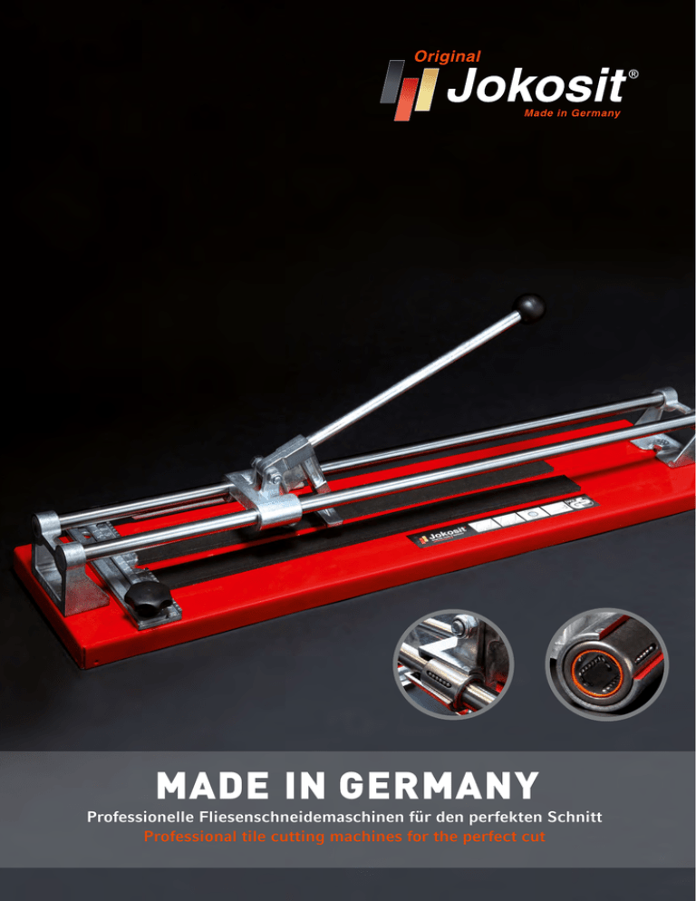 Made in Germany Professionelle Fliesenschneidemaschinen für den perfekten Schnitt Professional tile cutting machines for the perfect cut D rfinder der E Fliesenschneidemaschine Seit mehr als 70 Jahren ist der Name JOKOSIT untrennbar mit der Erfindung der Fliesenschneidemaschine verbunden. Als A-Lieferant des professionellen Fachhandels sowie des DIY-Werkzeughandels, und dem Qualitätssiegel »Made in Germany« hat sich die Marke Jokosit einen guten Namen gemacht. GB Inventor of the tile cutting machine The JOKOSIT name has been intrinsically asso- ciated with the invention of the tile cutting machine for more than 70 years. A top supplier for professional 2013 wurde JOKOSIT von der Wuppertaler Holtmann GmbH übernommen. Das international agierende Familienunternehmen hat sich auf die Entwicklung, specialists and the do-it-yourself industry, and a bearer of the “Made in Germany” quality seal, the JOKOSIT brand has made a good name for itself. Produktion und den Vertrieb von Fliesenschneidemaschinen, Werkzeugen und Zubehörteilen spezialisiert und nimmt heute im Marktsegment Fliesenverlegung mit eine führende Stellung ein. In 2013, JOKOSIT was taken over by the Wuppertalbased Holtmann GmbH. The family-owned enterprise, which trades all over the world, specialises in the development, production and sale of tile cutting machines, JOKOSIT Produkte werden als Premium Markenartikel im Produktportfolio der Holtmann GmbH weiter other tile cutting tools and accessories, and is now one of the leaders in the tiling market segment. geführt. JOKOSIT products have been continued as premium brand items in the Holtmann GmbH product portfolio. So fing alles an. How it all began. Heutiges Top-Produkt aus der Profi-Cut-Serie der Fliesenschneidemaschinen. A current top product from the Profi-Cut tile cutting machine range. 2 Jokosit® a brand of Holtmann gmbH WErkzeugfabrik D Qualität – Made in Germany JOKOSIT Markenprodukte sind »Made in Ger- many«. Wir verwenden ausschließlich hochwertige Materialien und legen Wert auf eine sorgfältige Verarbeitung unserer Produkte. Dies ermöglichen wir durch ergonomische Arbeitsplätze, neueste Fertigungstechnologie und ein durchdachtes Qualitätsmanagement. Unsere erfahrenen Mitarbeiter kennen jedes Detail unserer Fliesenschneidemaschinen und entwickeln sie permanent weiter. So sind Sie mit unseren Qualitätsprodukten immer auf dem neuesten Stand der Technik. GB Quality – Made in Germany JOKOSIT products are “Made in Germany”. We use only high-quality materials for our products and place a large amount of emphasis on careful craftsmanship, which we achieve through ergonomically designed workstations, state-of-the-art manufacturing technology and well-thought-out quality management. _ Unsere Philosophie: Our experienced employees know our tile cutting ma- Wir möchten, dass Sie als unser Kunde mit chines down to the last detail and are constantly work- JOKOSIT Produkten besser abschneiden. Daran ar- ing to develop them further – which is how we ensure beiten wir Tag für Tag. that you are always investing in the best equipment available when you invest in our products. _ OUR PHILOSOPHY: As our customer, we want you to be able to achieve better results with JOKOSIT products. That is what we’re working on every day. 3 D Wir agieren international Langjährige Erfahrung, überzeugendes Fach- wissen, hohe Innovationskraft und Leistungsfähigkeit sowie unsere Kundenorientiertheit haben JOKOSIT zu einer der führenden Marken im Bereich Fliesenlegerwerkzeuge gemacht. In vielen Ländern der Welt sind wir mit persönlichen Ansprechpartnern vertreten. Durch die Übernahme der Holtmann GmbH wird das internationale Geschäft zukünftig noch stärker ausgebaut. GB We trade all over the world Many years of experience, excellent technical knowledge, a high capacity for innovation and performance, and our ability to align our products to our customers’ needs have made JOKOSIT one of the world’s leading manufacturers of tilers’ tools. We are represented by personal contacts in many countries around the world, and the takeover by Holtmann GmbH means our international trade will become even stronger in future. heute und zukünftig – i n t e r n a t i o n a l e Ge s c h ä f t e d e r H o lt m a n n G m b h - De u t s c h l a n d now and in the future – i n t e r n a t i o n a l e x pa n s i o n o f t he h o lt m a n n G m b H - g e r m a n y 4 Jokosit® a brand of Holtmann gmbH WErkzeugfabrik D Mehr Erfolg am Point-of-Sale Viele Kaufentscheidungen fallen nachweis- lich am Point-of-Sale, das heißt, vor dem Regal. Zu diesem Zweck entwickeln und produzieren wir professionell gestaltete, aufmerksamkeitsstarke Verpackungen. Sie unterstreichen die Qualität unserer Produkte und unterstützen Sie darin, Ihren Kunden unsere JOKOSIT Produkte verkaufsfördernd und Gewinn bringend zu präsentieren. Zudem erleichtern Tragegriffe an den Verpackungen das Handling. GB ore success at the M point of sale It has been proven that many purchase decisions are made at the point of sale, i.e. in front of the shelf. With this in mind, we develop and produce eye-catching packaging designed by professionals. It highlights the quality of our products and will help you to present our JOKOSIT products to your customers in a manner that promotes sales and gives you a profit. The handles on the packaging also make the products easier to hold and carry. 5 Zu unseren bewährten Fliesenschneidemaschinen “Made in Germany” aus Eigenproduktion, besteht auch die Möglichkeit, sämtliches Zubehör in ansprechendem Jokosit Verpackungsdesign zu erhalten. Dies können wir durch das breit gefächerte Fliesenleger - Zubehörsortiment der Holtmann GmbH realisieren. Bitte sprechen Sie uns an, gerne erstellen wir Ihnen ein verkaufsförderndes Werkzeugwandkonzept. In addition to the proven “Made in Germany” tile cutting machines which are produced on our own premises, we can also supply you with
