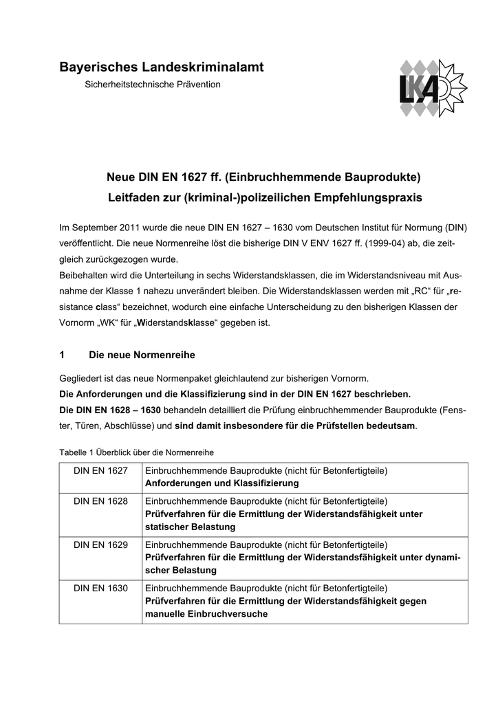 Bayerisches Landeskriminalamt Sicherheitstechnische Prävention Neue DIN EN 1627 ff. (Einbruchhemmende Bauprodukte) Leitfaden zur (kriminal-)polizeilichen Empfehlungspraxis Im September 2011 wurde die neue DIN EN 1627 – 1630 vom Deutschen Institut für Normung (DIN) veröffentlicht. Die neue Normenreihe löst die bisherige DIN V ENV 1627 ff. (1999-04) ab, die zeitgleich zurückgezogen wurde. Beibehalten wird die Unterteilung in sechs Widerstandsklassen, die im Widerstandsniveau mit Ausnahme der Klasse 1 nahezu unverändert bleiben. Die Widerstandsklassen werden mit „RC“ für „resistance class“ bezeichnet, wodurch eine einfache Unterscheidung zu den bisherigen Klassen der Vornorm „WK“ für „Widerstandsklasse“ gegeben ist. 1 Die neue Normenreihe Gegliedert ist das neue Normenpaket gleichlautend zur bisherigen Vornorm. Die Anforderungen und die Klassifizierung sind in der DIN EN 1627 beschrieben. Die DIN EN 1628 – 1630 behandeln detailliert die Prüfung einbruchhemmender Bauprodukte (Fenster, Türen, Abschlüsse) und sind damit insbesondere für die Prüfstellen bedeutsam. Tabelle 1 Überblick über die Normenreihe DIN EN 1627 Einbruchhemmende Bauprodukte (nicht für Betonfertigteile) Anforderungen und Klassifizierung DIN EN 1628 Einbruchhemmende Bauprodukte (nicht für Betonfertigteile) Prüfverfahren für die Ermittlung der Widerstandsfähigkeit unter statischer Belastung DIN EN 1629 Einbruchhemmende Bauprodukte (nicht für Betonfertigteile) Prüfverfahren für die Ermittlung der Widerstandsfähigkeit unter dynamischer Belastung DIN EN 1630 Einbruchhemmende Bauprodukte (nicht für Betonfertigteile) Prüfverfahren für die Ermittlung der Widerstandsfähigkeit gegen manuelle Einbruchversuche Seite 2 Die überarbeiteten Normen schließen neben Vorhangfassaden nun auch Gitterelemente mit ein. Für Gitter und zugängliche Bänder wurde der Prüfwerkzeugsatz u.a. um Sägen ergänzt. Die DIN 18106 (Einbruchhemmende Gitter) wurde zurückgezogen. Tore werden von den neuen Normen ausgeschlossen. 2 Die Widerstandsklassen 2.1 Korrelation Prüfzeugnisse nach DIN V ENV 1627 und DIN 18106 können über eine Korrelationstabelle (= Vergleichstabelle) weiter verwendet werden. Noch ältere Prüfzeugnisse nach DIN V 18054 (Fenster) und DIN V 18103 (Türen) können zukünftig nicht mehr zugeordnet werden. Tabelle 2 Korrelationstabelle mit Zuordnung der Widerstandsklassen gemäß Nationalem Vorwort der DIN EN 1627 (Tabelle NA.10) Widerstandsklasse des Bauteils nach DIN EN 1627: 2011 Widerstandsklasse des Bauteils nach DIN V ENV 1627: 1999 Widerstandsklasse nach DIN 18106: 2003-09 (Gitter) RC 1 N ------1) ------1) RC 2 N WK 2 2) ------ RC 2 WK 2 WK 2 RC 3 WK 3 WK 3 RC 4 WK 4 WK 4 RC 5 WK 5 WK 5 RC 6 WK 6 3) WK 6 3) 1) Keine Zuordnung möglich, da Prüfanforderungen erhöht wurden; 2) Die Widerstandsklasse WK 2 ist grundsätzlich für die Korrelation der Widerstandsklasse RC 2 N geeignet; die Verglasung kann jedoch frei vereinbart werden; 3) Zusatzprüfung mit dem Spalthammer nach EN 1630:2011. 2.2 Glaszuordnung Bei der Erarbeitung der neuen Normen war zunächst lediglich für die Prüfung eine Zuordnung von angriffhemmenden Gläsern vorgesehen. Der Anwender hätte damit die Möglichkeit gehabt, auch höhere Sicherheitsklassen nur mit Standardfensterglas auszuschreiben. Mit dem Vorschlag definierter Mindestanforderungen an die Verglasungen konnte die Zustimmung der kritischen Länder zur Norm erhöht werden, gleichzeitig wird für die Anwendung der Normen in der Praxis eine Fehlerquelle vermieden. (Stand: 2011-09-19) Seite 3 Tabelle 3 Mindestanforderungen an die Verglasung (aus DIN EN 1627 Abschnitt 5) Widerstandsklasse Widerstandsklasse der Verglasung gemäß EN 356 RC 1 N Keine Anforderungen RC 2 N Keine Anforderungen RC 2 P4A RC 3 P5A RC 4 P6B RC 5 P7B RC 6 P8B Hinweis: Beim Einsatz von Verglasungen unterhalb der Klasse P 4 A müssen abschließbare Fenstergriffe eingesetzt werden. Wie in der bisherigen Vornorm bei WK 1 werden bei der neuen Widerstandsklasse RC 1 N keine Anforderungen an die Verglasung gestellt. Neu ist die Widerstandsklasse RC 2 N, die ebenfalls lediglich mit (Standard-)Fensterglas ausgeführt werden kann. Gemäß polizeilicher Empfehlungspraxis sollte in der Klasse RC 3, wie auch in der Vergangenheit bei der Widerstandsklasse WK 3, eine Verglasung der Klasse P 6 B zugeordnet werden, die im Widerstandsvermögen angemessen an die Rahmenkonstruktion ist. 2.3 Beschreibung der Widerstandsklassen Wie bisher steigen die Widerstandsklassen von geringem zum hohen Widerstandsvermögen (Widerstandsklasse RC 1 N – RC 6) an. Widerstandsklasse RC 1 N Neu ist ein maximal 3 Minuten langer, zerstörungsfreier Manipulationstest mit Kleinwerkzeug zur Demontage von außen abschraubbarer Komponenten als Vorbereitung der weiteren Prüfungen. Die Widerstandsklasse RC 1 N wird durch einen „additional loading test“ aufgewertet und kann damit besser abbilden, was bei einem Einbruch passiert. Mit Gurten zwischen Flügel und Rahmen oder Haken wird dabei der Flügel aus der Verriegelung bzw. ein Türflügel auf die Bandseite gezogen, bevor die statische Prüfbelastung aufgebracht wird. Damit lässt sich gut abbilden, was auch bei einem Werkzeugangriff passiert; es wird sowohl der Flügel verschoben, soweit es die Falzluft zulässt, als auch eine Druckbelastung von außen nach innen aufgebracht. Es müssen deshalb entweder hintergreifende Verriegelungen (z.B. Pilzzapfen) oder Riegel eingesetzt werden, die auch nach dem Verschieben des Flügels noch ausreichend weit in die Schließbleche eingreifen. (Stand: 2011-09-19) Seite 4 Der Normungsausschuss konnte sich am Prüfstand (am Institut für Fenstertechnik, Rosenheim) ein Bild davon machen, dass die Prüfung der Klasse RC 1 N in den Anforderungen deutlich gestiegen ist (gegenüber WK 1 gemäß DIN V ENV 1627). Bild 1: Statische Prüfung mit zusätzlichen, über Gurte eingebrachte Belastungen (additional loading test) Bild: ift Rosenheim Stoßkör