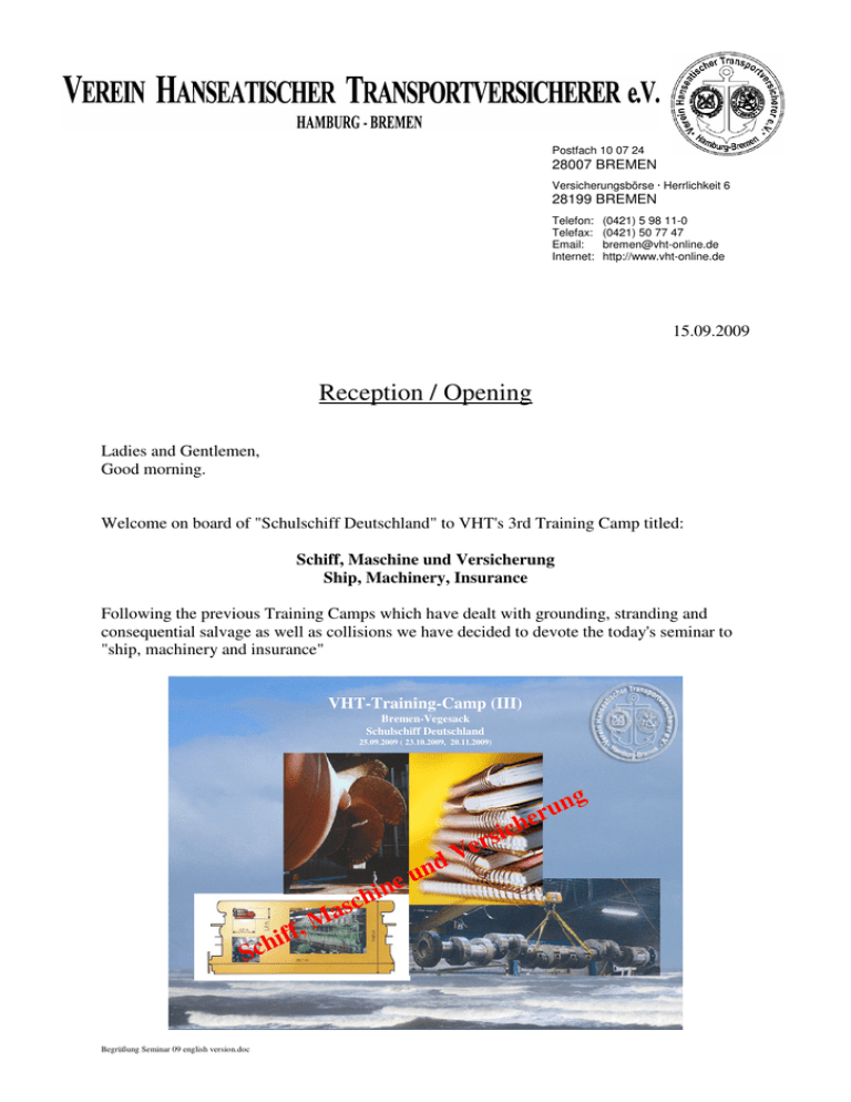 Postfach 10 07 24 28007 BREMEN Versicherungsbörse · Herrlichkeit 6 28199 BREMEN Telefon: Telefax: Email: Internet: (0421) 5 98 11-0 (0421) 50 77 47 [email protected] http://www.vht-online.de 15.09.2009 Reception / Opening Ladies and Gentlemen, Good morning. Welcome on board of "Schulschiff Deutschland" to VHT's 3rd Training Camp titled: Schiff, Maschine und Versicherung Ship, Machinery, Insurance Following the previous Training Camps which have dealt with grounding, stranding and consequential salvage as well as collisions we have decided to devote the today's seminar to "ship, machinery and insurance" VHT-Training-Camp (III) Bremen-Vegesack Schulschiff Deutschland 25.09.2009 ( 23.10.2009, 20.11.2009) f, M f i Sch Begrüßung Seminar 09 english version.doc nd u ine h c as V g n u her c i ers Seite 2 As a starter I have prepared a slide which shows the frequency of hull-, machinery damage since 2001. Kasko- / Maschinenschäden 3000 400 2500 300 2000 250 1500 200 150 1000 Anzahl Kasko-Objekte Anzahl der Schäden 350 100 500 50 0 0 2001 2002 2003 2004 2005 2006 2007 2008 Kalenderjahr Schäden am Kasko Polynomisch (Seekasko-Objekte) Maschinenschäden Polynomisch (Maschinenschäden) Seekasko-Objekte Polynomisch (Schäden am Kasko) Folie Nr.: 1 On this slide one very clearly can identify: 1) 2) 3) The number of insured objects handled by VHT has risen since 2001 but the increase is stagnating as of 2006 (beige beams). After a drop in 2005 we see the number of hull damages (blue beams) rising again, except for 2008 the rise in number appear to correspond with the development of the number of insured objects. Machinery damages (red beams) show a different development, although the number of insured objects is stagnating as of 2006, the number of machinery claims is increasing. Seite 3 If one however looks at the development of machinery damages in isolation, then the following slide has to be considered: Maschinenschäden 140 120 Anzahl 100 80 60 40 20 0 1996 1997 1998 1999 2000 2001 2002 2003 2004 2005 2006 2007 2008 2009, 2. Quartal Kalenderjahr Hauptmaschine Hilfsmaschinen Schraube / Welle M aschine sonstige Folie 2 No question, damages to the main engine have the highest frequency. The following graph shows once again the development of machinery damages handled by VHT in relation to hull damages over a period of 91/2 years, however on a percentage basis in relation to all damages (100%): Machinery damage % 2000 53,27% 2001 47,99% 2002 39,95% 2003 39,17% 2004 36,92% 2005 40,88% 2006 42,64% 2007 43,23% 2008 43,86% 30.06.2009 44,20% Folie 3 Hull damage % 46,73% 52,01% 60,05% 60,83% 63,08% 59,12% 57,26% 56,77% 56,14% 55,80% Seite 4 Judged on a percentage basis only one could say there is no specific reason to get exited figures have been worse. Right so, however up to now cost development has not been considered. 1800 35.000.000 € 1600 30.000.000 € 1400 25.000.000 € 1200 20.000.000 € 1000 800 15.000.000 € 600 10.000.000 € 400 Kosten der Maschinenschäden Anzahl der Schäden Kasko- / Maschinenschäden 5.000.000 € 200 0 0€ 2000 2001 2002 2003 2004 2005 2006 2007 2008 Kalenderjahr Anzahl der Kaskoschäden Anzahl der Maschinenschäden Anzahl der Kaskoobjekte Kosten der Maschinenschäden Polynomisch (Anzahl der Kaskoobjekte) Polynomisch (Kosten der Maschinenschäden) Polynomisch (Anzahl der Maschinenschäden) Folie 4 Green is the trend of the increase of all hull and machinery objects handled by the VHT, red is the number of machinery damages and yellow shows the trend of cost development with machinery damages. As of 2004 a change is notable, however there is no dramatic change, neither with the number of hull and machinery objects nor with the number of machinery damages but the costs for settling machinery damages have clearly risen (yellow) and most remarkably so in 2008. Insurers and ship owners are likewise not amused. Where do the causes lie? Is it the result of lower qualification of technical crewmembers, inadequate technical inspection by owners and/or the aftermath of a till recent booming shipbuilding market and the strong demand for ship engines? Supposedly it is a bit of all, not to forget a booming market combined with strong demand will not lower but rather increase prices. More often than not the quality of products will behave inversely proportional in such times. Seite 5 For us this development was and is important enough to pick it up as a central theme. We would like to explain to you the emergence of the today's machinery damage insurance cover according to ADS (General German Marine Insurance conditions) and the DTV clauses. This item of the program will be dealt with by Mr. H.C. Enge of Messrs. Lampe & Schwartze and/or Dr. D. Schwampe of Messrs. Dabelstein & Passehl subject to availability. Messrs. Lampe & Schwartze leads most of the Hull and Machinery policies in the Bremen market and has substantial experience in this segment of marine insurance, and as you will know, Dabelstein & Passehl is one of the leading law firms dealing with marine insurance. Thereafter Dipl.-Ing K. Wetzel will tell us about the classical engine damage, damages caused by wear and tear, and damages caused by latent defect. Has a damage occurred, a proper damage assessment in accordance with the policy conditions is required and how this is done is the topic of Capt. D. Brand's lecture. Once an insured damage has been surveyed, assessed and repaired, settlement with underwriters is due. Dipl. - Ing. B. Röder will explain to us the standing orders for certifying damage-related costs under consideration of standard policy conditions. Concluding we will hear a lecture by our Dipl.-Ing.'s H. Förster and H. Jentz in respect of loss prevention. Especially he will try to incorporate technical expertise and experience made by VHT in his statement I do hope, we have succeeded in putting together an informative and interesting program for today. . The seminar Ship, Machinery, Insurance conti
