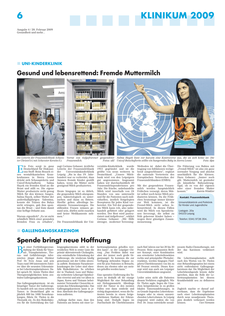 6 KLINIKUM 2009 Ausgabe 4 / 20. Februar 2009 Gesundheit und mehr... UNI-KINDERKLINIK Gesund und lebensrettend: Fremde Muttermilch Die Leiterin der Frauenmilchbank Schwes- Vorrat von tiefgefrorener gespendeter ter Christel (r.) mit Schwester Kerstin (l.). Frauenmilch. Fotos: ukl in Foto sorgt in ganz Deutschland für Diskussions-Stoff: Beim Besuch eines westafrikanischen Krankenhauses in Sierra Leone drückt sich Schauspielerin und Unicef-Botschafterin Salma Hayek ein fremdes Kind an die Brust und stillt es. Die eigene Mutter produzierte nicht genug Milch für den kleinen Jungen. Salma Hayek, selber Mutter der anderthalbjährigen Valentina, konnte die Tränen des Babys nicht ertragen, gab ihm spontan die Brust – und löste damit eine heftige Debatte aus. E Warum eigentlich? „Es ist nicht schädlich Milch einer gesunden fremden Frau zu erhalten”, sagt Corinna Gebauer, ärztliche Leiterin der Frauenmilchbank der Universitätskinderklinik Leipzig. „Bis in das 19. Jahrhundert war es verbreitet, dass Ammen fremde Kinder gestillt haben, wenn die Mütter nicht genügend Milch produzierten. Heute hingegen ist es üblich, die gespendete Milch abzupumpen, bakteriologisch zu untersuchen und dann zu füttern. Hierfür gelten allerdings bestimmte Voraussetzungen. Die stillenden Frauen müssen gesund sein, dürfen nicht rauchen und keine Medikamente nehmen.“ Die Frauenmilchbank der Uni- Salma Hayek löste vor kurzem eine Kontroverse aus, die an sich keine ist: Die Unicef-Botschafterin stillte ein hungerndes Baby in Sierra Leone. Foto: dpa versitäts-Kinderklinik wurde 1951 gegründet und ist die größte von neun weiteren in Deutschland. „Unsere Milchbank wird von den Leipzigern gut angenommen. Insgesamt haben wir durchschnittlich 40 Frauenmilchspenderinnen pro Jahr. Die frische, unbehandelte Milch wird innerhalb von 24 Stunden von uns untersucht und für die Patienten nach individuellen, ärztlich festgelegten Rezepturen für jedes Kind vorbereitet. Ein Teil der gespendeten Milch kann roh, also unbehandelt gefüttert oder gelagert werden. Der Rest wird pasteurisiert und tiefgefroren“, erklärt Corinna Gebauer. „Mit Hilfe strenger, moderner Screening- Methoden ist dabei die Übertragung von Infektionen weitgehend ausgeschlossen“, ergänzt die nationale Vertreterin des Europäischen Netzwerkes der Frauenmilchbanken (EMBA). Mit der gespendeten Frauenmilch werden hauptsächlich Frühchen versorgt, deren Mütter selber noch keine Milch produzieren können. Da die Frühchen heutzutage immer kleiner zur Welt kommen, ist die Fremd-Milch nicht selten lebensrettend. In diesen Fällen wird die Milch von Spenderinnen bevorzugt, die selbst zu früh geborene Kinder haben – wegen ihrer günstigen Zusammensetzung. Die Fütterung von Babies mit „Fremd-Milch“ ist also ein ganz normaler Vorgang und absolut unschädlich für die Kleinen. Dazu Gebauer: „Immer noch gilt: Muttermilch ist gesünder als künstliche Babynahrung. Egal, ob es von der eigenen oder einer fremden Mutter kommt.” Katrin Winkler Kontakt: Frauenmilchbank Universitätsklinik und Poliklinik für Kinder und Jugendliche Liebigstr. 20a 04103 Leipzig Telefon: 0341 9726 354. GALLENGANGSKARZINOM Spende bringt neue Hoffnung ei einer Fortbildungsveranstaltung der Klinik für Visceral-, Transplantations-, Thorax- und Gefäßchirurgie informierten jüngst deren Direktor Prof. Dr. Sven Jonas und sein Team rund 100 interessierte Zuhörer über die neuesten Erkenntnisse bei Lebertransplantationen. Dabei sprach Dr. Armin Thelen über Therapiemöglichkeiten beim zentralen Gallengangskarzinom. B Das Gallengangskarzinom ist ein bösartiger Tumor der Gallenwege. Es handelt sich um einen seltenen Tumor; in Deutschland gibt es jährlich 800 bis 1000 Neuerkrankungen, führte Dr. Thelen in die Thematik ein. Zu den Risikofaktoren für die Entwicklung des Gal- lengangskarzinoms zählt in der westlichen Welt in erster Linie die primär sklerosierende Cholangitis, eine entzündliche Erkrankung der Gallenwege, die wiederum häufig gemeinsam mit der Colitis ulcerosa auftritt. Bestimmte Parasitenerkrankungen der Leber sind ebenfalls Risikofaktoren. So erhöhen der in Thailand, Laos und Malaysia verbreitete Leberegel Opisthorchis viverrini und sein vor allem in Japan, Korea und Vietnam beheimateter Verwandter Clonorchis sinensis das Erkrankungsrisiko. Das Gallengangskarzinom kann in jedem Abschnitt des Gallengangsystems auftreten. „Anfangs dachte man, dass den Patienten am besten mit einer Le- bertransplantation geholfen werden kann“, so der Leipziger Chirurg. „Das Problem dabei war aber der immer noch große Organmangel. So kommen die zur Verfügung stehenden Organe zuerst für jene Patienten in Betracht, denen am ehesten oder am meisten geholfen werden kann.“ Eine operative Entfernung des Tumors ist deshalb oft die einzige Möglichkeit für eine Behandlung mit Heilungsaussicht. Allerdings wird der Tumor in den meisten Fällen erst dann entdeckt und richtig diagnostiziert, wenn die Patienten bereits in einem fortgeschrittenen Stadium der Erkrankung sind. Deshalb liegen im Durchschnitt die Überlebensraten nach fünf Jahren nur bei 20 bis 30 Prozent. Beim sogenannten Berliner Konzept, einer Kombination aus erweiterter Leberteilresektion rechts und prinzipieller Pfortaderresektion, werden hingegen Fünfjahres-Überlebensraten von bis zu 60 Prozent erreicht. Dieses Konzept wird nun auch am Leipziger Universitätsklinikum umgesetzt. Leider seien nicht alle Patienten diesem Verfahren zugänglich. Wie Dr. Thelen sagte, liegen die Ursachen beispielsweise in zu großen lokalen Tumorausdehnungen, in zu Grunde liegenden Lebererkrankungen oder in einem unzureichenden Lebervolumen. In Leipzig eingesetzt wird zudem die von Prof. Dr. Jonas entwickelte neoad- juvante Radio-Chemotherapie, mit der das Karzinom verkleinert wird. Die Lebertransplantation stellt nach den Worten von Dr. Thelen eine Behandlungsoption bei einem nicht entfernbaren Gallengangskarzinom dar