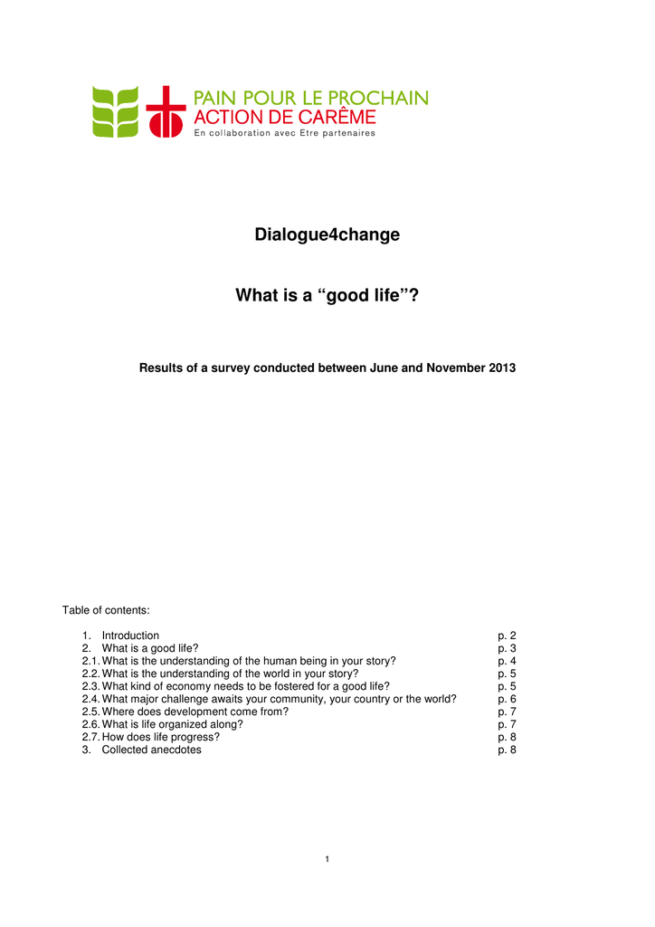 Dialogue4change What is a “good life”? Results of a survey conducted between June and November 2013 Table of contents: 1. Introduction 2. What is a good life? 2.1. What is the understanding of the human being in your story? 2.2. What is the understanding of the world in your story? 2.3. What kind of economy needs to be fostered for a good life? 2.4. What major challenge awaits your community, your country or the world? 2.5. Where does development come from? 2.6. What is life organized along? 2.7. How does life progress? 3. Collected anecdotes 1 p. 2 p. 3 p. 4 p. 5 p. 5 p. 6 p. 7 p. 7 p. 8 p. 8 1. Introduction In the past months, Bread for all asked 60 members of different Swiss development agencies to tell stories illustrating the "good life" they are seeking for -either personally or through their work. This question allowed to address the signification of their engagement in development cooperation. Our actions are indeed informed by cultural assumptions or narratives that often remain implicit. Making them visible helps to confront and question one’s habits and patterns of behavior. Becoming aware of such patterns is especially relevant for people working in different cultural contexts. Methodology For this survey Bread for all was inspired by the sensemaker methodology developed by Cognitive Edge (www.cognitive-edge.com). Through a collection of short anecdotes, the methodology allows to visualize the assumptions informing people's actions. The survey was conducted as a pilot test with a very homogenous sample of participants mostly working in Swiss faith-based organizations. Participants were first asked to share a personal experience by telling an anecdote about what they would describe as a “good life”. In a second step, participants were invited to signify their story in relation with seven questions. They had to answer those questions by situating themselves between three possible options within a triangle. First lessons learnt • This first experience showed that story telling is a very powerful way indeed to capture peoples’ motivation and vision. • The questions should be formulated in a simpler way. • The main challenge is to formulate the three options in relation to which the participants are asked to situate themselves in the triangles. These need to really offer three different choices rather than different variations of a single option – as it is the case of some of the examples shown below. Moreover, the options need to be formulated in a way that the can be interpreted in the same way in different cultures. Words or images used in the examples below do not imply the same associations in different contexts. • The context in which participants are interviewed influences their answers. People might tell different stories depending if they are interviewed e.g. at work, on the street or after a Church service. • Conducting a survey on a much larger scale -with more diversity of respondents - and in different contexts would offer interesting comparisons. Does it make sense to you? Here are anyway the results of the first pilot survey. The idea of sensemaker is to ask the participants themselves to interpret and analyze the meaning of their story - instead of letting someone else do it in their place. So, what is your opinion? Please share your views and interpretations with us! 2 2. What is a good life? Dignity. Independence. Education.Self-esteem. These values emerged out of the collected anecdotes as the most often mentioned. They seem to play a key role for a good life independently of material conditions. Are those values however universal or are they to be understood differently in different contexts? Do these values mean the same thing in different contexts, for example, Switzerland or Bolivia? It is to be assumed that this picture is heavily group specific (i.e. Swiss NGO workers) and therefore interesting for comparison. What is a good live for a banker or a farmer in Switzerland or a farmer in the global South? Related anecdote: (…) Pendant 5 ans, 30-40% des femmes ont interrompu le programme et quitté le dispensaire. Nous en avons étudié les raisons: les maris sont venus protester devant le dispensaire et ont fait des menaces. Ils sont seuls à la maison et personne ne s'occupe des enfants. Ils ont menacé de divorcer. Les femmes qui ont quitté le programme nous ont dit qu'il est plus acceptable pour elle qu'un enfant de 5 ans meure que les conséquences d'un divorce pour elles. Le programme avait été développé de manière participative et nous avions imaginé que les objectifs de santé materno-infantile impliquaient un langage moral commun à tous. Nous avions pensé que c'était une valeur universelle (…). Il faut faire attention en définissant une bonne vie. On peut se tromper même quand on pense que c'est impossible. La bonne vie est le résultat d'un processus qui peut différer d'un contexte à l'autre. 3 2.1. What is the understanding of the human being in your story? The human seeks his place in society The human seeks material comfort for himself The human seeks a meaning to his life The results show two main clusters of opinion; one representing a human being characterized by his place in society and material comfort and another pole illustrating a human being driven by his place in society and the quest for meaning in life. A small cluster defines the human being as driven by the quest for meaning. It is interesting to note that this cluster is mostly composed of active Church members interviewed at the WCC General Assembly in Busan, The two other clusters however represent the opinion of people from Swiss faith- based organizations. Are there however not precisely a lot of people seeking place in society by exhibiting luxury goods -like cars? This leads to the question if the three proposed options are contrasting, complementary or interlinked? Related anecdotes: « Mon histoire est celle d’une personne de condit