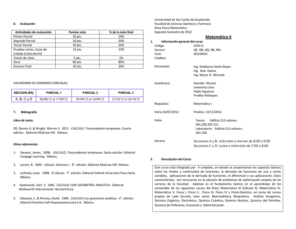 6. Evaluación Actividades de evaluación Punteo neto Primer Parcial 20 pts. Segundo Parcial 20 pts. Tercer Parcial 20 pts. Pruebas cortas, hojas de 15 pts. trabajo (Laboratorio) Tareas de clase 5 pts. Zona 80 pts. Examen Final 20 pts. CALENDARIO DE EXAMENES PARCIALES: % de la nota final 20% 20% 20% 15% Universidad de San Carlos de Guatemala Facultad de Ciencias Químicas y Farmacia Área Físico‐Matemática Segundo Semestre de 2012 Matemática II 1. 5% 80% 20% SECCION (ES) PARCIAL 1 PARCIAL 2 PARCIAL 3 A, B, C y D 06/08/12 al 17/08/12 03/09/12 al 14/09/12 15/10/12 al 26/10/12 7. Bibliografía Libro de texto: Zill, Dennis G. & Wright, Warren S. 2011. CALCULO, Trascendentes tempranas. Cuarta edición. Editorial McGraw‐Hill. México. Otras referencias: 1. Stewart, James. 2008. CALCULO, Trascendentes tempranas. Sexta edición. Editorial Cengage Learning. México. a 2. Larson, R. 2005. Cálculo. Volumen I. 8 . edición. Editorial McGraw‐Hill. México. 3. Leithold, Louis. 1998. El cálculo. 7a. edición. Editorial Oxford University Press‐Harla. México. 4. Swokowski, Earl. V. 1982. CÁLCULO CON GEOMETRÍA ANALÍTICA. Editorial Wadsworth Internacional Iberoamérica. 5. Edwards, C. & Penney, David. 1996. CALCULO con geometría analítica. 4a. edición. Editorial Prentice‐Hall Hispanoamericana S.A. México. Información general del curso Código 020111 Carrera QF, QB, QQ, BB, NN. Ciclo SEGUNDO Créditos Docente(s) Ing. Waldemar Nufio Reyes Ing. Noè Galvez Ing. Mynor G. Miranda Auxiliar(es) Haroldo Álvarez Juventino Lima Pablo Figueroa Freddy Velásquez Requisitos Matemática I Inicia:16/07/2012 Finaliza: 13/11/2012 Aulas Teoría: Edificio S12‐salones: 201,205,207,211 Laboratorio: Edificio S12‐salones: 201‐205 Horario Secciones A y B: miércoles a viernes de 8:00 a 9:00 Secciones C y D: Lunes a miércoles de 7:00 a 8:00 2. Descripción del Curso Este curso está integrado por 4 unidades, en donde se proporcionan los aspectos básicos sobre los límites y continuidad de funciones, la derivada de funciones de una y varias variables, aplicaciones de la derivada de funciones, el diferencial y sus aplicaciones. Estos conocimientos son necesarios en la solución de problemas de optimización propios de las carreras de la Facultad. Además es el fundamento teórico en el aprendizaje de los contenidos de los siguientes cursos del Área: Matemática III (Cálculo II), Matemática IV, Matemática V, Física I, Física II, Física III, Física IV y Físico‐Química; así como de cursos propios de cada Escuela, tales como: Bioestadística, Bioquímica, Análisis Inorgánico, Química Orgánica, Electrónica, Química Cuántica, Química Nuclear, Química del Petróleo, Química de Polímeros, Economía y Administración. 3. 4. 6. Objetivos generales: 3.1. Estar en la capacidad de utilizar los teoremas de la derivada para determinar la derivada de funciones polinomiales, racionales trascedentes, funciones compuestas, funciones implícitas y derivadas de funciones de varias variables. 3.2. Estar en la capacidad de elaborar los modelos matemáticos (ecuaciones diferenciales elementales) de problemas que involucran derivadas de funciones de una y varias variables. Programación de actividades Académicas Unidades Contenido 1.FUNCIONES LIMITES DE FUNCIONES 2.LA DERIVADA ‐ Funciones polinomiales, racionales, exponenciales, logarítmicas y trigonométricas. ‐Noción intuitiva de limite ‐Definición de limite ‐Teoremas acerca de limites ‐Limites en los que interviene el infinito ‐Continuidad en un numero ‐Razón de Cambio de una función ‐La derivada y sus interpretaciones: razón de cambio instantáneo, pendiente de una recta tangente a una curva y como el límite de una función creciente incremental. ‐Teoremas sobre las derivadas de funciones: Reglas de la potencia, de la suma, del producto y del cociente. ‐Derivadas de funciones trascendentes: logarítmicas, exponenciales, trigonométricas y trigonométricas inversas. ‐Diferenciales y aplicaciones ‐Regla de la cadena de diferenciación ‐Diferenciación implícita ‐Derivadas de orden superior 3.APLICACIONES DE LA DERIVADA ‐ Movimiento rectilíneo y la derivada. ‐Razones de cambio relacionadas ‐Gráfica de funciones: primera y segunda derivada ‐Extremos de funciones ‐Optimización ‐Aplicaciones de la derivada en economía. ‐Regla de L’Hopital 4.CALUCULO DIFERENCIAL DE FUNCIONES DE VARIAS VARIABLES ‐ Funciones de dos o más variables ‐Derivadas parciales ‐Diferencial total ‐Diferenciales exactas ‐Regla de la cadena ‐Extremos de funciones de dos variables ‐Método de MINIMOS CUADRADOS ‐Multiplicadores de LaGrange Objetivos específicos: 4.1. Aplicar los conocimientos de las derivadas de funciones de una y varias variables en la determinación de la solución óptima de problemas relacionados con fenómenos físicos, químicos, biológicos, y económicos y del uso sustentable de los recursos naturales. 4.2. Estar en la capacidad de utilizar los paquetes de computación específicos y hojas electrónicas en la solución optima de problemas que involucran aplicaciones de las derivadas de funciones de una y varias variables. 5. Metodología Método Inductivo‐Deductivo Análisis y Discusión de Casos Planteados Estudio de Caso: análisis y discusión. Práctica asistida con ayudante de cátedra. Investigación documental. Actividades a realizar Calendarización Modalidad de de actividades evaluación PARA CADA UNIDAD: ‐Clase magistral ‐Hojas de trabajo ‐Laboratorios participativos (resolución de dudas) Investigaciones documentales PARA CADA PARA CADA UNIDAD: UNIDAD: 4 horas por Calificación de semana (1 hora tareas e diaria de lunes a investigacio jueves) nes Una cada semana Pruebas cortas cada día de laboratorio 2 horas cada semana Pruebas parciales, según calendario Una (1) por de CEDE unidad ‐Clase magistral ‐Hojas de trabajo ‐Laboratorios participativos (resolución de d