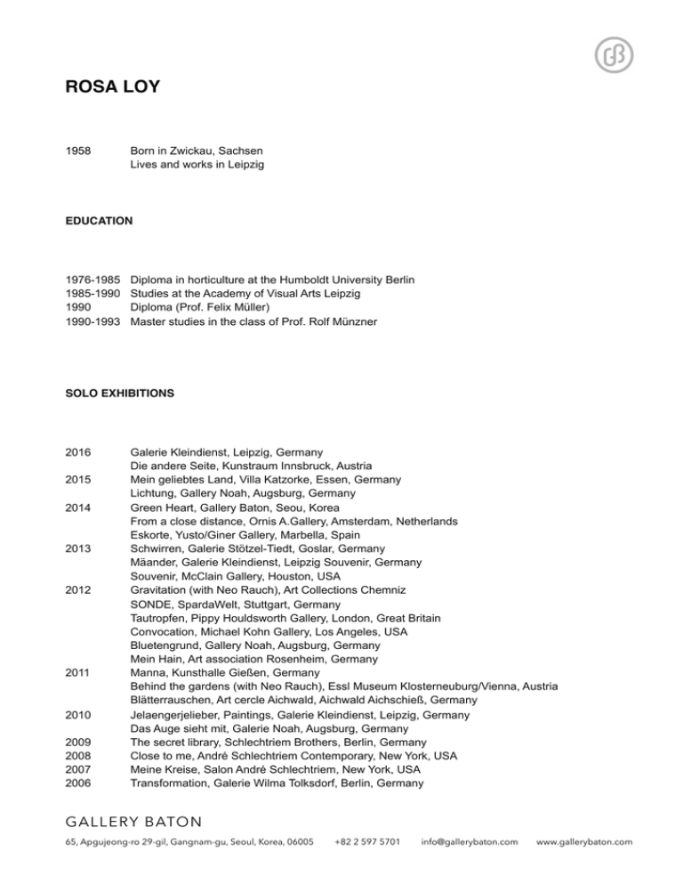 ROSA LOY 1958 Born in Zwickau, Sachsen Lives and works in Leipzig EDUCATION 1976-1985 1985-1990 1990 1990-1993 Diploma in horticulture at the Humboldt University Berlin Studies at the Academy of Visual Arts Leipzig Diploma (Prof. Felix Müller) Master studies in the class of Prof. Rolf Münzner SOLO EXHIBITIONS 2016 2015 2014 2013 2012 2011 2010 2009 2008 2007 2006 Galerie Kleindienst, Leipzig, Germany Die andere Seite, Kunstraum Innsbruck, Austria Mein geliebtes Land, Villa Katzorke, Essen, Germany Lichtung, Gallery Noah, Augsburg, Germany Green Heart, Gallery Baton, Seou, Korea From a close distance, Ornis A.Gallery, Amsterdam, Netherlands Eskorte, Yusto/Giner Gallery, Marbella, Spain Schwirren, Galerie Stötzel-Tiedt, Goslar, Germany Mäander, Galerie Kleindienst, Leipzig Souvenir, Germany Souvenir, McClain Gallery, Houston, USA Gravitation (with Neo Rauch), Art Collections Chemniz SONDE, SpardaWelt, Stuttgart, Germany Tautropfen, Pippy Houldsworth Gallery, London, Great Britain Convocation, Michael Kohn Gallery, Los Angeles, USA Bluetengrund, Gallery Noah, Augsburg, Germany Mein Hain, Art association Rosenheim, Germany Manna, Kunsthalle Gießen, Germany Behind the gardens (with Neo Rauch), Essl Museum Klosterneuburg/Vienna, Austria Blätterrauschen, Art cercle Aichwald, Aichwald Aichschieß, Germany Jelaengerjelieber, Paintings, Galerie Kleindienst, Leipzig, Germany Das Auge sieht mit, Galerie Noah, Augsburg, Germany The secret library, Schlechtriem Brothers, Berlin, Germany Close to me, André Schlechtriem Contemporary, New York, USA Meine Kreise, Salon André Schlechtriem, New York, USA Transformation, Galerie Wilma Tolksdorf, Berlin, Germany GA L LERY B ATON 65, Apgujeong-ro 29-gil, Gangnam-gu, Seoul, Korea, 06005 +82 2 597 5701 [email protected] www.gallerybaton.com 2005 2004 2003 2002 1999 Almanach, Oldenburger Kunstverein, Oldenburg, Germany 9 Wege, David Zwirner, New York, USA Gallery Wilma Tolksdorf, Frankfurt/Main, Germany Gallery of the Stadtsparkasse Gütersloh, Germany The allied, Museum of the city of Zwickau, Germany Gallery Kleindienst, Leipzig, Germany Gallery Wilma Tolksdorf, Frankfurt/Main, Germany The allied, Art collection Gera, Germany Gallery Entwistle, London, Great Britain Sponsorship award of contemporary art, Art room B2, Leipzig, Germany Art association of Backnang, Germany Gallery Entwistle, London, Great Britain VEAG sponsorship award of contemporary art, VEAG, Berlin, Germany GROUP EXHIBITIONS 2016 2015 2014 2013 Tightrope Walk: Painted Images After Abstraction, White Cube, London, UK Desperate Housewives? Künstlerinnen räumen auf, Kunstsammlungen Zwickau, Germany Body & Soul, Essl Museum, Klosterneuburg / Vienna, Austria Storyteller. Zeitgenössische Kunst aus Leipzig, Germany, Nationales Kunstmuseum, Riga, Latvia & Goethe-Institut Hanoi, Vietnam Flug der Königinnen. Women at Work, ROMPONE artspace, Cologne, Germany Mir ist das Leben lieber, Weserburg Museum für Moderne Kunst, Bremen, Germany Empire of the Senseless, Friedman Benda, New York, USA Beuys ohne Hut. Karin Szekessy fotografiert Künstler, Horst-Janssen-Museum, Oldenburg, Germany Ein Zimmer für Alfred Flechtheim, Osthaus Museum Hagen, Germany Personalities on Paper, Ornis A. Gallery, Amsterdam, Netherlands Leipzig 2015. Sammlung Hildebrand, G2 Kunsthalle, Leipzig, Germany Werkschau der Spinnereikünstler, Werkschauhalle, Leipzig, Germany Die bessere Hälfte - Malerinnen aus Leipzig, Kunsthalle Sparkasse Leipzig, Germany Desperate Housewives? Künstlerinnen räumen auf, Museum Kulturspeicher, Würzburg, Germany Vertraute Gesellschaft, Thaler Originalgrafik, Leipzig, Germany Gute Kunst? Wollen! SØR Rusche Sammlung Oelde/Berlin, Auf AEG, Nürnberg, Germany Perlmutt, Kunstverein Freunde Aktueller Kunst, Zwickau (mit Neo Rauch) Wahrheiten, Museum Abtei Liesborn, Liesborn, Germany This side of paradise, Sotheby's Gallery S2, London, UK Sechse gehen durch die ganze Welt, Stephan Schrör, Berlin, Germany I shall stay the way I am because I do not give a damn... - Dorothee Parker, Lombard Freid Gallery, New York, USA LUBOK. Graphic and book art from Leipzig, Museo de la Estampa del Instituto Mexiquense de Cultura, Toluca, Mexico Hin und weg, Art association Freunde aktueller Kunst e.V., Zwickau Gekauft. Acquisitions of the Graphic Collection, Museum of Visual Arts, Leipzig, Germany Schöne Landschaft - Bedrohte Natur. Old Masters in dialogue with contemporary art. Collection SØR Rusche Oelde/Berlin, Art hall Osnabrück LUBOK. Graphic and book art from Leipzig, Centro Cultural Clavijero, Morelio, Mexico GA L LERY B ATON 65, Apgujeong-ro 29-gil, Gangnam-gu, Seoul, Korea, 06005 +82 2 597 5701 [email protected] www.gallerybaton.com 2012 2011 2010 2009 2008 2007 2006 2005 2004 2003 2002 2001 Der Himmel im Garten. Natur - Landschaften, Essl Museum, Schömer- Haus, Klosterneuburg/ Vienna, Austria Jetzt hier. Contemporary art of the Kunstfonds, Art hall in Lipsiusbau, Dresden, Germany Tierstücke. Old Masters in dialogue with contemporary art. Collection SØR Rusche, Museum Abtei Lisborn, Portugal LUBOK. Graphic and book art from Leipzig, Galería de Arte Contemporáneo del Teatro Isauro Martínez Torreón, Coahuila, Mexico Sweethearts, Pippy Houldsworth Gallery, London, UK German Now - from Leipzig, Seongnam Art Center, Seoul, Korea Triangel, Galerie der Gegenwart, Karlsruhe, Germany Eros und Thanatos (SØR Rusche Collection), Werkschauhalle Leipzig, Germany Awardees Woldemar Winkler Price 1995-2011, Galerie Sparkasse Gütersloh, Germany LUBOK. Grafic and book art from Leipzig, Museo Nacional de la Estampa, Mexico City Leipzig Painters, Gallery Baton, Seoul, Korea Mrs Darling's Kiss, Arch402 Gallery, London Convoy Leipzig, Biksady Gallery, Budapest Salon der Gegenwart, Elbhof Hamburg Korso, Philara e.V., Düsseldorf The night, Städtische Galerie Delmenhorst Die unsichtbare Hand. Contemporary drawing of the collection Städtische Galerie Delmenhorst, Städtische Galerie Delmenhorst Korso, Werkschauhal
