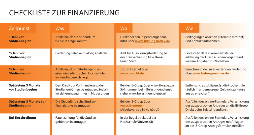 checkliste zur Finanzierung Zeitpunkt Was Wo Wie 1 Jahr vor Studienbeginn Abklären, ob ein Stipendium für sie in Frage kommt Direkt bei den Stipendiengebern, Infos über www.stiftungsindex.de Bedingungen ansehen (Literatur, Internet) und Kontakt aufnehmen ½ Jahr vor Studienbeginn Förderungsfähigkeit Bafoeg abklären Amt für Ausbildungsförderung bei der Kreisvertretung bzw. Kreisfreien Stadt Einreichen der Einkommenssteuererklärung der Eltern aus dem Vorjahr und weitere Angaben zur Vorhaben, ½ Jahr vor Studienbeginn Abklären, ob ihr Studiengang an einer niederländischen Hochschule im Pendlerbereich liegt z.B. im Internet über www.map24.de Berechnung der zu erwartenden Förderung über www.bafoeg-rechner.de Spätestens 3 Monate vor Studienbeginn Den Kredit zur Vorfinanzierung der Studiengebühren beantragen, Sozialversicherungsnummer in NL besorgen Bei der IB-Groep über www.ib-groep.nl Sofinummer beim Belastingendienst, siehe: www.belastingendienst.nl Entfernung abschätzen. Ist die Hochschule täglich in angemessener Zeit von zu Hause aus zu erreichen? Spätestens 3 Monate vor Studienbeginn Die Niederländische Studienfinanzierung beantragen Bei der IB-Groep über www.ib-groep.nl (Arbeitsvertrag in NL nötig!) Ausfüllen des online-Formulars, Verschickung des ausgedruckten Antrages an die IB-Groep, Direkt beim Belastingendienst Bei Einschreibung Ratenzahlung für die Studiengebühren beantragen In der Regel direkt bei der Hochschule/Universität Ausfüllen des online-Formulars, Verschickung des ausgedruckten Antrages mit Anlagen an die IB-Groep Antragsformular ausfüllen