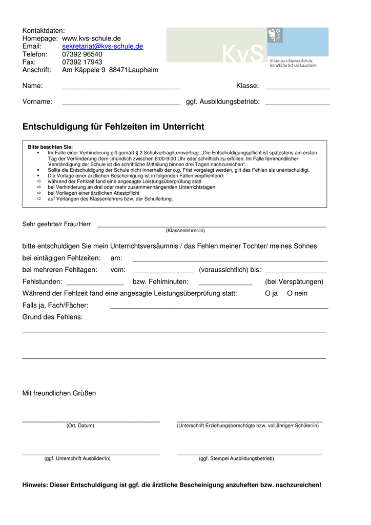 Kontaktdaten: Homepage: www.kvs-schule.de Email: [email protected] Telefon: 07392 96540 Fax: 07392 17943 Anschrift: Am Käppele 9 88471Laupheim Name: _______________________________ Klasse: _________________ Vorname: _______________________________ ggf. Ausbildungsbetrieb: _________________ Entschuldigung für Fehlzeiten im Unterricht Bitte beachten Sie: Im Falle einer Verhinderung gilt gemäß § 2 Schulvertrag/Lernvertrag: „Die Entschuldigungspflicht ist spätestens am ersten Tag der Verhinderung (fern-)mündlich zwischen 8:00-9:00 Uhr oder schriftlich zu erfüllen. Im Falle fernmündlicher Verständigung der Schule ist die schriftliche Mitteilung binnen drei Tagen nachzureichen“. Sollte die Entschuldigung der Schule nicht innerhalb der o.g. Frist vorgelegt werden, gilt das Fehlen als unentschuldigt. Die Vorlage einer ärztlichen Bescheinigung ist in folgenden Fällen verpflichtend: während der Fehlzeit fand eine angesagte Leistungsüberprüfung statt bei Verhinderung an drei oder mehr zusammenhängenden Unterrichtstagen bei Vorliegen einer ärztlichen Attestpflicht auf Verlangen des Klassenlehrers bzw. der Schulleitung. Sehr geehrte/r Frau/Herr __________________________________________________________________ (Klassenlehrer/in) bitte entschuldigen Sie mein Unterrichtsversäumnis / das Fehlen meiner Tochter/ meines Sohnes bei eintägigen Fehlzeiten: am: ___________________________________________________ bei mehreren Fehltagen: vom: ________________ (voraussichtlich) bis: ________________ Fehlstunden: _______________ bzw. Fehlminuten: ______________ Während der Fehlzeit fand eine angesagte Leistungsüberprüfung statt: Falls ja, Fach/Fächer: (bei Verspätungen) O ja O nein _________________________________________________________ Grund des Fehlens: _________________________________________________________________________ _________________________________________________________________________ Mit freundlichen Grüßen _________________________________ (Ort, Datum) _________________________________ (ggf. Unterschrift Ausbilder/in) ___________________________________ (Unterschrift Erziehungsberechtigte bzw. volljährige/r Schüler/in) ___________________________________ (ggf. Stempel Ausbildungsbetrieb) Hinweis: Dieser Entschuldigung ist ggf. die ärztliche Bescheinigung anzuheften bzw. nachzureichen!
