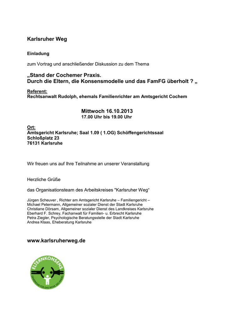Karlsruher Weg Einladung zum Vortrag und anschließender Diskussion zu dem Thema „Stand der Cochemer Praxis. Durch die Eltern, die Konsensmodelle und das FamFG überholt ? „ Referent: Rechtsanwalt Rudolph, ehemals Familienrichter am Amtsgericht Cochem Mittwoch 16.10.2013 17.00 Uhr bis 19.00 Uhr Ort: Amtsgericht Karlsruhe; Saal 1.09 ( 1.OG) Schöffengerichtssaal Schloßplatz 23 76131 Karlsruhe Wir freuen uns auf Ihre Teilnahme an unserer Veranstaltung Herzliche Grüße das Organisationsteam des Arbeitskreises "Karlsruher Weg“ Jürgen Scheuver , Richter am Amtsgericht Karlsruhe – Familiengericht – Michael Petermann, Allgemeiner sozialer Dienst der Stadt Karlsruhe Christiane Dörsam, Allgemeiner sozialer Dienst des Landkreises Karlsruhe Eberhard F. Schrey, Fachanwalt für Familien- u. Erbrecht Karlsruhe Petra Ziegler, Psychologische Beratungsstelle der Stadt Karlsruhe Andrea Klaas, Eheberatung Karlsruhe www.karlsruherweg.de