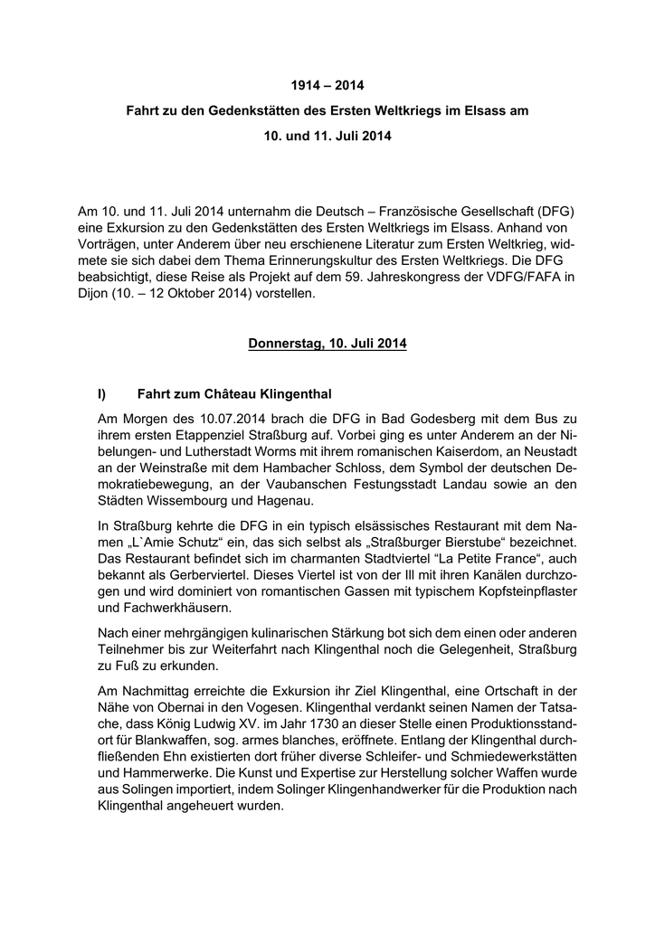 1914 – 2014 Fahrt zu den Gedenkstätten des Ersten Weltkriegs im Elsass am 10. und 11. Juli 2014 Am 10. und 11. Juli 2014 unternahm die Deutsch – Französische Gesellschaft (DFG) eine Exkursion zu den Gedenkstätten des Ersten Weltkriegs im Elsass. Anhand von Vorträgen, unter Anderem über neu erschienene Literatur zum Ersten Weltkrieg, widmete sie sich dabei dem Thema Erinnerungskultur des Ersten Weltkriegs. Die DFG beabsichtigt, diese Reise als Projekt auf dem 59. Jahreskongress der VDFG/FAFA in Dijon (10. – 12 Oktober 2014) vorstellen. Donnerstag, 10. Juli 2014 I) Fahrt zum Château Klingenthal Am Morgen des 10.07.2014 brach die DFG in Bad Godesberg mit dem Bus zu ihrem ersten Etappenziel Straßburg auf. Vorbei ging es unter Anderem an der Nibelungen- und Lutherstadt Worms mit ihrem romanischen Kaiserdom, an Neustadt an der Weinstraße mit dem Hambacher Schloss, dem Symbol der deutschen Demokratiebewegung, an der Vaubanschen Festungsstadt Landau sowie an den Städten Wissembourg und Hagenau. In Straßburg kehrte die DFG in ein typisch elsässisches Restaurant mit dem Namen „L`Amie Schutz“ ein, das sich selbst als „Straßburger Bierstube“ bezeichnet. Das Restaurant befindet sich im charmanten Stadtviertel “La Petite France“, auch bekannt als Gerberviertel. Dieses Viertel ist von der Ill mit ihren Kanälen durchzogen und wird dominiert von romantischen Gassen mit typischem Kopfsteinpflaster und Fachwerkhäusern. Nach einer mehrgängigen kulinarischen Stärkung bot sich dem einen oder anderen Teilnehmer bis zur Weiterfahrt nach Klingenthal noch die Gelegenheit, Straßburg zu Fuß zu erkunden. Am Nachmittag erreichte die Exkursion ihr Ziel Klingenthal, eine Ortschaft in der Nähe von Obernai in den Vogesen. Klingenthal verdankt seinen Namen der Tatsache, dass König Ludwig XV. im Jahr 1730 an dieser Stelle einen Produktionsstandort für Blankwaffen, sog. armes blanches, eröffnete. Entlang der Klingenthal durchfließenden Ehn existierten dort früher diverse Schleifer- und Schmiedewerkstätten und Hammerwerke. Die Kunst und Expertise zur Herstellung solcher Waffen wurde aus Solingen importiert, indem Solinger Klingenhandwerker für die Produktion nach Klingenthal angeheuert wurden. In Klingenthal logierte die DFG im Château Klingenthal. Das Château wurde einst vom Eigentümer einer dort ansässigen Blankwaffenmanufaktur errichtet und in den 1970er Jahren von der Johann-Wolfgang von Goethe - Stiftung mit Sitz in Basel erworben. Diese Stiftung bezweckt die Anregung, Förderung, Unterstützung, Auszeichnung und Verbreitung von beispielhaften geistigschöpferischen Arbeiten. Dementsprechend werden im Château Klingenthal häufig Konferenzen, Seminare, Workshops, Arbeitskreise und andere Veranstaltungen zu diesem Zweck abgehalten. Das Château ist umgeben von einer parkähnlichen Anlage mit einem Teich, der die Teilnehmer morgens oder nach den Mittags- und Abendmahlzeiten zum kurzen Verweilen und Lustwandeln einlud. Ins Auge fiel auch das gefällige innere Ambiente des Château, ist es doch mit antikem Mobiliar, Bildern und alten elsässischen Gebrauchsgegenständen eingerichtet. Ein aus dem 17. Jahrhundert stammendes Holztreppenhaus verbindet die beiden oberen Stockwerke des Château mit dem Erdgeschoss. Da die Präsidentin dieser Stiftung, Frau Prof. Dr. Marie-Paule Stintzi, die DFG dankenswerterweise in das Château eingeladen hatte, waren Kost und Logis für die DFG frei und die Teilnehmer wussten es sehr zu schätzen, vom Château - Personal umfassend verköstigt und betreut zu werden. II) Vortrag von Herrn Prof. Dr. Daniel Antony Am Abend versammelte sich die DFG im alten Gewölbekeller des Château zu einem Arbeitskreis, um vor dem Wandbildnis Karls des Großen dem Vortrag von Herrn Prof. Dr. Daniel Antony zur deutschen und französischen Erinnerungskultur des Ersten Weltkriegs beizuwohnen und um den Rezensionen zu neueren Publikationen zum Ersten Weltkrieg zu lauschen. Herr Prof. Antony ist Historiker und lehrt als Professor für Geschichte des 16. Jahrhunderts (Renaissance) an der Universität Besançon. In seinem Vortrag schilderte er der DFG die Erfahrungen und Wahrnehmungen, die seine Vorfahren im Ersten Weltkrieg gesammelt und an ihre Nachkommen weitergegeben haben. Anhand eines Kriegs - Souvenirs, einer alten gravierten und in Familienbesitz befindlichen Granathülse aus dem Ersten Weltkrieg, demonstrierte er, wie viele französische Familien ihre persönlichen Erinnerungen an den „Großen Krieg“ aufrechterhalten. Herr Prof. Antony beabsichtigt, seine Familienerinnerungen und -erfahrungen in einem Roman niederzulegen. Im weiteren Verlauf des Vortrags erläuterte Herr Prof. Antony die Begriffe Nationalismus und Patriotismus und wie die Erinnerungskultur in der Öffentlichkeit in Frankreich wahrgenommen und staatlich ausgelebt wird. Er berichtete weiterhin über die Schwierigkeiten, jüngeren Generationen die Thematik des Ersten Weltkriegs zu vermitteln. Darüber hinaus informierte er darüber, dass die aktuelle Erinnerungskultur vom Wandel der französischen Gesellschaft stark beeinflusst wird und gegenwärtig von sozialen Themen wie z.B. Immigration und Integration überlagert bzw. stellenweise verdrängt wird. Diese Faktoren und die Tatsache, dass der Ausbruch des Ersten Weltkriegs bereits 100 Jahre zurück liegt, könnten dazu führen, dass diese Materie zukünftig weniger beachtet und weniger in das gesellschaftliche und politische Leben integriert wird. Abgerundet wurde der Vortrag mit Erkenntnissen über die Bedeutung der Erinnerungskultur für die deutsch – französische Freundschaft und Zusammenarbeit und für das vereinte Europa, dessen Prinzipien bewahrt werden müssen. Es bleibe abzuwarten, wie sich nationalistische Tendenzen, die bei der letzten Europawahl in einigen Mitgliedstaaten einschließlich Frankreich zu beobachten waren, auf die Erinnerungskultur und Europa auswirken. III) Buchrezension Im Anschluss wurden jüngere Publikationen zum 