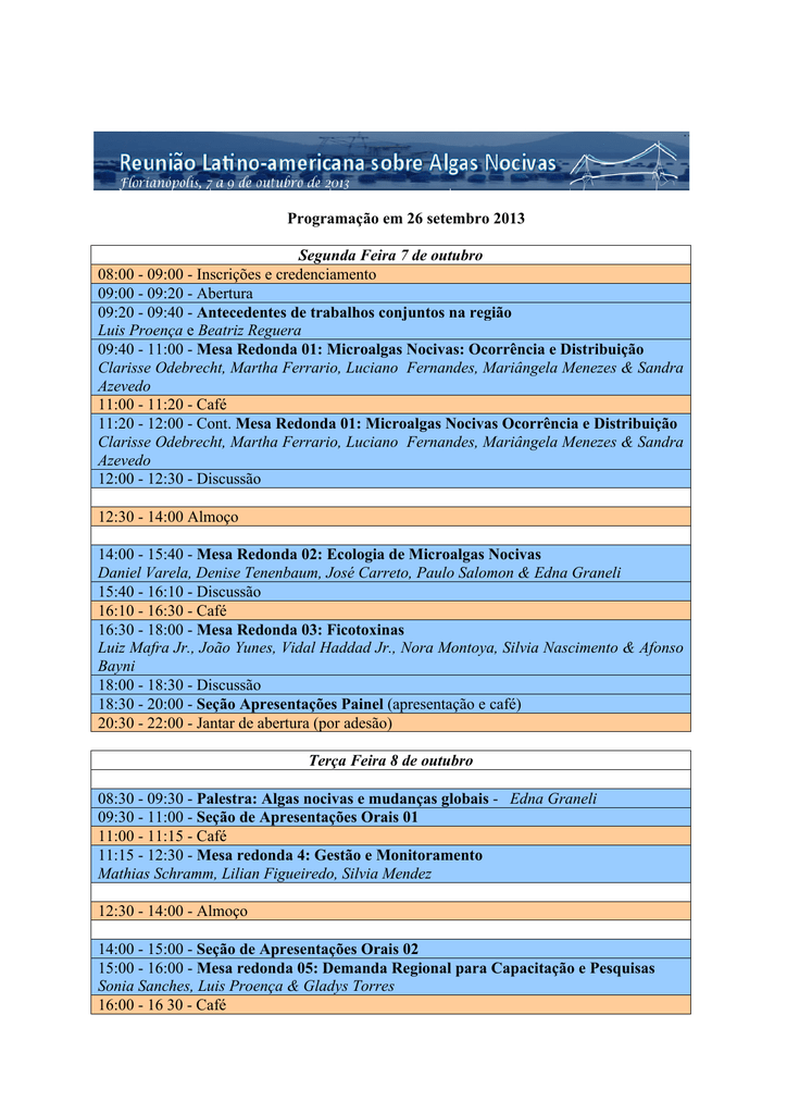 Programação em 26 setembro 2013 Segunda Feira 7 de outubro 08:00 - 09:00 - Inscrições e credenciamento 09:00 - 09:20 - Abertura 09:20 - 09:40 - Antecedentes de trabalhos conjuntos na região Luis Proença e Beatriz Reguera 09:40 - 11:00 - Mesa Redonda 01: Microalgas Nocivas: Ocorrência e Distribuição Clarisse Odebrecht, Martha Ferrario, Luciano Fernandes, Mariângela Menezes & Sandra Azevedo 11:00 - 11:20 - Café 11:20 - 12:00 - Cont. Mesa Redonda 01: Microalgas Nocivas Ocorrência e Distribuição Clarisse Odebrecht, Martha Ferrario, Luciano Fernandes, Mariângela Menezes & Sandra Azevedo 12:00 - 12:30 - Discussão 12:30 - 14:00 Almoço 14:00 - 15:40 - Mesa Redonda 02: Ecologia de Microalgas Nocivas Daniel Varela, Denise Tenenbaum, José Carreto, Paulo Salomon & Edna Graneli 15:40 - 16:10 - Discussão 16:10 - 16:30 - Café 16:30 - 18:00 - Mesa Redonda 03: Ficotoxinas Luiz Mafra Jr., João Yunes, Vidal Haddad Jr., Nora Montoya, Silvia Nascimento & Afonso Bayni 18:00 - 18:30 - Discussão 18:30 - 20:00 - Seção Apresentações Painel (apresentação e café) 20:30 - 22:00 - Jantar de abertura (por adesão) Terça Feira 8 de outubro 08:30 - 09:30 - Palestra: Algas nocivas e mudanças globais - Edna Graneli 09:30 - 11:00 - Seção de Apresentações Orais 01 11:00 - 11:15 - Café 11:15 - 12:30 - Mesa redonda 4: Gestão e Monitoramento Mathias Schramm, Lilian Figueiredo, Silvia Mendez 12:30 - 14:00 - Almoço 14:00 - 15:00 - Seção de Apresentações Orais 02 15:00 - 16:00 - Mesa redonda 05: Demanda Regional para Capacitação e Pesquisas Sonia Sanches, Luis Proença & Gladys Torres 16:00 - 16 30 - Café 16:30 - 17:30 - Discussão plenária. síntese e indicação do comitê de edição dos anais. 17:30 - 18:00 - Encerramento 18:00 - 19:00 - Assembleia de criação da Associação Para Estudos sobre Algas Nocivas Quarta Feira 9 de Outubro 08:00 - 12:30 Reunião da comissão organizadora e científica da 17a Conferência Internacional sobre Algas Nocivas (International Conference on Harmful Algae, ICHA) da International Society for Studies on Harmful Algae ISSHA (www.issha.org). Reunião do comitê de edição dos Anais do encontro. Seção de Apresentações Painel - 07/10 18:30- 20:00 (os trabalhos permanecerão expostos durante todo o evento) Taxonomia e biologia molecular de isolados de Raphidophyceae do Atlântico Sul Suema Branco, C.O. Alves-de-Souza, LA.O. Proença, & M. Menezes Identificação de Dinophysis acuminata do sul do Brasil com base em sua análise molecular: aspectos metodológicos Lumi Haraguchi, L.F. Marins, L. Mafra Jr., L.A.O. Proença, S. Méndez, & C. Odebrecht Lagoa de Araruama: uma abordagem qualitativa para ocorrência de dinoflagelados potencialmente nocivos Thatiana Paz Ribeiro-Lopes, F. L. S. Lopes, G. M. Oliveira, F. P. Reinhardt; T. M Sousa, M.M.S. Leite & Silva, P.P.O. Rede de pesquisa da ficoflora marinha do estado da Bahia estudo das microalgas fitoplanctônicas e dinoflagelados epibentônicos (epífitos em macroalgas), com ênfase nas espécies potencialmente nocivas Helen Michelle de J. Alfe, M.C.Q. Mendes; E.M. Camandaroba; L.N.S. Petersen, M. Menezes; J.M.C. Nunes Exposição de pescadores ao ácido domóico via o consumo de peixes contaminados Fernanda F. M. Mazzillo, C. Pomeroy, J. Kuo, P.T Ramondi, R. Prado & M. Silver Ocorrência de Gambierdiscus, Ostreopsis e Prorocentrum em Salvador-Bahia, Brasil Maria Cristina de Q. Mendes; H.M.J. Affe, L.N.P. Santos; M. Menezes, J.M.C. Nunes Ocorrência do gênero Pseudo-nitzschia Peragallo (Bacillariophyceae) na enseada de Camboriú, Santa Catarina, Brasil Graziela da Rosa Persich, P. Chiossi, E. Becker, M. Ottonelli & L. Rörig Estudo preliminar sobre a ocorrência de espécies de prorocentrum (Dinophyceae) na Lagoa de Araruama, RJ no verão de 2012 Giislene M. Oliveira, T.P. Ribeiro-Lopes, F.L.L. da Silva; T.M. Sousa, L.C. Renó, M.M.L. dos Santos & P.P.O. Silva Proposta de metodologia de amostragem para o sistema de vigilância de biotoxinas em moluscos bivalves Isabella Fontana, E.O. Telles & F. Ferreira Avaliação da toxicidade de mexilhões Perna perna (Linnaeu, 1758) em fazenda de maricultura da Reserva Extrativista Marinha de Arraial do Cabo, RJ Daniela A. de Souza, M.H.C.B. Neves & M.M. de Oliveira Seção de Apresentações Orais 01 - 08/10 09:30-11:00 h Ocurrencia y monitoreo de floraciones de algas verde azules (Cyanobacteria) en ecosistemas de aguas continentales de Chile Viviana Almanza, O. Parra, J. Beltran, J. Becerra & R. Urrutia Avaliação da produtividade de uma cepa de Cylindrospermopsis raciborskii isolada da Lagoa do Peri, SC, sob diferentes intensidades luminosas Maria Cecilia Miotto, G.J. Andrade; C.L. Viscarra, J.V.H. Lins, H.; L. Rörig, Impacto da cianobactéria Nodularia spumigena em cultivo de camarões marinhos em sistema de bioflocos Carolina M. Costa, Fóes, C. Odebrecht; L. Poersch & W. Wasielesky Jr. Gênero Gambierdiscus: diversidade desconhecida na costa do Brasil Bruna S Diniz, M. Menezes & Silvia Mattos Nascimento Fitoplancton tóxico y nocivo del pacífico tropical mexicano: un sumario de resultados de cruceros oceanográficos en cuatro años consecutivos (2009-2012) David U. Hernández-Becerril, R. Alonso-Rodríguez, S.A. Barón-Campis; J. Ceballos-Corona J. A. Gerardo, M. Merino-Ibarra, A. Morales-Blake & M.C. Rodríguez-Palacio. Seção de Apresentações Orais 02 - 08/10 14:00-15:00 h Florecimiento primaveral del dinoflagelado toxico Prorocentrum minimum y de la diatomea Thalassiosira sp. En un área afectada por el incremento estacional de la radiación ultravioleta. Síntesis de amino ácidos similares a micosporinas (maas) y xantofilas como mecanismos de fotoprotección José Ignacio Carreto, M.O. Carignan, N.G. Montoya & V.K. Fulco Avances en la predicción de floraciones de Dinophysis y acumulación de sus toxinas en los bivalvos Beatriz Reguera Azaspiracids - an emerging global toxin problem associated with Azadinium and related dinoflagellates, with put