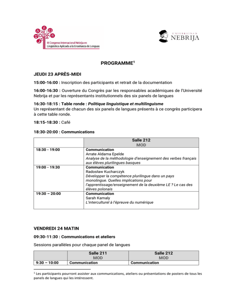 PROGRAMME1 JEUDI 23 APRÈS-MIDI 15:00-16:00 : Inscription des participants et retrait de la documentation 16:00-16:30 : Ouverture du Congrès par les responsables académiques de l’Université Nebrija et par les représentants institutionnels des six panels de langues 16:30-18:15 : Table ronde : Politique linguistique et multilinguisme Un représentant de chacun des six panels de langues présents à ce congrès participera à cette table ronde. 18:15-18:30 : Café 18:30-20:00 : Communications Salle 212 MOD 18:30 - 19:00 Communication Arrate Aldama Epelde Analyse de la méthodologie d’enseignement des verbes français aux élèves plurilingues basques Communication Radosław Kucharczyk Développer la compétence plurilingue dans un pays monolingue. Quelles implications pour l’apprentissage/enseignement de la deuxième LE ? Le cas des élèves polonais Communication Sarah Kamaly L’interculturel à l’épreuve du numérique 19:00 - 19:30 19:30 – 20:00 VENDREDI 24 MATIN 09:30-11:30 : Communications et ateliers Sessions parallèles pour chaque panel de langues Salle 211 MOD 9:30 – 10:00 1 Communication Salle 212 MOD Communication Les participants pourront assister aux communications, ateliers ou présentations de posters de tous les panels de langues qui les intéressent. 10:00 - 10:30 10:30 – 11:30 Sylvie Méron-Minuth La perspective plurilingue dans l’enseignement des langues étrangères au lycée. Coup de projecteur sur les attitudes des enseignants dans la prise en compte du bagage langagier et culturel des apprenants existant en regard des langues étrangères enseignées à l’école Communication Amel Belkacemi et Meriem Stambouli La didactique du plurilinguisme et de l’interculturalité dans le cadre du « projet CMCEFU ». Conception d’un manuel de compréhension et d’expression écrite en français langue universitaire pour étudiants algériens venant de milieux multilingues Atelier Pierre Escude et Mariana Fonseca Favre Intercompréhension entre langues romanes (portugais, espagnol, français, italien, roumain) : techniques et développement d'une modalité d'apprentissage scolaire Françoise Jammet Apprendre et interagir avec des outils numériques simples : Exemple d’une tâche pédagogique dans le contexte chypriote Communication Thomas Lamouroux Présentation et analyse de ressources Internet pour l'enseignementapprentissage du français professionnel ou de l'entreprise Atelier Manuel López Esquinas Ressources numériques en classe de FLE 11:30-12:00 : Pause café 12:00-13:00 : Cours Magistraux (simultanés) David Lasagabaster (Euskal Herriko Unibertsitatea) : Eleaniztasunerako bidea Euskadin. Helena Araújo de Sa (Universidade de Aveiro, Portugal) : “É o feitiço das línguas... e das culturas “: mobilidade virtual e aproximação às línguas em plataformas de formação à intercompreensão em linguas románicas. 13:00-14:00 : Communications et posters Salle 211 MOD 13:00 - 13:30 Communication Krystyna Szymankiewicz Former à l’enseignement interculturel : le rôle du savoirêtre et du savoir-apprendre des Salle 212 MOD Communication Lolita Tabuashvili L’étude typologique des unités phraséologiques contenant des concepts gastronomiques Française et Géorgienne. futurs enseignants de langue étrangère Communication Riccardo Raimondo Dispositifs critiques et herméneutiques pour une nouvelle discipline : l’historiographie des traductions 13:30 - 14:00 Communication Nadir Medjahed La co-construction du discours didactique en classe de langue (FLE) par le biais des négociations de sens Zones communes 13:00 - 14:00 : Posters de toutes les sections VENDREDI 24 APRÈS-MIDI 15:30-16:30 : Présentations des maisons d’éditions (simultanées) 16:30-17:30 : Ateliers Sessions parallèles pour chaque panel de langues Salle 211 MOD 16:30 - 17:30 Atelier Riham M. Elkhamissy Enseigner la linguistique française autrement Salle 212 MOD Atelier Luis Gonzalez, Anna Renda et Corinne Dequaire Le traducteur en ligne : meilleur ami ou pire ennemi ? 17:30-18:00 : Pause café 18:00-19:30 : Communications Sessions parallèles pour chaque panel de langues 18:00 - 18:30 19:00 - 19:30 Salle 211 MOD Communication Piñeiro Maceiras María Luisa et RE Matteo Approche plurilingue dans l’enseignement du français du tourisme Communication Khadraoui Errime et Messaour Riad Quelle place pour la dimension interculturelle dans l’enseignement du FLE en Algérie ? Salle 212 MOD Communication Laura Abou Haidar Typologie d’erreurs et remédiation phonétique en FLE Communication Riham M. Elkhamissy La conception de l'erreur formatrice en FLE. La conception de l'erreur formatrice : étude de cas SAMEDI 25 MATIN 09:30-11:30 : Communications et ateliers Sessions parallèles pour chaque panel de langues 09:30 - 10:00 10:00 - 10:30 10:30 - 11:00 11:00 - 11:30 211 MOD 212 MOD Communication Bouzar Hamor Fadhila Enseignement/apprentissage précoce du français langue de scolarité Communication Houda Akmoun et Nadja Bouchamma Travailler dans l'interdisciplinarité pour un meilleur développement de la compétence plurilingue Communication Krastanka Bozhinova Améliorer la production écrite en français L3 à l’aide d’outils numériques Communication Isabel Alvarado G. Acquisition du placement des pronoms compléments en français L3 : de l’analyse de l’interlangue d’apprenants à la réflexion didactique Communication Leyre Ruiz de Zarobe et Sílvia Araújo Pour une approche des types de textes en mode hybride Communication Béatrice Martinez Propositions techniques pour l’exploitation de proverbes, dictons et expressions imagées dans le cours Communication Abram J. Jones En dépit de la preuve : une analyse du discours des apprenants de français langue étrangère aux États-Unis Communication Isabelle Mordellet-Roggenbuck Comment évaluer la compétence orale en situation ? Entre standardisation linguistique et créativité humaine 11:30-12:00 : Pause c