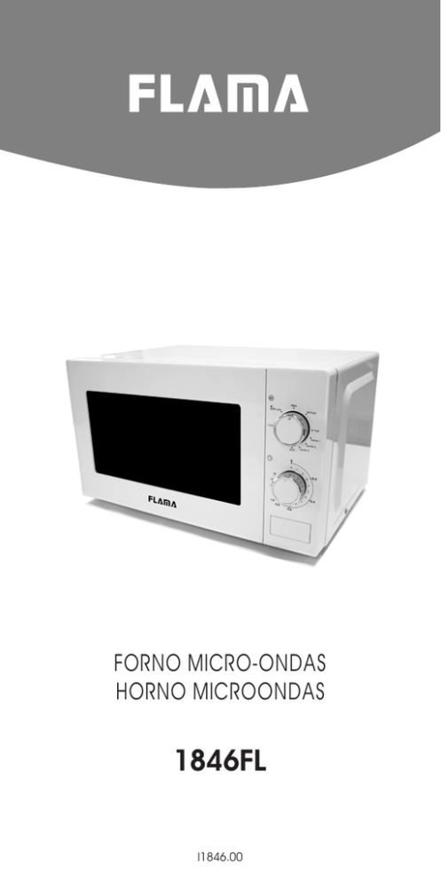 FORNO MICRO-ONDAS HORNO MICROONDAS 1846FL I1846.00 PORTUGUÊS 1- 2- 3- 4- 5- Fecho da Porta com Sistema de Segurança Porta/Janela do Forno Acionador do Prato de vidro rotativo Painel de Comandos Prato de Vidro rotativo 2 CONSELHOS DE SEGURANÇA Ao utilizar o seu aparelho, siga alguns conselhos de segurança, tais como: - Verifique se a tensão de alimentação do aparelho corresponde à da instalação elétrica. - Este aparelho é destinado a ser utilizado em aplicações domésticas e análogas tais como: •Áreas de cozinha reservadas ao pessoal de lojas, oficinas e outros ambientes profissionais •Casas de campo •Por clientes de hotéis, motéis e outros ambientes de carácter residencial •Ambientes do tipo quarto de hotel - Este tipo de forno foi especialmente concebido para aquecimento, cozedura ou descongelação de alimentos. Não deverá ser utilizado para fins industriais ou laboratoriais. - O forno micro-ondas está previsto para aquecer produtos alimentares e bebidas. Secagem de alimentos ou roupas e aquecimento de almofadas de aquecimento, chinelos, toalhas, pano húmido e artigos similares pode levar ao risco de ignição, lesão ou fogo. - Desligue o aparelho antes de proceder a qualquer operação de limpeza. Não use produtos químicos corrosivos, nem “sprays” na limpeza ou durante a utilização do seu micro-ondas. - Se o aparelho não estiver a funcionar corretamente, se estiver de alguma forma danificado, ou em caso de avaria, dirija-se apenas aos Serviços de Assistência Técnica Autorizados Flama. - Não utilize o aparelho se o cabo de alimentação ou a ficha se encontrarem danificados, mande-os substituir imediatamente num Serviço de Assistên- 3 PORTUGUÊS Leia atentamente todas as instruções antes de utilizar o aparelho pela primeira vez e guarde-o para consultas futuras. Uma utilização não conforme com as instruções, liberta a FLAMA de todas as responsabilidades. PORTUGUÊS cia Técnica Autorizado Flama, a fim de evitar um perigo. - Este aparelho pode ser utilizado por crianças de 8 anos ou mais e por pessoas com capacidades físicas, sensoriais ou mentais limitadas ou com falta de experiência e conhecimento, se forem vigiadas ou tiverem recebido instruções relativas ao uso do aparelho de uma forma segura e compreenderem os riscos envolvidos. As crianças não devem brincar com o aparelho. - A limpeza e manutenção não devem ser feitas por crianças sem supervisão. Não ponha o forno a funcionar em vazio, existe o risco de danificar o aparelho. Coloque sempre uma quantidade de alimentos que permita o correto funcionamento do aparelho. - A fim de se eliminar o risco de danos na cavidade do forno: • Sempre que aquecer alimentos em recipientes de plástico ou de papel, verifique várias vezes o forno com o objetivo de evitar a combustão dos mesmos. • Retire os agrafos dos sacos de papel ou de plástico, antes de os colocar no forno. • Se notar que começa a formar-se fumo, desligue a ficha da tomada e mantenha a porta do forno fechada a fim de abafar quaisquer chamas que se formem no interior. • Não utilize a cavidade para armazenar alimentos. - Não deixe produtos de papel, utensílios de cozinha ou alimentos na cavidade quando o forno não estiver a ser utilizado. AVISO: Não utilize recipientes herméticos para aquecer líquidos ou outros alimentos, dado que estão sujeitos a rebentar. - O aquecimento de líquidos no micro-ondas poderá resultar de uma prolongada fervura; o reci4 5 PORTUGUÊS piente deverá ser manuseado com precaução. - Não frite alimentos no forno. O óleo quente pode danificar os componentes do aparelho e até provocar queimaduras no utilizador. - Os ovos (crus ou cozidos) com casca não deverão ser aquecidos no micro-ondas uma vez que podem rebentar, mesmo após o final da confeção. - Dê um golpe nos alimentos com casca grossa, tais como batatas, abóboras inteiras, maçãs e castanhas, antes de os cozer no forno. - Agite bem os biberões, pequenos boiões de alimentação de bebés, verificando sempre a sua temperatura antes de servir, a fim de evitar queimaduras. - Os utensílios poderão aquecer devido ao calor transmitido pelos alimentos. Poderá ser necessário para o manuseamento dos utensílios o uso de pegas. AVISO: Não deixar as crianças utilizar o forno sem supervisão a não ser que lhes sejam dadas instruções adequadas para que a criança esteja apta a utilizar o forno de forma segura e compreenda os perigos de uma utilização inadequada. - Deverá verificar os utensílios, assegurando-se que são adequados para o uso no forno micro-ondas: teste do utensílio, coloque no forno o recipiente vazio juntamente com um copo com água, selecione a potência máxima, para 60 segundos. Se o utensílio ficar muito quente, não deverá ser usado. AVISO: É perigoso para qualquer pessoa que não uma pessoa competente efetuar qualquer serviço ou operação de reparação que envolva a remoção da tampa que assegura a proteção contra a exposição à energia de micro-ondas. - Cuidados especiais no manuseamento do forno micro-ondas: Não tente utilizar o forno com a porta aberta, pois poderá provocar exposição à energia das micro- PORTUGUÊS -ondas. É importante não tapar ou forçar as alavancas/fechos de segurança. O micro-ondas deverá ser limpo regularmente removendo quaisquer resíduos de comida, conforme indicado nas instruções de Limpeza e Manutenção. A falta de limpeza do micro-ondas poderá levar à deterioração das superfícies, podendo reduzir o tempo de vida do aparelho e possivelmente resultar em situações de perigo. AVISO: Se a porta ou as zonas de vedação estiverem danificadas não utilize o aparelho. Mande-o reparar imediatamente num Serviço de Assistência Técnica Autorizado Flama. - Não intercale nenhum objeto entre a fachada e a porta do forno, nem permita que sujidade ou resíduos de produtos de limpeza se acumulem nas superfícies de fecho. - Não util