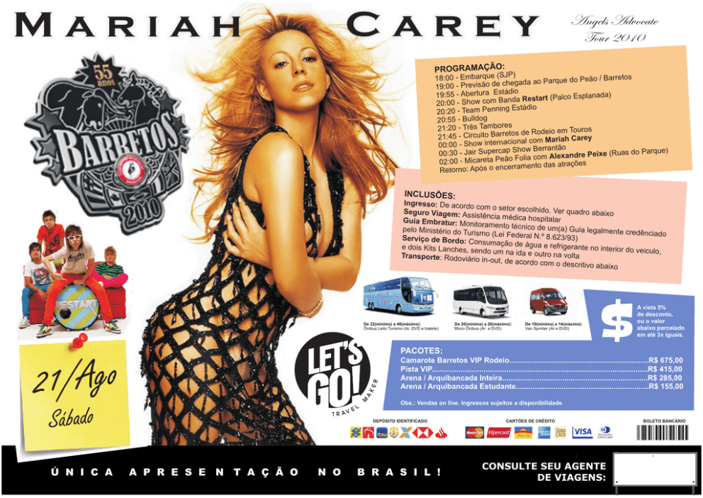 Carey Mariah Angels Advocate Tour 2010 PROGRAMAÇÃO: P) 18:00 - Embarque (SJ ão / Barretos gada ao Parque do Pe 19:00 - Previsão de che io 19:55 - Abertura Estád planada) nda Restart (Palco Es 20:00 - Show com Ba io tád Es 20:20 - Team Penning 20:55 - Bulldog 21:20 - Três Tambores de Rodeio em Touros 21:45 - Circuito Barretos com Mariah Carey nal 00:00 - Show internacio ow Berrantão Sh p rca 00:30 - Jair Supe ixe (Ruas do Parque) lia com Alexandre Pe Fo ão Pe ta are Mic 02:00 ramento das atrações Retorno: Após o encer INCLUSÕES: Ingresso: De acordo com o setor escolhido . Ver quadro abaixo Seguro Viagem: Assis tência médica hospitala r Guia Embratur: Monito ramento técnico de um (a) Guia legalmente cre pelo Ministério do Turism dênciado o (Lei Federal N.º 8.623 /93) Serviço de Bordo: Co nsumação de água e refrigerante no interior e dois Kits Lanches, sen do veiculo, do um na ida e outro na volta Transporte: Rodoviário in-out, de acordo com o descritivo abaixo De 32(mínimo) a 46(máximo): Ônibus Leito Turismo (Ar, DVD e toalete) De 20(mínimo) a 26(máximo): Micro Ônibus (Ar e DVD) De 10(mínimo) a 14(máximo): Van Sprinter (Ar e DVD) PACOTES: 21/Ago Camarote Barretos VIP Rodeio...................................................................R$ 675,00 Pista VIP........................................................................................................R$ 415,00 Arena / Arquibancada Inteira......................................................................R$ 285,00 Arena / Arquibancada Estudante................................................................R$ 155,00 Obs.: Vendas on line. Ingressos sujeitos a disponibilidade. Sábado Ú N I C A $ A vista 5% de desconto, ou o valor abaixo parcelado em até 3x iguais. DEPÓSITO IDENTIFICADO A P R E S E N T A Ç Ã O N O B R A S I L ! CARTÕES DE CRÉDITO CONSULTE SEU AGENTE DE VIAGENS: BOLETO BANCÁRIO