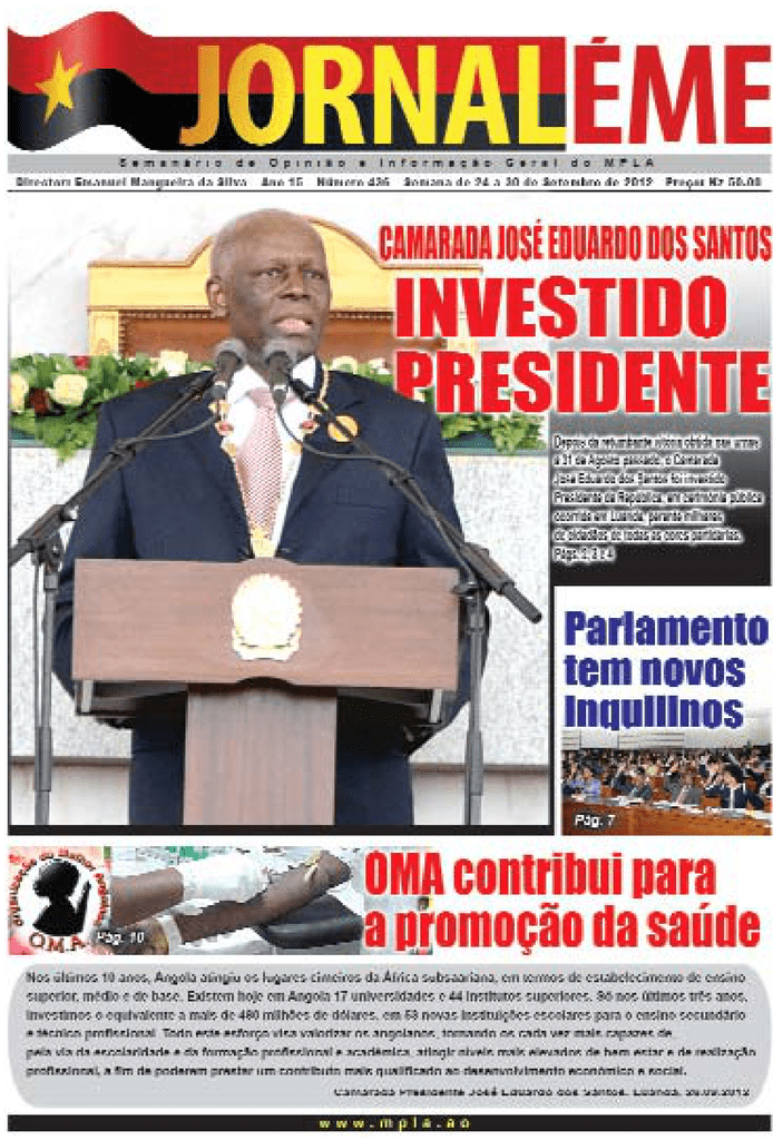 POLÍTICA S e m a n a d e 2 4 a 3 0 d e S e t e m b r o d e 2 0 1 2 Presidente eleito toma posse O Camarada José Eduardo dos Santos foi investido (26/09) em Luanda, nos cargos de Presidente da República e de Comandante-em-Chefe das Forças Armadas Angolanas, em cerimónia realizada no Memorial Dr. António Agostinho Neto, situado no bairro da Kinanga. Foto de OLIVEIRA A tomada de posse do mais alto mandatário da nação foi conferida num acto público, pelo juiz presidente do Tribunal Constitucional, Rui Ferreira, que na ocasião procedeu à leitura da declaração de abertura da cerimónia. No decorrer da cerimónia, foi também empossado o camarada Manuel Domingos Vicente no cargo de Vice - Presidente da República, resultante das eleições gerais de 31 de Agosto último. O ponto mais alto da cerimónia caracterizou-se pelo primeiro pronunciamento do Presidente eleito, no qual estão bem patentes a conquista e a preservação da paz e, os resultados animadores alcançados no esforço de reconstrução nacional. Na história de Angola independente, esta foi a primeira investidura de um Presidente eleito em escrutínio geral, livre, justo, transparente e ordeiro, baseado em sufrágio universal directo e secreto. Com o voto expressivo e inequívoco, o povo fez justiça em eleger o Presidente e confirmar a legitimidade das funções que vem exercendo, reconhecendo ao mesmo tempo o seu exemplo de vida, dedicação à Pátria e às causas mais nobres do povo angolano. funções para os quais foi investido, cumprir e fazer cumprir a Constituição da República de Angola e as leis do país, defender a independência, a sobera- No decorrer da cerimónia o Chefe de Estado eleito prestou Juramento à Nação, com a mão direita sobre a Constituição da República de Angola. Jurou por sua honra, desempenhar com toda a dedicação as nia, a unidade nacional, integridade territorial, a paz, a democracia e promover a estabilidade, o bem-estar e o progresso social de todos os angolanos. Na sequência, o Presidente da República assinou o termo de posse e o respectivo termo individual. O Venerando Juiz Conselheiro Presidente do Tribunal Constitucional, Rui Ferreira, ratificou os dois instrumentos, impôs o medalhão, incrustou na lapela do lado esquerdo do casaco o crachá Presidencial e, saudou-o. Após felicitações, o Presidente da República proferiu o seu discurso à Nação. Ao discursar à Nação, o Camarada Presidente José Eduardo dos Santos agradeceu ao povo angolano a honra e a confiança que lhe conferiu para dirigir os destinos do país. Seguiu-se o desfile de tropas dos três ramos das Forças Armadas Angolanas (Exército, Marinha de Guerra e Força Aérea Nacional). No final da cerimónia foram disparadas 21 salvas de canhão e entoado o Hino da República. Milhares de populares, entre diversas individualidades políticas, religiosas, tradicionais e diplomáticas, acorreram ao local para assistirem o evento. Por Joaquim Guilherme Foto de OLIVEIRA Foto de OLIVEIRA Foto de JOÃO LUÍS INSCRITO NO MINISTÉRIO DA COMUNICAÇÃO SOCIAL SOB O Nº: 129/B/96 Propriedade: MPLA www.mpla.ao DIRECÇÃO - Director: Emanuel Mangueira, Administrador: Fernando Jaime ([email protected]), Chefe de Redacção: Herminia Tiny ([email protected]) - REDACÇÃO - Reconstrução & Desenvolvimento: Estêvão S. Rodrigues (Editor); Sociedade: Hermínia Tiny (Editora); Juventude, Mulher e Família: João Valente; Actualidade: Luzolo Maria; Cultura, Figuras & Factos e Desporto: Ferraz Neto (Editor) - Fotografia: Joaquim Guilherme (Editor) e Hélder Neto - Concepção Gráfica e Composição: Leonel Ganho (Editor) e António Pompílio - Secretário de Redacção: Joaquim Domingos. - ADMINISTRAÇÃO Contabilidade: Fátima Daniel, Relações Públicas e Marketing: Marisa de Oliveira (Chefe) e Ângelo Vunda, Distribuição e Vendas: Augusto Paixão (Chefe) e José Mambo, Transportes: João Agostinho - CORRESPONDENTES - Benguela: António Gonçalves, Cabinda: Vuvu Matualunda, Lunda-Sul: Francisco Memória, Uíge: Santos Kiala - DIRECÇÃO, ADMINISTRAÇÃO E REDACÇÃO: Sede Nacional do MPLA - 3º andar/DIP/CC. - TELEFAX: 222 - 32 20 43; TELEFONE: 222 - 32 31 61; EMAIL: [email protected]; CAIXA POSTAL: 936 - Luanda - AGÊNCIA DE NOTÍCIAS: ANGOP; RESPONSABILIDADE EDITORIAL: Secretariado do Bureau Político do MPLA; TIRAGEM: 10.000 exemplares. 2 S e m a n a d e 2 4 a 3 0 d e S e t e m b r o d e 2 0 1 2 POLÍTICA DISCURSO DO CAMARADA JOSÉ EDUARDO DOS SANTOS, NA SUA INVESTIDURA COMO PRESIDENTE DA REPÚBLICA DE ANGOLA "Excelentíssimo senhor juiz presidente do Tribunal Supremo, Venerandos juízes do Tribunal Constitucional, Senhor presidente da Comissão Nacional Eleitoral, Ilustres convidados, Minhas senhoras e meus senhores, Este é um momento muito especial para o povo angolano, para o Partido MPLA e para mim mesmo. Em conformidade com os resultados das Eleições Gerais, do passado dia 31 de Agosto e nos termos do Artigo 114º da Constituição da República, acabo de ser empossado, pelo senhor presidente do Tribunal Constitucional, como Presidente da República de Angola. O país já realizou duas outras eleições democráticas e multipartidárias, em que uma clara maioria votou a favor do MPLA e do seu líder. O facto de, só hoje, ter lugar esta cerimónia formal de investidura significa que, desta vez, todas as possíveis dúvidas anteriores foram completamente esclarecidas. Eu agradeço, do fundo do meu coração, a honra e a confiança que o povo angolano me conferiu, para dirigir os destinos do país, reafirmando, assim, a sua anterior posição, numa clara demonstração de coerência e de maturidade política. Agradeço, também, aos membros da minha família e a todos aqueles que me ajudaram, durante a Campanha Eleitoral, a levar a minha mensagem e a do MPLA, ao conhecimento de todos os angolanos. Os eleitores votaram, escolheram os dirigentes do país e estamos aqui para respeitar a sua vontade. Tratou