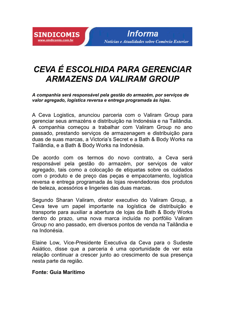 CEVA É ESCOLHIDA PARA GERENCIAR ARMAZENS DA VALIRAM GROUP A companhia será responsável pela gestão do armazém, por serviços de valor agregado, logística reversa e entrega programada às lojas. A Ceva Logistics, anunciou parceria com o Valiram Group para gerenciar seus armazéns e distribuição na Indonésia e na Tailândia. A companhia começou a trabalhar com Valiram Group no ano passado, prestando serviços de armazenagem e distribuição para duas de suas marcas, a Victoria’s Secret e a Bath & Body Works na Tailândia, e a Bath & Body Works na Indonésia. De acordo com os termos do novo contrato, a Ceva será responsável pela gestão do armazém, por serviços de valor agregado, tais como a colocação de etiquetas sobre os cuidados com o produto e de preço das peças e empacotamento, logística reversa e entrega programada às lojas revendedoras dos produtos de beleza, acessórios e lingeries das duas marcas. Segundo Sharan Valiram, diretor executivo do Valiram Group, a Ceva teve um papel importante na logística de distribuição e transporte para auxiliar a abertura de lojas da Bath & Body Works dentro do prazo, uma nova marca incluída no portfólio Valiram Group no ano passado, em diversos pontos de venda na Tailândia e na Indonésia. Elaine Low, Vice-Presidente Executiva da Ceva para o Sudeste Asiático, disse que a parceria é uma oportunidade de ver esta relação continuar a crescer junto ao crescimento de sua presença nesta parte da região. Fonte: Guia Marítimo