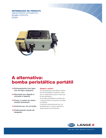 INFORMAÇÃO DE PRODUTO AMOSTRADOR AUTOMÁTICO BOMBA PORTÁTIL SIGMA A alternativa: bomba peristáltica portátil ¾ Extremamente leve (apenas 5,8 kg) e pequena ¾ Operação por ligação à corrente e bateria ¾ Preço e custos de manutenção favoráveis ¾ Controlo por um só botão ¾ Praticamente isento de desgaste Simples e prático Os amostradores automáticos existentes são demasiado complexos, pesados ou dispendiosos para a maior parte das aplicações. As bombas peristálticas portáteis são a solução ideal nos sectores municipal e industrial. A bomba é extremamente leve, de operação fácil, a preços atraentes e quase isenta de manutenção. BOMBA PORTÁTIL_SIGMA Dados técnicos Princípio de recolha automática de amostras Bomba Altura de elevação das amostras Tubagem de sucção Sistema de controlo Alimentação Envólucro Temperatura das amostras Dimensões Peso Passível de alterações Serviços HACH LANGE Princípio peristáltico Bomba peristáltica de alta velocidade, de 2 rolamentos de compressão Máx. 8 metros Tubo em silicone (diâmetro interno de 9,5 mm) Possibilidade de operação da bomba em ambas as direcções (lavagem e recolha de amostras). Bateria recarregável (6 Ah, 12 volts, bateria de electrólito de gel) ou por ligação à corrente (220 V, 50 Hz) Em plástico, resistente ao impacto Corpo da bomba em Delrin® reforçado por fibra de vidro, resistente ao impacto e à corrosão 0 a +50 °C 350 x 130 x 180 mm (A x L x P) Inc. bateria/unidade de alimentação 5,8 kg Assistęncia técnica no local pela nossa equipa no terreno. Reparações e contratos de manutenção. Redução de custos na optimização do processo com o trailer HACH LANGE. Operação confiante de todos os equipamentos, graças à flexibilidade dos nossos serviços e contratos de manutenção. www.hach-lange.pt – actualizado e seguro, com possibilida de downloads, informações e aquisições. DOC 063.79.03828.Jul06 Modo de funcionamento da robusta bomba peristáltica SIGMA Informação ao cliente regular por correio e email.