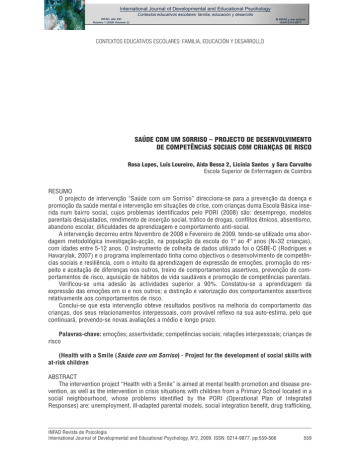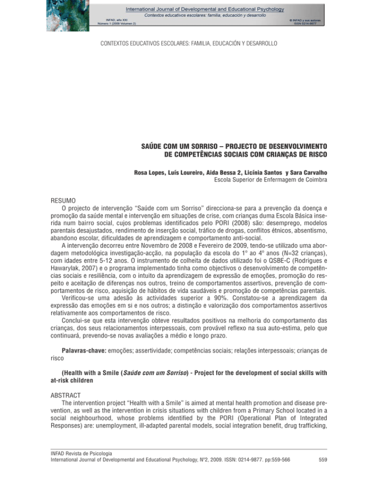 CONTEXTOS EDUCATIVOS ESCOLARES: FAMILIA, EDUCACIÓN Y DESARROLLO SAÚDE Ú COM UM SORRISO – PROJECTO DE DESENVOLVIMENTO DE COMPETÊNCIAS SOCIAIS COM CRIANÇAS DE RISCO Rosa Lopes, Luís Loureiro, Aida Bessa 2, Licínia Santos y Sara Carvalho Escola Superior de Enfermagem de Coimbra RESUMO O projecto de intervenção “Saúde com um Sorriso” direcciona-se para a prevenção da doença e promoção da saúde mental e intervenção em situações de crise, com crianças duma Escola Básica inserida num bairro social, cujos problemas identificados pelo PORI (2008) são: desemprego, modelos parentais desajustados, rendimento de inserção social, tráfico de drogas, conflitos étnicos, absentismo, abandono escolar, dificuldades de aprendizagem e comportamento anti-social. A intervenção decorreu entre Novembro de 2008 e Fevereiro de 2009, tendo-se utilizado uma abordagem metodológica investigação-acção, na população da escola do 1º ao 4º anos (N=32 crianças), com idades entre 5-12 anos. O instrumento de colheita de dados utilizado foi o QSBE-C (Rodrigues e Hawarylak, 2007) e o programa implementado tinha como objectivos o desenvolvimento de competências sociais e resiliência, com o intuito da aprendizagem de expressão de emoções, promoção do respeito e aceitação de diferenças nos outros, treino de comportamentos assertivos, prevenção de comportamentos de risco, aquisição de hábitos de vida saudáveis e promoção de competências parentais. Verificou-se uma adesão às actividades superior a 90%. Constatou-se a aprendizagem da expressão das emoções em si e nos outros; a distinção e valorização dos comportamentos assertivos relativamente aos comportamentos de risco. Conclui-se que esta intervenção obteve resultados positivos na melhoria do comportamento das crianças, dos seus relacionamentos interpessoais, com provável reflexo na sua auto-estima, pelo que continuará, prevendo-se novas avaliações a médio e longo prazo. Palavras-chave: emoções; assertividade; competências sociais; relações interpessoais; crianças de risco (Health with a Smile (Saúde com um Sorriso) - Project for the development of social skills with at-risk children ABSTRACT The intervention project “Health with a Smile” is aimed at mental health promotion and disease prevention, as well as the intervention in crisis situations with children from a Primary School located in a social neighbourhood, whose problems identified by the PORI (Operational Plan of Integrated Responses) are: unemployment, ill-adapted parental models, social integration benefit, drug trafficking, INFAD Revista de Psicología International Journal of Developmental and Educational Psychology, Nº2, 2009. ISSN: 0214-9877. pp:559-566 559 BEHAVIORAL AND COGNITIVE FUNCTIONING AFTER TRAUMATIC BRAIN INJURY ethnic conflicts, absenteeism, school dropout, learning difficulties and antisocial behaviour. This intervention was conducted from November 2008 to February 2009 and an intervention-action methodological approach was used with 1st- through 4th-grade children (N=32 children), aged 5-12 years. The data collection instrument used was the QSBE-C (Children Health and Well-Being Perception Questionnaire-Rodrigues & Hawarylak, 2007) and the program goals were: the development of social skills and resilience aimed at learning emotional expression, promoting respect for and acceptance of the differences in others, practicing assertive behaviours, preventing risk behaviours, acquiring healthy habits and promoting parenting skills. The participation in the activities was higher than 90%. The learning of emotional expression in oneself and others, as well as the distinction and valuation of assertive behaviours concerning risk behaviours were achieved. This intervention had positive results since it improved children’s behaviour and their interpersonal relationships, with a potential impact on their self-esteem. Therefore, it will continue to be implemented and new interventions are expected to occur in the medium- and long-term. Keywords: emotions; assertiveness; social skills; interpersonal relationships; at-risk children INTRODUÇÃO Os problemas de saúde mental são cada vez mais frequentes na sociedade e não se restringem à idade adulta. O Relatório Mundial de Saúde (OMS, 2001), salienta que os transtornos mentais e comportamentais são frequentes durante a infância e adolescência, sendo que 10% a 20% das crianças apresentam um ou mais problemas mentais, muitos deles precursores de incapacidade na idade adulta. O investimento na saúde mental das crianças e adolescentes é a acção com melhor custo/eficácia que pode ser tomada, para contrariar o aumento contínuo dos problemas mentais na população (WHO, 2004). Deste modo e, de acordo com o relatório da Comissão Nacional para a Reestruturação dos Serviços de Saúde Mental (2007), a saúde mental da criança e do adolescente deve ser reconhecida com uma prioridade nacional, no contexto da promoção da saúde global da população. Neste recomenda-se a criação de projectos comunitários dirigidos à segunda infância e adolescência, com objectivos orientados para a escola, locais privilegiados para a promoção da saúde e prevenção da saúde mental, através de intervenções para promover um bom ambiente escolar, o sucesso na aprendizagem, o aumento das competências sociais, a resiliência e reduzir o risco de perturbações mentais. No mesmo sentido, o Plano Nacional de Saúde Mental 2007-2016, aprovado em 2008, que consagra a saúde mental como uma prioridade de saúde pública, realça que deverão ser tomadas medidas para a sua reestruturação, considerando urgente desenvolver serviços e programas de saúde que permitam a promoção da saúde mental da criança e adolescentes. Depois da família, a escola é o agente mais importante de socialização da criança. Com a entrada na escola esta entra num contexto social mais amplo e 