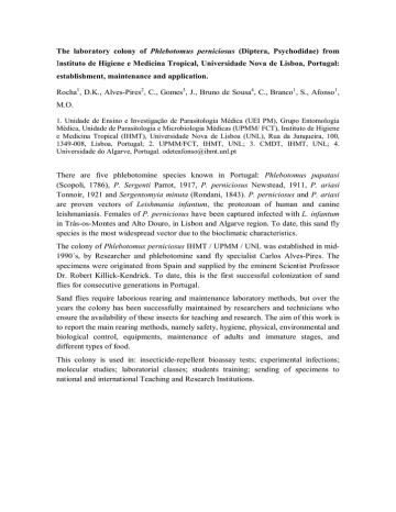 The laboratory colony of Phlebotomus perniciosus (Diptera, Psychodidae) from Instituto de Higiene e Medicina Tropical, Universidade Nova de Lisboa, Portugal: establishment, maintenance and application. Rocha1, D.K., Alves-Pires2, C., Gomes3, J., Bruno de Sousa4, C., Branco1, S., Afonso1, M.O. 1. Unidade de Ensino e Investigação de Parasitologia Médica (UEI PM), Grupo Entomologia Médica, Unidade de Parasitologia e Microbiologia Médicas (UPMM/ FCT), Instituto de Higiene e Medicina Tropical (IHMT), Universidade Nova de Lisboa (UNL), Rua da Junqueira, 100, 1349-008, Lisboa, Portugal; 2. UPMM/FCT, IHMT, UNL; 3. CMDT, IHMT, UNL; 4. Universidade do Algarve, Portugal. [email protected] There are five phlebotomine species known in Portugal: Phlebotomus papatasi (Scopoli, 1786), P. Sergenti Parrot, 1917, P. perniciosus Newstead, 1911, P. ariasi Tonnoir, 1921 and Sergentomyia minuta (Rondani, 1843). P. perniciosus and P. ariasi are proven vectors of Leishmania infantum, the protozoan of human and canine leishmaniasis. Females of P. perniciosus have been captured infected with L. infantum in Trás-os-Montes and Alto Douro, in Lisbon and Algarve region. To date, this sand fly species is the most widespread vector due to the bioclimatic characteristics. The colony of Phlebotomus perniciosus IHMT / UPMM / UNL was established in mid1990´s, by Researcher and phlebotomine sand fly specialist Carlos Alves-Pires. The specimens were originated from Spain and supplied by the eminent Scientist Professor Dr. Robert Killick-Kendrick. To date, this is the first successful colonization of sand flies for consecutive generations in Portugal. Sand flies require laborious rearing and maintenance laboratory methods, but over the years the colony has been successfully maintained by researchers and technicians who ensure the availability of these insects for teaching and research. The aim of this work is to report the main rearing methods, namely safety, hygiene, physical, environmental and biological control, equipments, maintenance of adults and immature stages, and different types of food. This colony is used in: insecticide-repellent bioassay tests; experimental infections; molecular studies; laboratorial classes; students training; sending of specimens to national and international Teaching and Research Institutions.