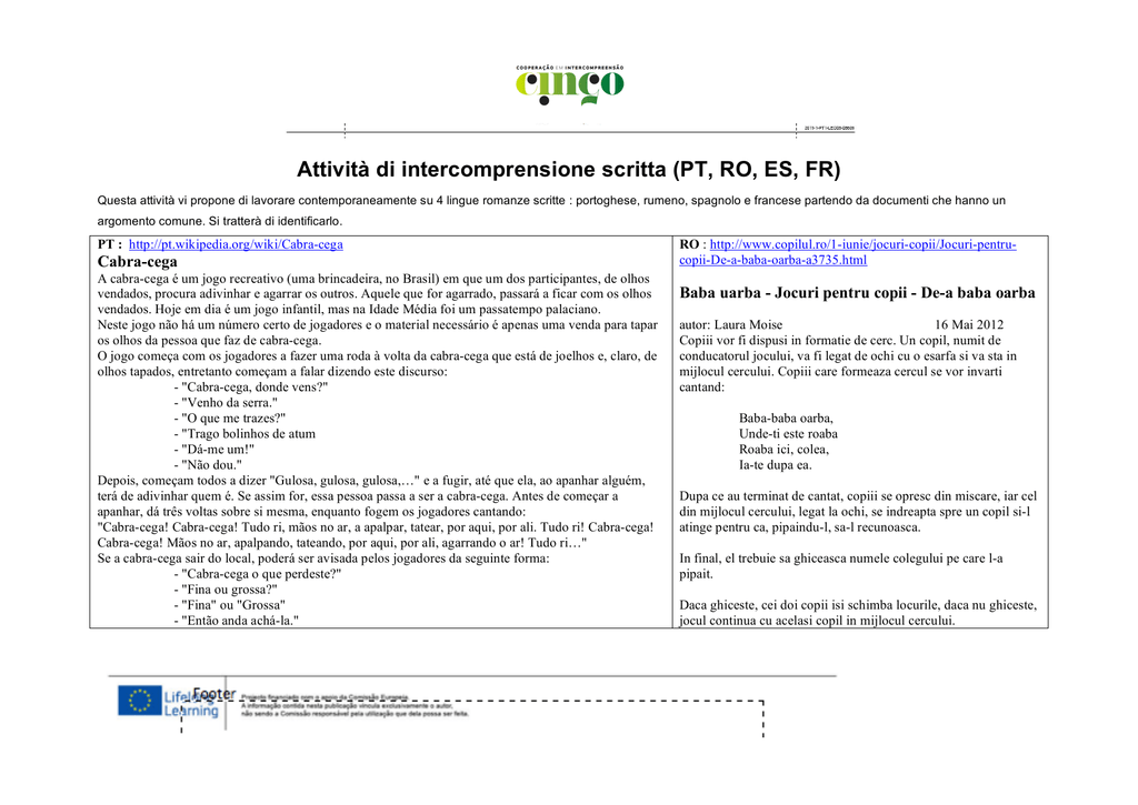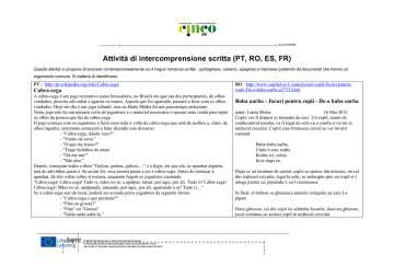 Attività di intercomprensione scritta (PT, RO, ES, FR) Questa attività vi propone di lavorare contemporaneamente su 4 lingue romanze scritte : portoghese, rumeno, spagnolo e francese partendo da documenti che hanno un argomento comune. Si tratterà di identificarlo. PT : http://pt.wikipedia.org/wiki/Cabra-cega Cabra-cega A cabra-cega é um jogo recreativo (uma brincadeira, no Brasil) em que um dos participantes, de olhos vendados, procura adivinhar e agarrar os outros. Aquele que for agarrado, passará a ficar com os olhos vendados. Hoje em dia é um jogo infantil, mas na Idade Média foi um passatempo palaciano. Neste jogo não há um número certo de jogadores e o material necessário é apenas uma venda para tapar os olhos da pessoa que faz de cabra-cega. O jogo começa com os jogadores a fazer uma roda à volta da cabra-cega que está de joelhos e, claro, de olhos tapados, entretanto começam a falar dizendo este discurso: - "Cabra-cega, donde vens?" - "Venho da serra." - "O que me trazes?" - "Trago bolinhos de atum - "Dá-me um!" - "Não dou." Depois, começam todos a dizer "Gulosa, gulosa, gulosa,…" e a fugir, até que ela, ao apanhar alguém, terá de adivinhar quem é. Se assim for, essa pessoa passa a ser a cabra-cega. Antes de começar a apanhar, dá três voltas sobre si mesma, enquanto fogem os jogadores cantando: "Cabra-cega! Cabra-cega! Tudo ri, mãos no ar, a apalpar, tatear, por aqui, por ali. Tudo ri! Cabra-cega! Cabra-cega! Mãos no ar, apalpando, tateando, por aqui, por ali, agarrando o ar! Tudo ri…" Se a cabra-cega sair do local, poderá ser avisada pelos jogadores da seguinte forma: - "Cabra-cega o que perdeste?" - "Fina ou grossa?" - "Fina" ou "Grossa" - "Então anda achá-la." RO : http://www.copilul.ro/1-iunie/jocuri-copii/Jocuri-pentrucopii-De-a-baba-oarba-a3735.html Baba uarba - Jocuri pentru copii - De-a baba oarba autor: Laura Moise 16 Mai 2012 Copiii vor fi dispusi in formatie de cerc. Un copil, numit de conducatorul jocului, va fi legat de ochi cu o esarfa si va sta in mijlocul cercului. Copiii care formeaza cercul se vor invarti cantand: Baba-baba oarba, Unde-ti este roaba Roaba ici, colea, Ia-te dupa ea. Dupa ce au terminat de cantat, copiii se opresc din miscare, iar cel din mijlocul cercului, legat la ochi, se indreapta spre un copil si-l atinge pentru ca, pipaindu-l, sa-l recunoasca. In final, el trebuie sa ghiceasca numele colegului pe care l-a pipait. Daca ghiceste, cei doi copii isi schimba locurile, daca nu ghiceste, jocul continua cu acelasi copil in mijlocul cercului. ES : http://es.wikipedia.org/wiki/La_gallina_ciega_%28Goya %29 La gallina ciega (Goya) El cuadro muestra muchachos y muchachas jugando al popular pasatiempo de «la gallina ciega», con un personaje vendado en el centro que intenta tentar a los demás, que bailan en corro, con una gran cuchara. Los jóvenes están vestidos de majos y majas, atuendo de las capas humildes de la sociedad española con que los aristócratas (como los de este cuadro) gustaron de vestir. Algunos otros, con casacas de terciopelo y tocados de plumas, siguen en cambio los dictados de la moda de las clases altas venida de Francia. La composición está resuelta alternando los personajes entre los huecos que dejan los situados en primer y último término, y contrastando el joven que se agacha a la derecha para esquivar el cucharón con el que le intenta tocar y la mujer inclinada hacia atrás con otro joven que lo hace hacia adelante. El cuadro es un exponente decantado del estilo galante o Rococó, y sus rasgos de estilo característicos: vivacidad, inmediatez, curiosidad, cromatismo de suaves rosas, texturas de gasa en las faldas de las mujeres, un paisaje de fondo luminoso y el reflejo de un momento encantador de disfrute de la vida no exento de posibilidades de flirteo. FR : http://fr.wikipedia.org/wiki/Colin-maillard Colin-maillard Le jeu de Colin-maillard est une variante du jeu de chat. Description Le chasseur a les yeux bandés et les chassés tournent autour de lui (sans trop s'éloigner) en évitant de se faire toucher. Si le chasseur réussit à toucher un autre joueur, celui-ci s'immobilise et laisse le chasseur lui toucher le visage. Si le chasseur réussit à reconnaître la personne au toucher, alors celle-ci prend la place du chasseur. Ses variantes proposent de jouer avec une clochette ou une baguette. Précautions Puisque l'un des joueurs a les yeux bandés, il est important de jouer dans un espace sans obstacles, pour que ce joueur ne se fasse pas mal. Au XVIIIe siècle où ce jeu est souvent représenté dans des peintures de scènes galantes, on lançait le cri d'alerte « gare le pot au noir » ou « gare le pot à la graisse » lorsque le chasseur risquait de se heurter à un obstacle. Origine du nom Le nom du jeu viendrait de Jean Colin-Maillard, un guerrier de Belgique, ayant combattu le comte de Louvain au Xe siècle et qui eut les yeux crevés au cours d'une bataille, mais qui continua à se battre, frappant au hasard tout autour de lui. Ce visage aux yeux crevés est représenté sur une sculpture en pierre du portrait du valeureux guerrier Johan Coley Maillard dit « le Grand Maillard » et de sa femme Jeanne de Seille réalisée sur une des cheminées monumentales de l'ancien Château de Landreville (Ardennes), demeure française de sa famille. 1. Obiettivo : prima di leggere, elaborare un’ipotesi di significato Senza leggere dettagliatamente il testo, ma osservando soltanto la sagoma di ogni documento, l’immagine complessiva del testo che offre, quali ipotesi si possono fare sui contenuti? Che cosa lo suggerisce? (massimo 5 mn) Documento PT :……………………………………………………………………………………………………………………………………………………………………………………… Documento RO :…………………………………………………………………………………………………