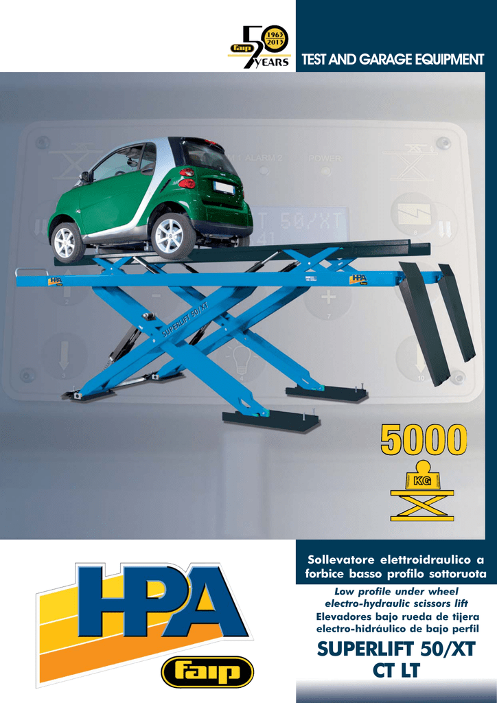 TEST AND GARAGE EQUIPMENT Sollevatore elettroidraulico a forbice basso profilo sottoruota Low profile under wheel electro-hydraulic scissors lift Elevadores bajo rueda de tijera electro-hidráulico de bajo perfil SUPERLIFT 50/XT CT LT SUPERLIFT 50/XT CT LT Sollevatore elettroidraulico sottoruota per assetto ruote. Under wheel electro-hydraulic scissors lift for wheel alignment. Elevador bajo rueda electrohidráulico para alilineación de ruedas. . Caratteristiche generali Lelettronica di controllo è dotata di un display alfanumerico con numerose funzioni per lutente, fra cui la possibilità di visualizzare laltezza del ponte e impostare larresto del sollevatore allaltezza desiderata. LIFT-TABLE innovativo, in grado di sollevare ogni tipo di veicolo e con portata 5000 Kg come il sollevatore principale. Lasse anteriore del veicolo viene posizionato in un punto fisso del sollevatore (dove sono presenti i piatti rotanti), indipendentemente dal passo del veicolo e senza nessuna regolazione successiva. Lincavo piatti rotanti e le piastre oscillanti sono registrabili per ottenere una perfetta planarità delle pedane. Doppia pedana oscillante posteriore a basso attrito. Lallineamento delle pedane è garantito da un circuitoelettroidraulico in anello chiuso. Grazie alla gestione proporzionale dellidraulica lallineamento delle pedane si presenta privo di oscillazioni e costante durante tutta la corsa di sollevamento. Main features The control electronics feature an alphanumeric display allowing access to a number of user functions, including viewing lift height from ground and setting the desired arrest height for the lift. The innovative LIFT-TABLE, able to lift all types of vehicles and with a 5000 Kg capacity like the main lift. The vehicles front axle is positioned in a lifts fixed point (where there are the turntables), independently from the vehicle wheel base and without any further regulation. The recesses for the turn plates and slip plates are adjustable to ensure perfect planarity of the runways. Low friction dual rear slip plate. The runways are kept correctly aligned by a closed loop electrohydraulic circuit. Proportional hydraulic control ensures that, throughout the entire vertical travel, the runways move smoothly in perfect alignment and with no oscillation. Características générales La electrónica de control cuenta con una pantalla alfanumérica con varias funciones para el usuario, entre las cuales se encuentra la posibilidad de visualizar la altura del elevador y programar la parada del mismo en la altura deseada. LIFT-TABLE innovador, capaz de levantar cualquier tipo devehículo y con una capacidad de 5000 Kg como elevador principal. El eje delantero del vehículo está posicionado en un punto fijo del elevador (donde están presentes los platos giratorios) independientemente de la batalla del vehículo y sin ninguna regulación sucesiva. La ranura de los platos giratorios y las placas oscilantes son regulables para lograr que las plataformas queden perfectamente planas. Doble plataforma oscilante trasera de baja fricción. La alineación de las plataformas está garantizada por un circuito electrohidráulico de anillo cerrado. Gracias a la gestión proporcional de la hidráulica, la alineación de las plataformas se realiza sin oscilaciones y de manera constante durante toda la carrera de elevación. Elektrohydraulische scherenhebebühne für Achsvermessung. Pont élévateur électro-hydraulique pour le contrôle de géométrie. Elevador electro-idràulico para alinhamento das rodas. SUPERLIFT 50/XT CT LT Hauptmerkmale Die Steuerelektronik verfügt über ein alphanumerisches Display mit zahlreichen Benutzerfunktionen, wie der Möglichkeit, die Höhe der Hebebühne anzuzeigen und ein Anhalten der Hebebühne auf der gewünschten Höhe einzustellen. Innovativer LIFT-TABLE, der jeden Fahrzeugtyp anhebt, mit einer Tragfähigkeit von 5000 kg wie die Haupthebebühne. Die Vorderachse des Fahrzeuges wird in einem fixierten Punkt (wo die Drehteller liegen) positioniert, unabhängig von dem Radstand und ohne weitere Anpassungen. Die Aussparung für die Drehteller und die Schiebeplatten sind einstellbar, um eine vollkommene Ebenheit der Schienen zu erreichen. Doppelte Schiebeplatte im hinteren Bereich von geringer Reibung. Die Ausrichtung der Schienen wird durch eine elektrohydraulische Anlage mit geschlossenem Regelkreis gewährleistet. Dank der Proportionalsteuerung der Hydraulik ist die Schienenausrichtung während der gesamten Hubfahrt schwingungsfrei und konstant. Caractéristiques générales Lélectronique de contrôle comprend notamment un écran alphanumerique multifonctions, permettant notamment dafficher la hauteur de lélévateur et de paramétrer son arrêt à la hauteur Características funcionales souhaitée. TABLE ELEVATRICE (LT) innovante, en mesure de soulever tout type de véhicule et dune portée de 5 000 kg, comme le pontélévateur principal. Lessieu avant du véhicule est positionné dans un point bien déterminé (où se trouvent les plateaux pivotants), indépendamment de lempattement du véhicule et sans aucun autre réglage. Le logement des plateaux et des plaques oscillants est réglable afin dobtenir une planéité parfaite des chemins de roulement. Double plate-forme oscillante arrière à faible frottement. Lalignement des chemins de roulement est garanti par un circuit électrohydraulique à anneau fermé. Grâce à la gestion proportionnelle de la robinetterie, les chemins de roulement salignent sans oscillations et lalignement reste constant pendant toute la durée du levage. Características gerais A electrónica de controlo é equipada com um ecrã alfanumérico com numerosas funções para o usuário, entre as quais a possibilidade de visualizar a altura da ponte e programar a paragem do elevador na altura desejada. LIFT-TABLE inovador, capaz de elevar qualquer tipo de veículo e com uma capacidade de 5000 Kg como o elevador principal. O eixo dia