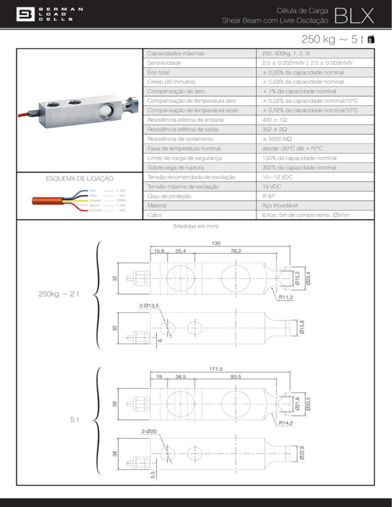 Célula de Carga Shear Beam com Livre Oscilação BLX 250 kg ~ 5 t ESQUEMA DE LIGAÇÃO Azul + EXC. Preto - EXC. Amarelo TERRA Branco + SIG. Vermelho - SIG. Capacidades máximas 250, 500kg, 1, 2, 5t Sensitividade 2,0 ± 0.002mV/V | 2,0 ± 0.003mV/V Erro total ± 0,05% da capacidade nominal Creep (30 minutos) ± 0,03% da capacidade nominal Compensação de zero + 1% da capacidade nominal Compensação de temperatura zero ± 0,02% da capacidade nominal/10°C Compensação de temperatura span ± 0,02% da capacidade nominal/10°C Resistência elétrica de entrada 400 ± 1Ω Resistência elétrica de saída 352 ± 2Ω Resistência de isolamento ≥ 5000 MΩ Faixa de temperatura nominal desde -30ºC até +70°C Limite de carga de segurança 150% da capacidade nominal Sobrecarga de ruptura 300% da capacidade nominal Tensão recomendada de excitação 10~12 VDC Tensão máxima de excitação 15 VDC Grau de proteção IP 67 Material Aço Inoxidável Cabo 6 fios; 5m de comprimento; Ø5mm (Medidas em mm) 130 76,2 32 250kg ~ 2 t Ø23,4 25,4 Ø15,2 15,8 R11,2 6 32 Ø15,8 2-Ø13,5 171,5 93,5 38 5t Ø30,5 38,5 Ø21,8 19 R14,2 5,5 38 Ø22,9 2-Ø20