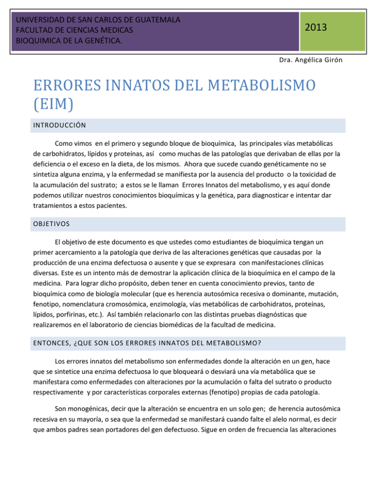 UNIVERSIDAD DE SAN CARLOS DE GUATEMALA FACULTAD DE CIENCIAS MEDICAS BIOQUIMICA DE LA GENÉTICA. 2013 Dra. Angélica Girón ERRORES INNATOS DEL METABOLISMO (EIM) INTRODUCCIÓN Como vimos en el primero y segundo bloque de bioquímica, las principales vías metabólicas de carbohidratos, lípidos y proteínas, así como muchas de las patologías que derivaban de ellas por la deficiencia o el exceso en la dieta, de los mismos. Ahora que sucede cuando genéticamente no se sintetiza alguna enzima, y la enfermedad se manifiesta por la ausencia del producto o la toxicidad de la acumulación del sustrato; a estos se le llaman Errores Innatos del metabolismo, y es aquí donde podemos utilizar nuestros conocimientos bioquímicas y la genética, para diagnosticar e intentar dar tratamientos a estos pacientes. OBJETIVOS El objetivo de este documento es que ustedes como estudiantes de bioquímica tengan un primer acercamiento a la patología que deriva de las alteraciones genéticas que causadas por la producción de una enzima defectuosa o ausente y que se expresara con manifestaciones clínicas diversas. Este es un intento más de demostrar la aplicación clínica de la bioquímica en el campo de la medicina. Para lograr dicho propósito, deben tener en cuenta conocimiento previos, tanto de bioquímica como de biología molecular (que es herencia autosómica recesiva o dominante, mutación, fenotipo, nomenclatura cromosómica, enzimología, vías metabólicas de carbohidratos, proteínas, lípidos, porfirinas, etc.). Así también relacionarlo con las distintas pruebas diagnósticas que realizaremos en el laboratorio de ciencias biomédicas de la facultad de medicina. ENTONCES, ¿QUE SON LOS ERRORES INNATOS DEL METABOLISMO? Los errores innatos del metabolismo son enfermedades donde la alteración en un gen, hace que se sintetice una enzima defectuosa lo que bloqueará o desviará una vía metabólica que se manifestara como enfermedades con alteraciones por la acumulación o falta del sutrato o producto respectivamente y por características corporales externas (fenotipo) propias de cada patología. Son monogénicas, decir que la alteración se encuentra en un solo gen; de herencia autosómica recesiva en su mayoría, o sea que la enfermedad se manifestará cuando falte el alelo normal, es decir que ambos padres sean portadores del gen defectuoso. Sigue en orden de frecuencia las alteraciones UNIVERSIDAD DE SAN CARLOS DE GUATEMALA FACULTAD DE CIENCIAS MEDICAS BIOQUIMICA DE LA GENÉTICA. 2013 ligadas al cromosoma X donde la madre sea la transmisora de la alteración genética. Solo unos pocos trastornos tienen herencia autosómina dominante, donde la presencia de un solo gen defectuoso en uno de los padres es suficiente para que la enfermedad se manifieste. SI SON CONSIDERADAS ENFERMEDADES RARAS, ¿CUÁL ES LA INCIDENCIA DE LOS EIM EN GUATEMALA? ¿PARA QUE ESTUDIARLAS? Los EIM, son consideradas enfermedades raras, de baja incidencia, si las consideramos individualmente pero consideradas en conjunto tienen una incidencia de 1:500 a 1:1500 nacidos vivos y aunque no contamos con estadísticas propias, tomando en cuenta que la tasa de natalidad para 2011 reportada fue de 26,048 por cada 1,000habitantes (hipotéticamente nacen 26 a 52 pacientes por año con EIM), el toparnos al menos con un paciente con esta patología es viable; además recordemos que solo el 50% se manifestará en la edad neonatal, el resto puede ser detectados durante la niñez e inclusive se describen casos diagnosticados en adultos . La incidencia individual de las enfermedades metabólicas puede variar en cada región por factores étnicos o raciales. Además con el adelanto de las técnicas diagnosticas, se han tipificado actualmente casi 1000 enfermedades, catalogadas como enfermedades congénitas del metabolismo. En Guatemala se han hecho algunos estudios aisladamente. En el 2010, la Dra. Morales en su tesis de graduación, estudio un grupo de 30 pacientes menores de 15 años con problemas neurológicos hospitalizados en las Obras Sociales del Santo Hermano Pedro, a los que estudió para galactosemia, aminoacidopatías y deficiencia de 17-hidroxiprogestrerona, encontrando 55% positivo para aminoacidopatías. El químico biólogo, Carlos Serrano, proceso muestras de pacientes con retraso psicomotor; de las 90 muestras incluidas en el estudio, las frecuencias obtenidas para cada patología fue: 1.11% de fenilcetonuria, 4.44% de hipotiroidismo y 0% de galactosemia. Por lo tanto, aunque no contamos con estudios a nivel nacional, ni existe un programa de tamizaje neonatal, no conocemos realmente la incidencia de estas en nuestro país, ni cuáles son las más frecuentes; solo contamos con datos de mortalidad general, que reporta que un 5% se debe a anomalías congénitas. El objetivo de estudiarlas, es primero recalcar en la importancia de la bioquímica en la práctica médica, segundo que se den cuenta de que al no sintetizarse una enzima o al ser esta defectuosa, se producirá enfermedad, en este caso heredada, por la mutación en un gen. Además, todos creemos que solo los pediatras, y específicamente los neonatólogos o genetistas debieran conocerlas, sin embargo sabemos que pueden manifestarse a cualquier edad, y con el avance en las técnicas diagnósticas cada vez más enfermedades son consideradas con causa genética heredable, como la diabetes o la UNIVERSIDAD DE SAN CARLOS DE GUATEMALA FACULTAD DE CIENCIAS MEDICAS BIOQUIMICA DE LA GENÉTICA. 2013 hipercolesterinemia familiar. Además, recordemos “No se diagnostica lo que no se piensa y no se piensa lo que no se conoce”. QUE VÍAS METABÓLICAS PUEDEN AFECTARSE? Recordando, el metabolismo de carbohidratos (glucólisis, glucogenólisis, vía de pentosas fosfato, metabolismo de galactosa y fructuosa,etc), lípidos (síntesis de colesterol, síntesis de fosfolípidos, acilcarnitina y beta.-oxidación, etc) y proteínas (ciclo de la urea, transaminacion, etc), la síntesis d
