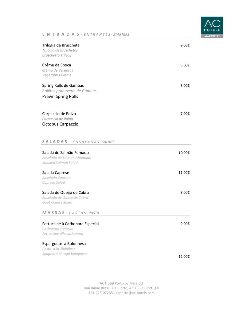 E N T R A D A S - E N T R A N T E S - STARTERS Trilogia de Bruscheta 9.00€ Trilogía de Bruschetas Bruschetta Trilogy Créme da Época 5.00€ Crema de Verduras Vegetables Creme Spring Rolls de Gambas Rollitos primavera de Gambas 8.00€ Prawn Spring Rolls Carpaccio de Polvo 7.00€ Carpaccio de Pulpo Octopus Carpaccio S A L A D A S - E N S A L A D A S - SALADS Salada de Salmão Fumado 10.00€ Ensalada de Salmón Ahumado Smoked Salmon Salad Salada Caprese 11.00€ Ensalada Caprese Caprese Salad Salada de Queijo de Cabra 8.00€ Ensalada de Queso de Cabra Goat Cheese Salad M A S S A S - P A S T A S - PASTA Fettuccine à Carbonara Especial 9.00€ Carbonara Especial Fettuccine alla carbonara Esparguete à Bolonhesa Pasta a la Boloñesa Spaghetti al ragú bolognese AC Hotel Porto by Marriott Rua Jaime Brasil, 40 · Porto, 4350-005 Portugal 351-225-072651 [email protected] 12.00€ P E I X E S - P E S C A D O S - FISHES Polvo à Lagareiro 21.00€ Pulpo al Horno Octopus al forno Arroz de Polvo 17.00€ Arroz de Pulpo Rice of Octopus Filetes de Pescada com Arroz Fresco de Tomate Filetes de Merluza com Arroz de Tomate Hake Fillets With Tomato Rice 14.00€ B A C A L H A U - B A C A L A O - COD Bacalhau Dourado 15.00€ Bacalao Dorado Gold Cod Bacalhau a Saloia 15.00€ Bacalao “ à Saloia” Cod “ à Saloia” Bacalhau com Crosta de Broa e Azeitona Bacalao com Crujiente de Pan de Maíz y Aceituna Cod With Crispy Corn and Olive Bread AC Hotel Porto by Marriott Rua Jaime Brasil, 40 · Porto, 4350-005 Portugal 351-225-072651 [email protected] 18.00€ C A R N E S - C A R N E S - MEAT Bife do Lombo com molho de: Mostarda/ Pimenta /Cogumelos / Queijo da Serra 22.00€ Solomillo de Ternera con salsa: Mostaza/ Pimienta/ Setas/ Queso Beef Tenderlo with Sauce of Mustard/ Peeper/ Mushrooms/Cheese Bife Raspado 14.00€ Hamburguesa de Ternera Beef Burguer Lombinho de Porco Recheado com Alheira 15.00€ Lomo de Cerdo Relleno con Embutido Pork Tenderloin Stuffed with Sausage S O B R E M E S A S - P O S T R E S - DESSERT Mousse de Chocolate e Avelã 6.00€ Mousse de Chocolate y Avellana Nuts and Chocolate Mousse Gelados Variados 5.00€ Helados Variados Varied Ice Creams Fruta Laminada 5.00€ Fruta Laminada Sliced Fruits IVA incluído a taxa legal em vigor Iva Incluido. Vat Included Existe Livro de Reclamações Disponemos de Libro de Reclamaciones Complaint Sheet Available AC Hotel Porto by Marriott Rua Jaime Brasil, 40 · Porto, 4350-005 Portugal 351-225-072651 [email protected]