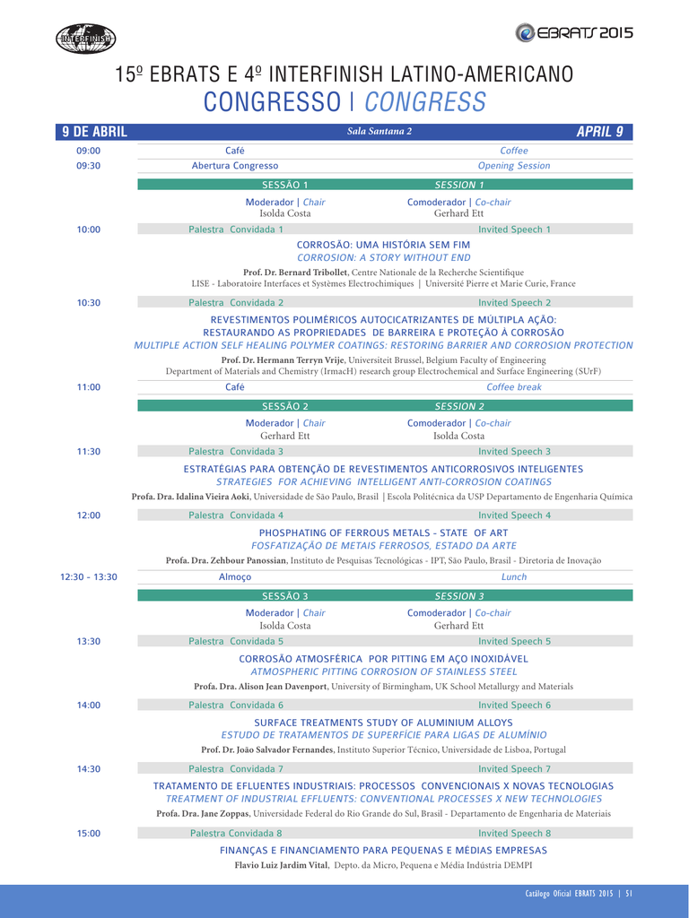 15º EBRATS e 4º INTERFINISH Latino-Americano congresso | congress 9 de abril 09:00 09:30 April 9 Sala Santana 2 Coffee Opening Session Café Abertura Congresso Sessão 1 Session 1 Moderador | Chair Isolda Costa Comoderador | Co-chair Gerhard Ett 10:00 Palestra Convidada 1Invited Speech 1 Corrosão: Uma história sem fim Corrosion: A Story without End Prof. Dr. Bernard Tribollet, Centre Nationale de la Recherche Scientifique LISE - Laboratoire Interfaces et Systèmes Electrochimiques | Université Pierre et Marie Curie, France 10:30 Palestra Convidada 2Invited Speech 2 Revestimentos poliméricos autocicatrizantes de múltipla ação: restaurando as propriedades de barreira e proteção à corrosão Multiple action self healing polymer coatings: restoring barrier and corrosion protection 11:00 Prof. Dr. Hermann Terryn Vrije, Universiteit Brussel, Belgium Faculty of Engineering Department of Materials and Chemistry (IrmacH) research group Electrochemical and Surface Engineering (SUrF) Coffee break Café Sessão 2 Session 2 Moderador | Chair Gerhard Ett Comoderador | Co-chair Isolda Costa 11:30 Palestra Convidada 3Invited Speech 3 Estratégias para obtenção de revestimentos anticorrosivos inteligentes Strategies for achieving intelligent anti-corrosion coatings 12:00 Profa. Dra. Idalina Vieira Aoki, Universidade de São Paulo, Brasil | Escola Politécnica da USP Departamento de Engenharia Química Palestra Convidada 4Invited Speech 4 Phosphating of ferrous metals - state of art Fosfatização de metais ferrosos, estado da arte Profa. Dra. Zehbour Panossian, Instituto de Pesquisas Tecnológicas - IPT, São Paulo, Brasil - Diretoria de Inovação 12:30 - 13:30 Lunch Almoço Sessão 3 Session 3 Moderador | Chair Isolda Costa Comoderador | Co-chair Gerhard Ett 13:30 Palestra Convidada 5Invited Speech 5 Corrosão atmosférica por pitting em aço inoxidável Atmospheric Pitting Corrosion of Stainless Steel Profa. Dra. Alison Jean Davenport, University of Birmingham, UK School Metallurgy and Materials 14:00 Palestra Convidada 6Invited Speech 6 Surface treatments study of aluminium alloys Estudo de Tratamentos de Superfície para Ligas de Alumínio 14:30 Prof. Dr. João Salvador Fernandes, Instituto Superior Técnico, Universidade de Lisboa, Portugal Palestra Convidada 7Invited Speech 7 Tratamento de Efluentes Industriais: Processos convencionais x novas tecnologias Treatment of Industrial Effluents: Conventional processes x new technologies Profa. Dra. Jane Zoppas, Universidade Federal do Rio Grande do Sul, Brasil - Departamento de Engenharia de Materiais 15:00 Palestra Convidada 8Invited Speech 8 Finanças e Financiamento para Pequenas e Médias Empresas Flavio Luiz Jardim Vital, Depto. da Micro, Pequena e Média Indústria DEMPI Catálogo Oficial EBRATS 2015 | 51 15º EBRATS e 4º INTERFINISH Latino-Americano apresentações orais | oral presentation 10 de abril 09:00 Coffee Café Moderador | Chair Gilbert Zoldan 09:30 Comoderador | Co-chair Rubens Carlos da Silva Filho Possibilities to enhance technical Chromium layers Possibilidades de melhoria nas camadas de cromo Klaus Lyendecker Umicore - Alemanha/Germany April 10 Sala Santana 2 09:50 Cr(VI)-free pre-treament for the decorative plating on ABS-polymers Pré-tratamentos para depósitos decorativos livres de Cr(VI) sobre polímeros ABS Anderson Bos Atotech - Brasil/Brazil 10:10Hard anodizing type III and nanoporous anodic aluminium oxide in surface engineering Anodização dura tipo III e óxido de alumínio nanoporosos em engenharia de superfície Xavier Albort Universidade de Barcelona - Espanha/Spain 10:30 Coffee break Café Moderador | Chair Cássia Maria Rodrigues dos Santos 10:50 Comoderador | Co-chair Reinaldo Lopes Aplicação da nanotecnologia no desenvolvimento de novas funções do alumínio e sua transferência tecnológica Application of nanotechnology on the development of new functions of aluminum and its technology transfer Leandro Bronstein Laring - Argentina/Argentina 11:10Efeito da adição de partículas de alumina nas características estruturais e de resistência à corrosão de filmes Zn-Ni eletrodepositados The effect of alumina particles addition on the structural properties and corrosion resistance of electrodeposited Zn-Ni coatings Dra. Zulema Franco INTI-Inst. Nacional de Tecnología Industrial - Argentina/Argentina 11:30 Como salvar recursos naturais na galvanoplastia e agir para a sustentabilidade do planeta How to save natural resources in electroplating and working for planet sustainability Pedro de Araújo Efil - Divisão Galvano - Brasil/Brazil 11:50 Avaliação de sputtering como alternativa à galvanoplastia Evaluation of sputtering as alternative to electroplating Mônia Geiger Metalsinos - Brasil/Brazil 12:10 Redução da geração de efluentes galvânicos aplicando ferramentas de produção mais limpaS (P+L) Reduction the generation of galvanic efluents applying cleaner production tools (P+L) Tatiane Benvenute Lacor-PPgE3m - UFrgS - rS Brasil/Brazil 52 | Catálogo Oficial EBRATS 2015 15º EBRATS e 4º INTERFINISH Latino-Americano apresentações orais | oral presentation 12:30 Lunch Almoço Moderador | Chair Bardia Ett Comoderador | Co-chair Wady Millen Jr. 13:30Novo tratamento híbrido ambientalmente amigável e alternativo à cromatização amarela sobre AA2024-T3 clad New enviromentally friendly hibrid treatment as alternative to yellow chromating on AA2024-T3 clad Wagner Izaltino Alves dos Santos IPEN/cNEN - SP - Brasil/Brazil 13:50Estudo da eficiência do extrato de AlliumSativum como inibidor de corrosão para o aço carbono 1020 em meio de ácido clorídrico Study on the efficiency of AlliumSativum extract as corrosion inhibitor for 1020 carbon steel in chloridric acid environment lhaira Souza Barreto UESc -Ba-Brazil/Brazil 14:10 Revestimentos resistentes à oxidação em altas temperaturas Coatings resistant to high temperature oxidation Gerhard Ett IPT - SP Brasil/Brazil 14:30 Comparação de 