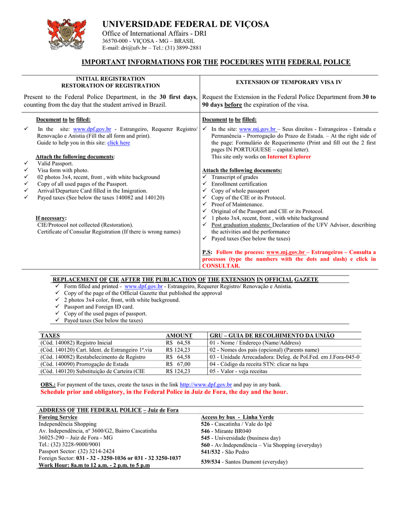 UNIVERSIDADE FEDERAL DE VIÇOSA Office of International Affairs - DRI 36570-000 - VIÇOSA - MG – BRASIL E-mail: [email protected] – Tel.: (31) 3899-2881 IMPORTANT INFORMATIONS FOR THE POCEDURES WITH FEDERAL POLICE INITIAL REGISTRATION RESTORATION OF REGISTRATION EXTENSION OF TEMPORARY VISA IV Present to the Federal Police Department, in the 30 first days, Request the Extension in the Federal Police Department from 30 to counting from the day that the student arrived in Brazil. 90 days before the expiration of the visa. Document to be filled: Document to be filled: In the site: www.dpf.gov.br - Estrangeiro, Requerer Registro/ In the site: www.mj.gov.br – Seus direitos - Estrangeiros - Entrada e Renovação e Anistia (Fill the all form and print). Permanência - Prorrogação do Prazo de Estada. – At the right side of Guide to help you in this site: click here the page: Formulário de Requerimento (Print and fill out the 2 first pages IN PORTUGUESE – capital letter). Attach the following documents: This site only works on Internet Explorer Valid Passport. Visa form with photo. Attach the following documents: 02 photos 3x4, recent, front , with white background Transcript of grades Copy of all used pages of the Passport. Enrollment certification Arrival/Departure Card filled in the Imigration. Copy of whole passaport Payed taxes (See below the taxes 140082 and 140120) Copy of the CIE or its Protocol. Proof of Maintenance. Original of the Passport and CIE or its Protocol. 1 photo 3x4, recent, front , with white background If necessary: CIE/Protocol not collected (Restoration). Post graduation students: Declaration of the UFV Advisor, describing Certificate of Consular Registration (If there is wrong names) the activities and the performance Payed taxes (See below the taxes) P.S: Follow the process: www.mj.gov.br – Estrangeiros – Consulta a processos (type the numbers with the dots and slash) e click in CONSULTAR. REPLACEMENT OF CIE AFTER THE PUBLICATION OF THE EXTENSION IN OFFICIAL GAZETE Form filled and printed - www.dpf.gov.br - Estrangeiro, Requerer Registro/ Renovação e Anistia. Copy of the page of the Official Gazette that published the approval 2 photos 3x4 color, front, with white background. Passport and Foreign ID card. Copy of the used pages of passport. Payed taxes (See below the taxes) TAXES (Cód. 140082) Registro Inicial (Cód. 140120) Cart. Ident. de Estrangeiro 1ª.via (Cód. 140082) Restabelecimento de Registro (Cód. 140090) Prorrogação de Estada (Cód. 140120) Substituição de Carteira (CIE AMOUNT R$ 64,58 R$ 124,23 R$ 64,58 R$ 67,00 R$ 124,23 GRU – GUIA DE RECOLHIMENTO DA UNIÃO 01 - Nome / Endereço (Name/Address) 02 - Nomes dos pais (opcional) (Parents name) 03 - Unidade Arrecadadora: Deleg. de Pol.Fed. em J.Fora-045-0 04 - Código da receita STN: clicar na lupa 05 - Valor - veja receitas OBS.: For payment of the taxes, create the taxes in the link http://www.dpf.gov.br and pay in any bank. Schedule prior and obligatory, in the Federal Police in Juiz de Fora, the day and the hour. ADDRESS OF THE FEDERAL POLICE – Juiz de Fora Foreing Service Independência Shopping Av. Independência, nº 3600/G2, Bairro Cascatinha 36025-290 – Juiz de Fora - MG Tel.: (32) 3228-9000/9001 Passport Sector: (32) 3214-2424 Foreign Sector: 031 - 32 - 3250-1036 or 031 - 32 3250-1037 Work Hour: 8a.m to 12 a.m. - 2 p.m. to 5 p.m Access by bus - Linha Verde 526 - Cascatinha / Vale do Ipê 546 - Mirante BR040 545 - Universidade (business day) 560 - Av.Independência – Via Shopping (everyday) 541/532 - São Pedro 539/534 - Santos Dumont (everyday)