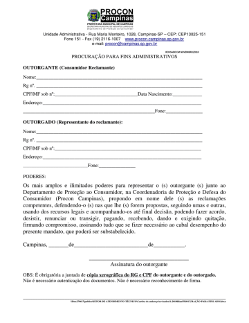 Unidade Administrativa - Rua Maria Monteiro, 1028, Campinas-SP – CEP: CEP13025-151 Fone 151 - Fax (19) 2116-1007 www.procon.campinas.sp.gov.br e-mail: [email protected] REVISADO EM NOVEMBRO/2010 PROCURAÇÃO PARA FINS ADMINISTRATIVOS OUTORGANTE (Consumidor Reclamante) Nome:____________________________________________________________________ Rg nº. ____________________________________________________________________ CPF/MF sob nº:__________________________________Data Nascimento:____________ Endereço:_________________________________________________________________ ______________________________________________________Fone:_______________ OUTORGADO (Representante do reclamante): Nome:____________________________________________________________________ Rg nº. ____________________________________________________________________ CPF/MF sob nº:____________________________________________________________ Endereço:_________________________________________________________________ _____________________________________________________ Fone:_______________ PODERES: Os mais amplos e ilimitados poderes para representar o (s) outorgante (s) junto ao Departamento de Proteção ao Consumidor, na Coordenadoria de Proteção e Defesa do Consumidor (Procon Campinas), propondo em nome dele (s) as reclamações competentes, defendendo-o (s) nas que lhe (s) forem propostas, seguindo umas e outras, usando dos recursos legais e acompanhando-os até final decisão, podendo fazer acordo, desistir, renunciar ou transigir, pagando, recebendo, dando e exigindo quitação, firmando compromisso, assinando tudo que se fizer necessário ao cabal desempenho do presente mandato, que poderá ser substabelecido. Campinas, _______de__________________________de___________. ___________________________________ Assinatura do outorgante OBS: É obrigatória a juntada de cópia xerográfica do RG e CPF do outorgante e do outorgado. Não é necessário autenticação dos documentos. Não é necessário reconhecimento de firma. ___________________________________________________________________________________ \\Pmc270617\publico\SETOR DE ATENDIMENTO TÉCNICO\Cartões de endereço\revisados11.2010lilian\PROCURAÇÃO PARA FINS ADM.docx