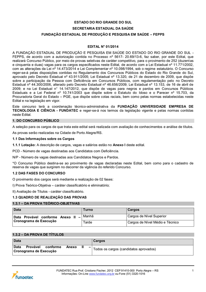 ESTADO DO RIO GRANDE DO SUL SECRETARIA ESTADUAL DA SAÚDE FUNDAÇÃO ESTADUAL DE PRODUÇÃO E PESQUISA EM SAÚDE – FEPPS EDITAL N° 01/2014 A FUNDAÇÃO ESTADUAL DE PRODUÇÃO E PESQUISA EM SAÚDE DO ESTADO DO RIO GRANDE DO SUL FEPPS, de acordo com a autorização contida no Processo nº 5617- 20.69/13-6, faz saber, por este Edital, que realizará Concurso Público, por meio de provas seletivas de caráter competitivo, para o provimento de 252 (duzent as e cinquenta e duas) vagas para os cargos especificados neste Edital, de acordo com a Lei Estadual nº 11.771/2002, com as alterações da Lei nº 14.473/2014 e Lei Complementar nº 10.098/1994, sob o regime estatutário. O Concurso reger-se-á pelas disposições contidas no Regulamento dos Concursos Públicos do Estado do Rio Grande do Sul, aprovado pelo Decreto Estadual nº 43.911/2005; Lei Estadual nº 13.320, de 21 de dezembro de 2009, que dispõe sobre a participação da Pessoa com Deficiência em Concursos Públicos, com regulamentação pelo no Decreto Estadual nº 44.300/2006, alterado pelo Decreto Estadual nº 46.656/2009; Lei Estadual nº 13.153, de 16 de abril de 2009; e na Lei Estadual n° 14.147/2012, que dispõe de vagas para negros e pardos em Concursos Públicos Estaduais e a Lei Federal nº 10.741/2003 que dispõe sobre o Estatuto do Idoso e o Parecer nº 15.703, da Procuradoria Geral do Estado – PGE, que dispõe sobre cotas raciais, bem como pelas normas estabelecidas neste Edital e na legislação em vigor. Este concurso terá a coordenação técnico-administrativa da FUNDAÇÃO UNIVERSIDADE EMPRESA DE TECNOLOGIA E CIÊNCIA - FUNDATEC e reger-se-á nos termos da legislação vigente e pelas normas contidas neste Edital. 1. DO CONCURSO PÚBLICO A seleção para os cargos de que trata este edital será realizada com avaliação de conhecimentos e análise de títulos. As provas serão realizadas na Cidade de Porto Alegre/RS. 1.1 Das Informações sobre os Cargos 1.1.1 Lotação: A descrição de cargos, vagas e salários estão no Anexo I deste edital. PCD - Número de vagas destinadas aos Candidatos com Deficiência. N/P - Número de vagas destinadas aos Candidatos Negros e Pardos. *O Concurso Público destina-se ao provimento de vagas declaradas neste Edital, bem como para o cadastro de reserva de vagas que surgirem no decorrer da vigência do referido Concurso. 1.2 DAS FASES DO CONCURSO O provimento dos cargos será mediante a realização de 02 fases: I) Prova Teórico-Objetiva – caráter classificatório e eliminatório; II) Avaliação de Títulos - caráter classificatório. 1.3 QUADRO DE REALIZAÇÃO DAS PROVAS 1.3.1 – DA PROVA TEÓRICO-OBJETIVAS Data Turno Cargos Data Provável conforme Anexo II – Manhã Cronograma de Execução Tarde Cargos de Nível Superior Cargos de Nível Médio e Técnico 1.3.2 – DA PROVA DE TÍTULOS Data Cargos Data Provável conforme Cronograma de Execução Anexo II – Todos os cargos (candidatos aprovados) FUNDATEC Rua Prof. Cristiano Fischer, 2012 CEP 91410-000 Porto Alegre – RS Informações: On-Line www.fundatec.org.br ou Fone (51) 3320-1016 1 2 DA DIVULGAÇÃO 2.1 A divulgação oficial das informações relativas a este Concurso, até a homologação de seu resultado final, dar-seá mediante publicações, no Diário Oficial do Estado, por meio de Editais ou Avisos. Os editais, na íntegra, avisos e listagens de resultados estarão à disposição dos candidatos na Fundação Universidade Empresa de Tecnologia e Ciências – FUNDATEC, na Rua Professor Cristiano Fischer, n° 2012 - Bairro Partenon, Porto Alegre/RS, e na Internet no endereço http://www.fundatec.org.br. 3 DAS INSCRIÇÕES E SUAS CONDIÇÕES 3.1 As inscrições serão realizadas no período determinado no Anexo II – Do Cronograma de Execução, pela Internet, no sítio da FUNDATEC, http://www.fundatec.org.br , mediante o preenchimento do Requerimento de Inscrição. A FUNDATEC disponibilizará computadores para acesso à Internet, durante o período de inscrições, na sede, sita na Rua Professor Cristiano Fischer, nº. 2.012 – Bairro Partenon, Porto Alegre/RS, no horário das 9h às 17h. 3.2 Requisitos para inscrição em concurso para provimento do cargo: a) b) c) d) e) f) ser brasileiro ou estar amparado pela Lei complementar nº 13.763, de 19 de julho de 2011; encontrar-se no gozo e exercício de seus direitos civis; estar em dia com as obrigações militares e eleitorais; possuir a escolaridade exigida no item 1.1, por ocasião da posse; ter ilibada conduta social, profissional ou funcional e não registrar antecedentes criminais; e, haver recolhido a taxa de inscrição especificada no edital. 3.3 Período: As inscrições serão efetuadas somente pela Internet, a partir das 10 (dez) horas do dia 23 de setembro até as 23 horas e 59 minutos do dia 21 de outubro de 2014, no site www.fundatec.org.br em Concurso Público na FUNDAÇÃO ESTADUAL DE PRODUÇÃO E PESQUISA EM SAÚDE – FEPPS. 3.4 Informações: 3.4.1 Objetivando evitar ônus desnecessário, especialmente quanto ao recolhimento de taxa de inscrição, recomenda-se que o candidato somente efetue a sua inscrição após tomar conhecimento de todos os requisitos exigidos para o concurso, bem como certificar-se de que preenche as condições exigidas para o provimento dos cargos. 3.4.2 Procedimentos para realizar a inscrição via Internet e para o recolhimento do valor da taxa de inscrição: 3.4.2.1 Deverá ser preenchido no Formulário Eletrônico de Inscrição: o nome completo do candidato, o número do CPF e o número do Documento de Identidade que tenha fé pública. Para fins de inscrição nestes Concursos Públicos, serão aceitos como documentos de identidade: as carteiras e/ou cédulas de identidade expedidas pelas Secretarias de Segurança, pelas Forças Armadas, pela Polícia Militar, pelo Ministério das Relações Exteriores; cédulas de identidade fornecidas por Ordens ou Conselhos de Classe, que por Lei Federal valem