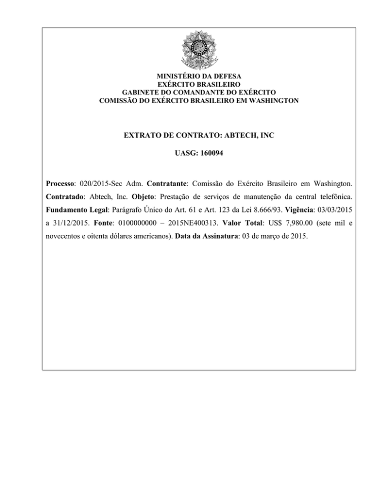 MINISTÉRIO DA DEFESA EXÉRCITO BRASILEIRO GABINETE DO COMANDANTE DO EXÉRCITO COMISSÃO DO EXÉRCITO BRASILEIRO EM WASHINGTON EXTRATO DE CONTRATO: ABTECH, INC UASG: 160094 Processo: 020/2015-Sec Adm. Contratante: Comissão do Exército Brasileiro em Washington. Contratado: Abtech, Inc. Objeto: Prestação de serviços de manutenção da central telefônica. Fundamento Legal: Parágrafo Único do Art. 61 e Art. 123 da Lei 8.666/93. Vigência: 03/03/2015 a 31/12/2015. Fonte: 0100000000 – 2015NE400313. Valor Total: US$ 7,980.00 (sete mil e novecentos e oitenta dólares americanos). Data da Assinatura: 03 de março de 2015.