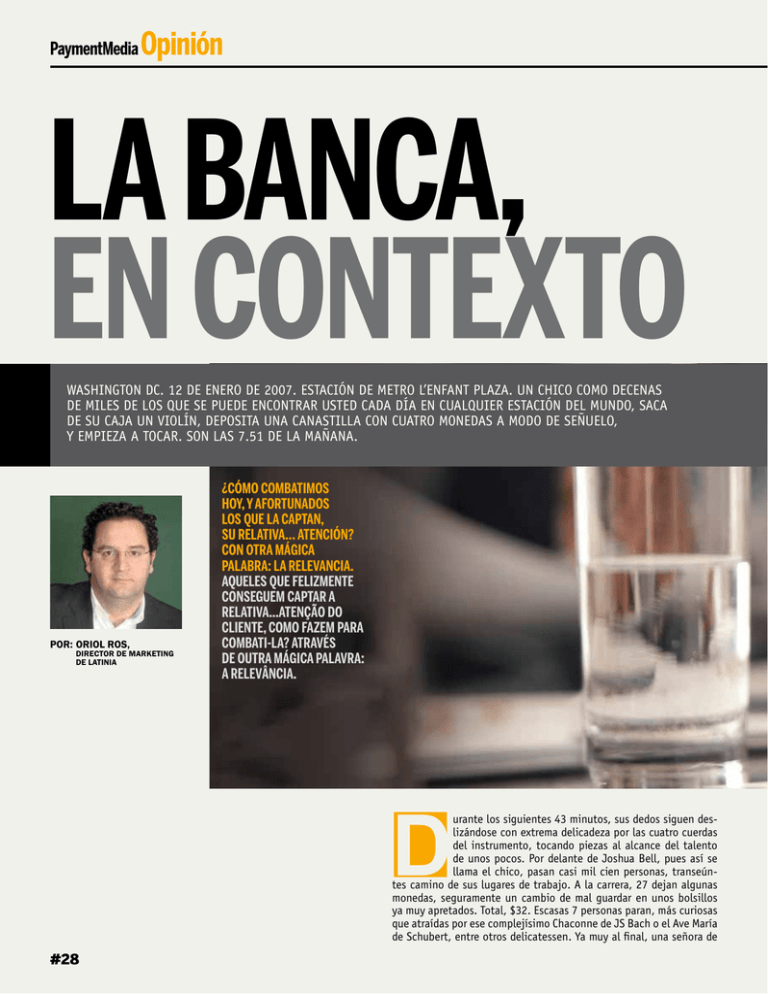 PaymentMedia Opinión La banca, en contexto Washington DC. 12 de enero de 2007. Estación de Metro L’Enfant Plaza. Un chico como decenas de miles de los que se puede encontrar usted cada día en cualquier estación del mundo, saca de su caja un violín, deposita una canastilla con cuatro monedas a modo de señuelo, y empieza a tocar. Son las 7.51 de la mañana. Por:Oriol Ros, director de Marketing de Latinia ¿Cómo combatimos hoy, y afortunados los que la captan, su relativa… atención? Con otra mágica palabra: la relevancia. Aqueles que felizmente conseguem captar a relativa...atenção do cliente, como fazem para combati-la? Através de outra mágica palavra: a relevância. D urante los siguientes 43 minutos, sus dedos siguen deslizándose con extrema delicadeza por las cuatro cuerdas del instrumento, tocando piezas al alcance del talento de unos pocos. Por delante de Joshua Bell, pues así se llama el chico, pasan casi mil cien personas, transeúntes camino de sus lugares de trabajo. A la carrera, 27 dejan algunas monedas, seguramente un cambio de mal guardar en unos bolsillos ya muy apretados. Total, $32. Escasas 7 personas paran, más curiosas que atraídas por ese complejísimo Chaconne de JS Bach o el Ave María de Schubert, entre otros delicatessen. Ya muy al final, una señora de #28 #29 edad avanzada se sitúa frente al chico, y algo embargada por la emoción, balbucea: “Esto sólo puede pasar en DC”. Había reconocido al subterráneo violinista. El chico es Joshua Bell, uno de los mayores virtuosos del violín del mundo, que días antes, y días después, abarrotaría los mejores auditorios del mundo, a razón de $150 la entrada. Ese es el poder del contexto. De él depende el sentido y el valor de un contenido. Pocos ejemplos son capaces de explicar de forma tan contundente qué es el contexto, pero, ¿por qué es importante ahora? Premisas que todos conocemos (y en las que estamos innegociablemente de acuerdo): a) el consumidor actual, siendo el cliente de una entidad financiera uno de los mejores ejemplares de la especie, ha dejado de escucharnos, lo cual, convendrán, supone un problema importante; b) la distancia entre nosotros como entidad y él, por lo tanto, ha crecido (cambiemos tiempo verbal, sigue creciendo); c) su atención se convierte en la moneda de una nueva economía, la de la atención, escasísima por principios (la última vez que se tiene constancia de un cliente que acudió a una oficina atraído por un folleto que le habían buzo- neado fue en un Wells & Fargo de Kentucky, en marzo de 2005). Estas son las variables de una ecuación más compleja de demostrar que la equivalencia entre la masa y la energía (teoría de la relatividad de Einstein). Y es que para relativo, el cliente. ¿Cómo combatimos hoy, y afortunados los que la captan, su relativa… atención? Con otra mágica palabra: la relevancia. Si somos relevantes tendremos su atención, nos repetimos insistentemente. Es nuestra fórmula, nuestra teoría, con la que cada mañana nos levantamos pensando, ¿cómo capto la atención de una persona que recibe más de 3.000 impactos al día? ¿Por qué, a sus ojos y oídos, yo seré distinto de mi competencia? Pero sobre todo, ¿cómo puedo ser relevante? La respuesta está en trastear adecuadamente con el contexto, en el sentido que tiene un contenido u otro ubicado, liberado, entregado o enviado a la persona adecuada, en el momento oportuno, y en el lugar apropiado. Piense en el Chaconne de Bell (Bach) tocado en el metro… o en el Albert Royal Hall. Ese instante, cuasi místico, origina un micro-momento (palabra de Forrester) de serenidad entre cliente y entidad, donde el primero, invadido por una sensación de sorpresa (por lo escasas de las ocasiones) y gratitud (alguien ha pensado en él como individuo y sus circunstancias, tan únicas como su persona), levanta la vista (o la clava en su celular) y pregunta (o clica un botón): ¿qué más me pueden explicar de ese nuevo depósito al 2%? Un gesto espontáneo que anticipa esa olvidada sensación de conversar con su banco. El contexto que todo lo puede es la pócima mágica que convierte en relevante una vulgar promoción de tarjeta de crédito o irrelevante el anuncio de un nuevo depósito con unas condiciones excepcionales, no siendo más complejo que organizar una información ya disponible y convertirla en inteligencia financiera para nuestra entidad. ¿Dónde está, quién tiene ese preciadísimo néctar, ese contenido que debe ayudarnos a captar la atención de nuestro cliente, para que se interese como nunca por lo que siempre estuvo a su disposición pero jamás supimos “decirle”? Repasemos algunas de esas variables, bases para la construcción del mejor contexto para generar y entregar el contenido más relevante. Analicemos su disponibilidad habitual (y conocimiento por nuestra parte). ¿Qué tipo de PaymentMedia Opinión operación acaba de realizar el cliente? Check, ¿qué monto y otros atributos se incluyen en la operación? Doble check, ¿los sociodemográficos del cliente? ¡Por supuesto! ¿Su histórico financiero? ¡Quién no! ¿Dónde –localización, canal, tipo de comercio…- y cuándo ha realizado esa operación? Elemental, ¿no? Ese contenido, materia cruda de la relevancia, representa la antesala de un posible diálogo con la entidad, pero sólo cocinado en tiempo real y emplatado en el contexto oportuno tiene sentido para el cliente, que tras haber dejado de escuchar, solo aceptará contenidos al dente. Demostrémosle que le conocemos y que sabemos qué quiere (¡aunque él lo desconozca, pues si algo es el banco es una fábrica de insights!). ¿Acaso es relevante recibir una oferta promocional cuando ni mi contexto ni mis actos A banca, dentro do contexto Washington DC. Doze de janeiro de 2007. Estação do Metrô L´Enfant Plaza. Um garoto como dezenas de milhares que você pode ver a cada dia em qualquer estação do mundo, pega um violino do estojo, col