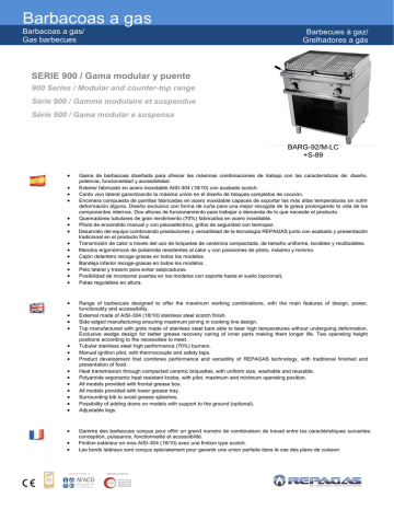 Barbacoas a gas Barbacoas a gas/ Gas barbecues Barbecues à gaz/ Grelhadores a gás SERIE 900 / Gama modular y puente 900 Series / Modular and counter-top range Série 900 / Gamme modulaire et suspendue Série 900 / Gama modular e suspensa BARG-92/M-LC +S-89 Gama de barbacoas diseñada para ofrecer las máximas combinaciones de trabajo con las características de: diseño, potencia, funcionalidad y accesibilidad. Exterior fabricado en acero inoxidable AISI-304 (18/10) con acabado scotch. Canto vivo lateral garantizando la máxima unión en el diseño de bloques completos de cocción. Encimera compuesta de parrillas fabricadas en acero inoxidable capaces de soportar las más altas temperaturas sin sufrir deformación alguna. Diseño exclusivo con forma de cuña para una mejor recogida de la grasa prolongando la vida de los componentes internos. Dos alturas de funcionamiento para trabajar a demanda de lo que necesite el producto. Quemadores tubulares de gran rendimiento (70%) fabricados en acero inoxidable. Piloto de encendido manual y con piezoeléctrico, grifos de seguridad con termopar. Desarrollo del equipo combinando prestaciones y versatilidad de la tecnología REPAGAS junto con acabado y presentación tradicional en el producto final. Transmisión de calor a través del uso de briquetas de cerámica compactada, de tamaño uniforme, lavables y reutilizables. Mandos ergonómicos de poliamida resistentes al calor y con posiciones de piloto, máximo y mínimo. Cajón delantero recoge-grasas en todos los modelos. Bandeja inferior recoge-grasas en todos los modelos. Peto lateral y trasero para evitar salpicaduras. Posibilidad de incorporar puertas en los modelos con soporte hasta el suelo (opcional). Patas regulables en altura. Range of barbecues designed to offer the maximum working combinations, with the main features of design, power, functionality and accessibility. External made of AISI-304 (18/10) stainless steel scotch finish. Side edged manufacturing ensuring maximum joining in cooking line design. Top manufactured with grids made of stainless steel bars able to bear high temperatures without undergoing deformation. Exclusive wedge design for better grease recovery caring of inner parts making them longer life. Two operating height positions according to the necessities to meet. Tubular stainless steel high performance (70%) burners. Manual ignition pilot, with thermocouple and safety taps. Product development that combines performance and versatility of REPAGAS technology, with traditional finished and presentation of food. Heat transmission through compacted ceramic briquettes, with uniform size, washable and reusable. Polyamide ergonomic heat resistant knobs, with pilot, maximum and minimum operating position. All models provided with frontal grease box. All models provided with lower grease tray. Surrounding bib to avoid grease splashes. Possibility of adding doors on models with support to the ground (optional). Adjustable legs. Gamme des barbecues conçue pour offrir un grand numéro de combinaison de travail entre les caractéristiques suivantes: conception, puissance, fonctionnalité et accessibilité. Finition extérieur en inox AISI-304 (18/10) avec une finition type scotch. Les bords latéraux sont conçus spécialement pour garantir une union parfaite dans le cas des plans de cuisson. Barbacoas a gas Barbacoas a gas/ Gas barbecues Barbecues à gaz/ Grelhadores a gás Dessus avec grille en inox résistante à des hautes températures sans aucun risque de déformation. Barres en "V" pour une meilleur récupération des graisses et longue durée des composants internes. Deux hauteurs à choisir selon la nature du produit. Brûleurs tubulaires à haut rendement (70%) en acier inoxydable. Pilote d`allumage manuel et piézo-électrique, avec robinet de sécurité avec thermocouple. Produit développé en combinant les prestations et la versatilité de la technologie REPAGAS en parallèle avec la finition et la présentation traditionnelle du produit final. Transmission de la chaleur á travers des briquettes céramiques compacts, de taille uniforme, nettoyable et réutilisables. Boutons ergonomiques de commande en polyamide résistants à la chaleur et avec la position du pilote, maximum et minimum. Tiroir de récupération des graisses dans tous les modèles. Bacs de récupération des graisses dans tous les modèles. Bords relevés sur les trois côtés de la zone du travail pour éviter les éclaboussures. Possibilité d´incorporer des portes dans les modèles avec support jusqu´au sol (en option). Pieds réglables en hauteur. Gama de grelhadores desenhada para oferecer a melhor combinação de trabalho com as características de: desenho, potência, funcionalidade e acessibilidade. Exterior fabricado em aço inoxidável AISI-304 (18/10) com acabamento scotch. Canto vivo lateral garantindo a máxima união na montagem de blocos de cozinha completos. Tampo composta por grelhas fabricadas em aço inoxidável capaz de suportar as mais altas temperaturas sem sofrer alguma deformação. Desenho exclusivo com forma de cunha para uma melhor recolha da gordura prolongando a vida dos componentes internos. Duas alturas de funcionamento para trabalhar da forma que o produto necessite. Queimadores tubulares de alto rendimento (70%) fabricados em aço inoxidável. Piloto de acendimento manual e com isqueiro elétrico, com torneira de segurança com termopar. Desenvolvimento do equipamento combinando prestações e versatilidade da tecnologia REPAGAS com o acabamento e apresentação tradicional no produto final. Transmissão do calor através do uso de pedras em cerâmica compactada, de tamanho uniforme, lavável e reutilizável. Botões ergonômicos em poliamida resistentes ao calor com posição de piloto, máximo e mínimo. Gaveta dianteira apara-gorduras em todos os modelos. Bandeja inferior apara-gordura em todos os modelos. Alçado lateral e traseiro para evitar salpicos. Poss