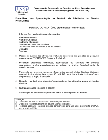 Pró-Reitoria de Pesquisa Programa de Concessão de Técnico de Nível Superior para Grupos de Excelência (subprograma PROCONTES) Formulário para Apresentação do Relatório de Atividades do Técnico PROCONTES PERÍODO DO RELATÓRIO (dd/mm/aaaa – dd/mm/aaaa) 1. Informações gerais (não usar abreviação). Nome do servidor: Número funcional: Endereço eletrônico: Nome do docente responsável: Laboratório onde desenvolve as atividades: Unidade: Contato: 2. Descrição sucinta das atividades, incluindo benefícios aos projetos de pesquisa propostos no PROCONTES (máximo 1 página). 3. Principais produções científicas, tecnológicas ou artísticas do docente responsável e dos pesquisadores envolvidos no projeto (eventualmente do próprio técnico). 4. Formação de recursos humanos, decorrentes das atividades técnicas (listagem nominal, indicando também o tipo: IC, MS, DR, etc.). Se bolsista, indicar número do processo e órgão financiador. 5. Relação nominal dos docentes/pesquisadores beneficiados pelas atividades técnicas. 6. Outras atividades (máximo 1 página). 7. Apreciação do professor responsável sobre o desempenho do técnico. ATENÇÃO: a) O relatório deverá ser elaborado e assinado pelo servidor. b) O docente responsável também deverá assinar o relatório. c) Relatório assinado + anexos (quando pertinentes): gerar um único documento em PDF, de no máximo 5Mb. Pró-Reitoria de Pesquisa/USP (atualizado em julho/2013) 1