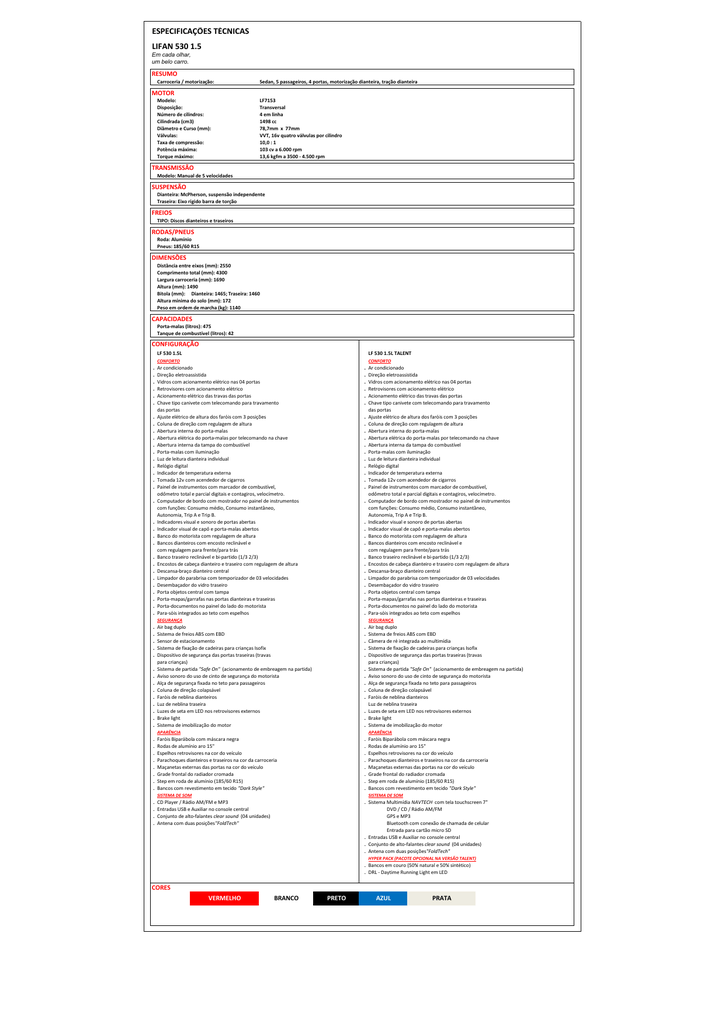 ESPECIFICAÇÕES TÉCNICAS LIFAN 530 1.5 Em cada olhar, um belo carro. RESUMO Carroceria / motorização: Sedan, 5 passageiros, 4 portas, motorização dianteira, tração dianteira MOTOR Modelo: Disposição: Número de cilindros: Cilindrada (cm3) Diâmetro e Curso (mm): Válvulas: Taxa de compressão: Potência máxima: Torque máximo: LF7153 Transversal 4 em linha 1498 cc 78,7mm x 77mm VVT, 16v quatro válvulas por cilindro 10,0 : 1 103 cv a 6.000 rpm 13,6 kgfm a 3500 - 4.500 rpm TRANSMISSÃO Modelo: Manual de 5 velocidades SUSPENSÃO Dianteira: McPherson, suspensão independente Traseira: Eixo rígido barra de torção FREIOS TIPO: Discos dianteiros e traseiros RODAS/PNEUS Roda: Alumínio Pneus: 185/60 R15 DIMENSÕES Distância entre eixos (mm): 2550 Comprimento total (mm): 4300 Largura carroceria (mm): 1690 Altura (mm): 1490 Bitola (mm): Dianteira: 1465; Traseira: 1460 Altura mínima do solo (mm): 172 Peso em ordem de marcha (kg): 1140 CAPACIDADES Porta-malas (litros): 475 Tanque de combustível (litros): 42 CONFIGURAÇÃO LF 530 1.5L LF 530 1.5L TALENT CONFORTO . . . . . . . . . . . . . . . . . . . . . . . . . . . . . . . CONFORTO Ar condicionado Direção eletroassistida Vidros com acionamento elétrico nas 04 portas Retrovisores com acionamento elétrico Acionamento elétrico das travas das portas Chave tipo canivete com telecomando para travamento das portas Ajuste elétrico de altura dos faróis com 3 posições Coluna de direção com regulagem de altura Abertura interna do porta-malas Abertura elétrica do porta-malas por telecomando na chave Abertura interna da tampa do combustível Porta-malas com iluminação Luz de leitura dianteira individual Relógio digital Indicador de temperatura externa Tomada 12v com acendedor de cigarros Painel de instrumentos com marcador de combustível, odômetro total e parcial digitais e contagiros, velocímetro. Computador de bordo com mostrador no painel de instrumentos com funções: Consumo médio, Consumo instantâneo, Autonomia, Trip A e Trip B. Indicadores visual e sonoro de portas abertas Indicador visual de capô e porta-malas abertos Banco do motorista com regulagem de altura Bancos dianteiros com encosto reclinável e com regulagem para frente/para trás Banco traseiro reclinável e bi-partido (1/3 2/3) Encostos de cabeça dianteiro e traseiro com regulagem de altura Descansa-braço dianteiro central Limpador do parabrisa com temporizador de 03 velocidades Desembaçador do vidro traseiro Porta objetos central com tampa Porta-mapas/garrafas nas portas dianteiras e traseiras Porta-documentos no painel do lado do motorista Para-sóis integrados ao teto com espelhos . . . . . . . . . . . . . . . . . . . . . . . . . . . . . . . SEGURANÇA . . . . . . . . . . . . . . SEGURANÇA Air bag duplo Sistema de freios ABS com EBD Sensor de estacionamento Sistema de fixação de cadeiras para crianças Isofix Dispositivo de segurança das portas traseiras (travas para crianças) Sistema de partida "Safe On" (acionamento de embreagem na partida) Aviso sonoro do uso de cinto de segurança do motorista Alça de segurança fixada no teto para passageiros Coluna de direção colapsável Faróis de neblina dianteiros Luz de neblina traseira Luzes de seta em LED nos retrovisores externos Brake light Sistema de imobilização do motor . . . . . . . . . . . . . APARÊNCIA . . . . . . . . . . . . Ar condicionado Direção eletroassistida Vidros com acionamento elétrico nas 04 portas Retrovisores com acionamento elétrico Acionamento elétrico das travas das portas Chave tipo canivete com telecomando para travamento das portas Ajuste elétrico de altura dos faróis com 3 posições Coluna de direção com regulagem de altura Abertura interna do porta-malas Abertura elétrica do porta-malas por telecomando na chave Abertura interna da tampa do combustível Porta-malas com iluminação Luz de leitura dianteira individual Relógio digital Indicador de temperatura externa Tomada 12v com acendedor de cigarros Painel de instrumentos com marcador de combustível, odômetro total e parcial digitais e contagiros, velocímetro. Computador de bordo com mostrador no painel de instrumentos com funções: Consumo médio, Consumo instantâneo, Autonomia, Trip A e Trip B. Indicador visual e sonoro de portas abertas Indicador visual de capô e porta-malas abertos Banco do motorista com regulagem de altura Bancos dianteiros com encosto reclinável e com regulagem para frente/para trás Banco traseiro reclinável e bi-partido (1/3 2/3) Encostos de cabeça dianteiro e traseiro com regulagem de altura Descansa-braço dianteiro central Limpador do parabrisa com temporizador de 03 velocidades Desembaçador do vidro traseiro Porta objetos central com tampa Porta-mapas/garrafas nas portas dianteiras e traseiras Porta-documentos no painel do lado do motorista Para-sóis integrados ao teto com espelhos Air bag duplo Sistema de freios ABS com EBD Câmera de ré integrada ao multimídia Sistema de fixação de cadeiras para crianças Isofix Dispositivo de segurança das portas traseiras (travas para crianças) Sistema de partida "Safe On" (acionamento de embreagem na partida) Aviso sonoro do uso de cinto de segurança do motorista Alça de segurança fixada no teto para passageiros Coluna de direção colapsável Faróis de neblina dianteiros Luz de neblina traseira Luzes de seta em LED nos retrovisores externos Brake light Sistema de imobilização do motor APARÊNCIA Faróis Biparábola com máscara negra Rodas de alumínio aro 15" Espelhos retrovisores na cor do veículo Parachoques dianteiros e traseiros na cor da carroceria Maçanetas externas das portas na cor do veículo Grade frontal do radiador cromada Step em roda de alumínio (185/60 R15) Bancos com revestimento em tecido "Dark Style" . . . . . . . . SISTEMA DE SOM SISTEMA DE SOM . Sistema Multimídia NAVTECH com tela touchscreen 7" CD Player / Rádio AM/FM e MP3 Entradas USB e Auxiliar no console central Conjunto de alto-fa