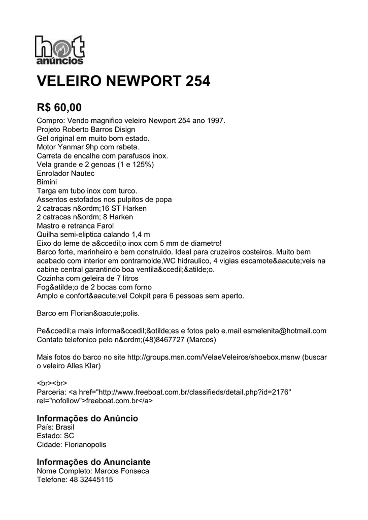VELEIRO NEWPORT 254 R$ 60,00 Compro: Vendo magnifico veleiro Newport 254 ano 1997. Projeto Roberto Barros Disign Gel original em muito bom estado. Motor Yanmar 9hp com rabeta. Carreta de encalhe com parafusos inox. Vela grande e 2 genoas (1 e 125%) Enrolador Nautec Bimini Targa em tubo inox com turco. Assentos estofados nos pulpitos de popa 2 catracas nº16 ST Harken 2 catracas nº 8 Harken Mastro e retranca Farol Quilha semi-eliptica calando 1,4 m Eixo do leme de aço inox com 5 mm de diametro! Barco forte, marinheiro e bem construido. Ideal para cruzeiros costeiros. Muito bem acabado com interior em contramolde,WC hidraulico, 4 vigias escamoteáveis na cabine central garantindo boa ventilação. Cozinha com geleira de 7 litros Fogão de 2 bocas com forno Amplo e confortável Cokpit para 6 pessoas sem aperto. Barco em Florianópolis. Peça mais informações e fotos pelo e.mail [email protected] Contato telefonico pelo nº(48)8467727 (Marcos) Mais fotos do barco no site http://groups.msn.com/VelaeVeleiros/shoebox.msnw (buscar o veleiro Alles Klar) <br><br> Parceria: <a href="http://www.freeboat.com.br/classifieds/detail.php?id=2176" rel="nofollow">freeboat.com.br</a> Informações do Anúncio País: Brasil Estado: SC Cidade: Florianopolis Informações do Anunciante Nome Completo: Marcos Fonseca Telefone: 48 32445115