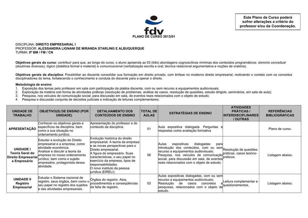 Este Plano de Curso poderá sofrer alterações a critério do professor e/ou da Coordenação. PLANO DE CURSO 2013/01 DISCIPLINA: DIREITO EMPRESARIAL I PROFESSOR: ALESSANDRA LIGNANI DE MIRANDA STARLING E ALBUQUERQUE TURMA: 9º BM / FM / CN Objetivos gerais do curso: contribuir para que, ao longo do curso, o aluno apreenda as 03 (três) abordagens cognoscitivas mínimas dos conteúdos programáticos: domínio conceitual (doutrinas diversas), lógico (dialética formal e material) e comunicacional (verbalização escrita e oral, técnica redacional argumentativa e noções de oratória). Objetivos gerais da disciplina: Possibilitar ao discente consolidar sua formação em direito privado, com ênfase no moderno direito empresarial, motivando o contato com os conceitos disciplinadores do tema, fortalecendo o conhecimento e conduta do discente para a operar o direito. Metodologia de ensino: 1. Exposição dos temas pelo professor em sala com participação da platéia discente, com ou sem recurso a equipamentos audiovisuais; 2. Exploração da matéria sob forma de atividades práticas (resolução de problemas, análise de casos, resolução de questões, estudo dirigido, seminários, em sala de aula); 3. Pesquisa, nos veículos de comunicação social, para discussão em sala, de eventos reais relacionados com o objeto de estudo; 4. Pesquisa e discussão conjunta de decisões judiciais e indicação de leituras complementares; UNIDADE DE TRABALHO OBJETIVO(S) DE ENSINO (POR UNIDADE) Conhecer os objetivos gerais e específicos da disciplina, bem APRESENTAÇÃO como a sua situação no ordenamento jurídico. Estudar a evolução do Direito empresarial e a empresa, como atividade econômica. UNIDADE I Analisar e discutir a teoria da Teoria Geral do empresa no nosso ordenamento Direito Empresarial jurídico, bem como o sujeito e Empresário empresário, protagonista dessa atividade. UNIDADE II Registro Empresarial DETALHAMENTO DOS CONTEÚDOS DE ENSINO Apresentação do professor e do conteúdo da disciplina. Evolução histórica do direito empresarial: A teoria da empresa e as novas perspectivas para o Direito empresarial. A figura do empresário. Suas características, o seu papel no exercício da empresa, tipos de responsabilidades. O novo instituto da pessoa jurídica (EIRELI) Estudar o Sistema nacional de Órgãos do registro. Atos, registro, seus órgãos,.bem como o procedimentos e conseqüências seu papel no registro dos sujeitos da falta de registro. e das atividades empresariais. TOTAL DE AULAS ESTRATÉGIAS DE ENSINO 01 Aula expositiva dialogada. Perguntas e respostas como avaliação formativa 06 03 ATIVIDADES PRÁTICAS / INTERDISCIPLINARES / OUTRAS Aulas expositivas dialogadas para introdução dos conteúdos, com ou sem Resolução de questões recurso a equipamentos audiovisuais; práticas, casos teóricoPesquisa, nos veículos de comunicação práticos. social, para discussão em sala, de eventos reais relacionados com o objeto de estudo; Aulas expositivas dialogadas, com ou sem recurso a equipamentos audiovisuais; Leitura complementar e Resolução de casos concretos e questionamentos. pesquisas, relacionados com o objeto de estudo. REFERÊNCIAS BIBLIOGRÁFICAS Plano de curso. Listagem abaixo. Listagem abaixo. Estudar as espécies de nome empresarial, diferenciando firma UNIDADE III de denominação, bem como as Nome Empresarial possibilidades de alteração do nome e a proteção existente. UNIDADE IV Do Estabelecimento comercial. Estudar o conceito, natureza jurídica, alienação, responsabilidades, e demais aspectos, envolvendo o estabelecimento empresarial. Apresentação dos títulos de crédito existentes no nosso ordenamento jurídico. Títulos de Créditos Conceito, natureza jurídica, classificação, princípios, atos cambiais, cobrança, execução, e outros aspectos comuns aos títulos cambiais. Espécies, formação, alteração e proteção do nome empresarial. 02 Estabelecimento empresarial. 04 UNIDADE V Estudo dos títulos em espécie: UNIDADE VI Letra de câmbio; Nota promissória; Títulos de Crédito Duplicata; Cheque; e em Espécie Demais títulos impróprios. UNIDADE VII Propriedade Industrial. Teoria Geral dos Títulos de Crédito 04 Ttítulos de Crédito em espécie Situar a propriedade industrial, dentro da propriedade intelectual. Estudar os bens da propriedade industrial, basicamente os Propriedade Industrial ( invenção, registros e as patentes. Analisar o modelo de utilidade, marca, papel do Instituto Nacional de desenho industrial) Patentes, Propriedade Industrial. Verificar os Registros. INPI conflitos entre bens da propriedade industrial com outras categorias jurídicas. Aula expositiva dialogada, com ou sem recurso a equipamentos audiovisuais; Resolução de questões Pesquisa, nos veículos de comunicação práticas, casos teóricosocial, para discussão em sala, de eventos práticos. reais relacionados com o objeto de estudo; Aula expositiva dialogada, com ou sem Exercício. Resolução de recurso a equipamentos audiovisuais; casos teórico-práticos. Pesquisa, nos veículos de comunicação Leitura complementar e social, para discussão em sala, de eventos questionamentos que reais relacionados com o objeto de estudo; serão definidos ao Pesquisa e discussão conjunta de decisões longo do curso. judiciais. Estudo dirigido. Aula expositiva dialogada, com ou sem Resolução de questões recurso a equipamentos audiovisuais; discursivas práticas. Perguntas e respostas como avaliação Leitura complementar e formativa. questionamentos que Aulas práticas na solução de casos serão definidos ao concretos. Estudo dirigido. longo do curso. OBRA 02 Listagem abaixo. 06 Listagem abaixo. 05 Aula expositiva dialogada, com ou sem recurso a equipamentos audiovisuais; Seminário com Pesquisa, nos veículos de comunicação indicação de leitura social, para discussão em sala, de eventos complementar e reais relacionados com o objeto de estudo; ques