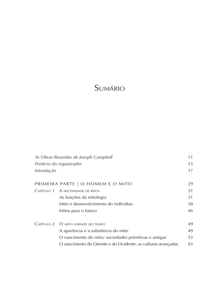 SUMÁRIO As Obras Reunidas de Joseph Campbell 11 Prefácio do organizador 13 Introdução 17 PRIMEIRA PARTE | O HOMEM E O MITO 29 CAPÍTULO 1 A NECESSIDADE DE RITOS 31 CAPÍTULO 2 As funções da mitologia 31 Mito e desenvolvimento do indivíduo 38 Mitos para o futuro 46 O MITO ATRAVÉS DO TEMPO 49 A aparência e a substância do mito 49 O nascimento do mito: sociedades primitivas e antigas 53 O nascimento do Oriente e do Ocidente: as culturas avançadas 63 SEGUNDA PARTE | O MITO VIVO 71 CAPÍTULO 3 SOCIEDADE E SÍMBOLO 73 O mecanismo dos mitos: como os símbolos atuam 73 Sociedade, mito e desenvolvimento pessoal 75 O ego: Oriente e Ocidente 78 CAPÍTULO 4 O MITO E O SELF 89 Jung e as polaridades da personalidade 89 Os arquétipos do inconsciente coletivo 94 CAPÍTULO 5 O MITO PESSOAL 109 Jung: qual é o mito pelo qual eu vivo? 109 As funções tradicionais e atuais da mitologia 127 TERCEIRA PARTE | A JORNADA DO HERÓI 133 CAPÍTULO 6 O SELF COMO HERÓI 135 QUARTA PARTE | DIÁLOGOS 157 CAPÍTULO 7 DIÁLOGOS 159 Notas 181 Uma bibliografia de Joseph Campbell 191 O autor 195 A Fundação Joseph Campbell 203 AS OBRAS REUNIDAS DE JOSEPH CAMPBELL Quando morreu, em 1987, Joseph Campbell deixou um volume significativo de obras publicadas, que investigavam aquilo que foi a paixão da sua vida: o conjunto de mitos e símbolos universais por ele denominados “uma grande história da humanidade”. Deixou também uma quantidade enorme de obras não publicadas: artigos esparsos, anotações, cartas e diários, além de palestras gravadas em fitas de áudio e vídeo. A Fundação Joseph Campbell (JCF) foi criada em 1991 para preservar, proteger e perpetuar a obra do autor. Ela tem se dedicado à catalogação de seus originais e de suas gravações em formato digital e à publicação de material inédito e obras esgotadas na série As Obras Reunidas de Joseph Campbell. AS OBRAS REUNIDAS DE JOSEPH CAMPBELL Robert Walter, editor-chefe David Kudler, organizador PREFÁCIO DO ORGANIZADOR Em 1972, enquanto compilava seu livro Myths to live by [Para viver os mitos], baseado em palestras que realizara durante duas décadas, Joseph Campbell disse ter tido uma revelação: A idéia que eu tinha de mim mesmo era que crescera nesse período, que minhas opiniões haviam mudado e, também, que eu progredira. Mas, quando reuni aqueles textos, todos diziam essencialmente a mesma coisa – ao longo de décadas. Descobri um pouco sobre o que me impulsionava. Eu não tinha uma idéia muito clara do que era até reconhecer a continuidade que havia no livro inteiro.Vinte e quatro anos é um bom espaço de tempo. Muita coisa aconteceu nele. E eu continuo a tagarelar sobre a mesma coisa.1 Ao compilar este livro, baseado em mais de uma dúzia de palestras, entrevistas e seminários ministrados por Campbell entre 1962 e 1983, tive uma impressão bem parecida. Eu selecionara todos esses textos porque mostravam Campbell explorando a idéia da mitologia como uma ferramenta para promover e entender o crescimento psicológico do indivíduo – aquilo a que ele chamava quarta função ou função 14 | Joseph Campbell psicológica do mito. Minha primeira intenção foi apresentar uma espécie de panorama histórico do pensamento de Campbell sobre o tema. Além disso, percebi que as idéias que ele postulou após concluir suas palestras na Cooper Union* e a longa série The Masks of God [As Máscaras de Deus] eram mesmo muito parecidas com aquelas que ele continuava investigando perto do fim da vida, ainda que em situações mais informais e intensivas, como os workshops do Instituto Esalen, nos quais comemorava seu aniversário todo ano. Parte de seu pensamento amadureceu – por exemplo, suas impressões acerca das promessas e dos perigos do LSD como uma porta para a liberação das imagens míticas do inconsciente coletivo –, mas a tese geral permanecia a mesma. Ele sentia que o mito propiciava uma referência para o crescimento e a transformação pessoal e que o entendimento de como os mitos e os símbolos afetam a mente do indivíduo oferecia a possibilidade de viver uma vida em sintonia com sua própria natureza – um caminho para a bem-aventurança. A lenta elaboração das idéias de Campbell tornou a organização deste livro infinitamente mais fácil e mais difícil do que a dos volumes anteriores da série As Obras Reunidas de Joseph Campbell em que trabalhei. Sake & satori: Asian journals – Japan [Saquê e satori: os diários asiáticos – Japão; ainda não traduzido para o português] foi tirado de fonte única, contínua, o que me permitiu verificar se Campbell contava bem a sua história. Myths of light: Eastern metaphors of the eternal [Mitos de luz: metáforas orientais do eterno] baseou-se em palestras e textos inéditos, abrangendo trinta anos de reflexões de Campbell a respeito da religião da Índia e do leste asiático; mas, quando ordenei os tópicos de tal forma que fizessem sentido como uma exploração da idéia do divino transcendente, cada parte se encaixou muito bem, com uma palestra por seção. A primeira parte deste livro, “O homem e o mito”, analisa o desenvolvimento histórico do mito como uma ferramenta para o crescimento não de sociedades, mas de indivíduos. Essa seção veio de uma série de palestras igualmente variadas. Meu maior trabalho ao organizá-las foi eliminar as redundâncias, de modo que o leitor não deparasse, por exemplo, com quatro ensaios separados a respeito das quatro funções da mitologia. A segunda parte, “O mito vivo”, no entanto, centra-se na psicologia fundamental do mito e proveio de uma série de apresentações realizadas ao longo de quase * Tradicional faculdade de artes, arquitetura e engenharia, com sede em Nova York. (N. do T.) M I TO E T R A N S F O R M A Ç Ã O | 15 uma década, todas intituladas “Vivendo o seu mito pessoal” (título que o próprio Campbell nunca apreciou muito). Às vezes era uma palestra de uma hora de duração, às ve