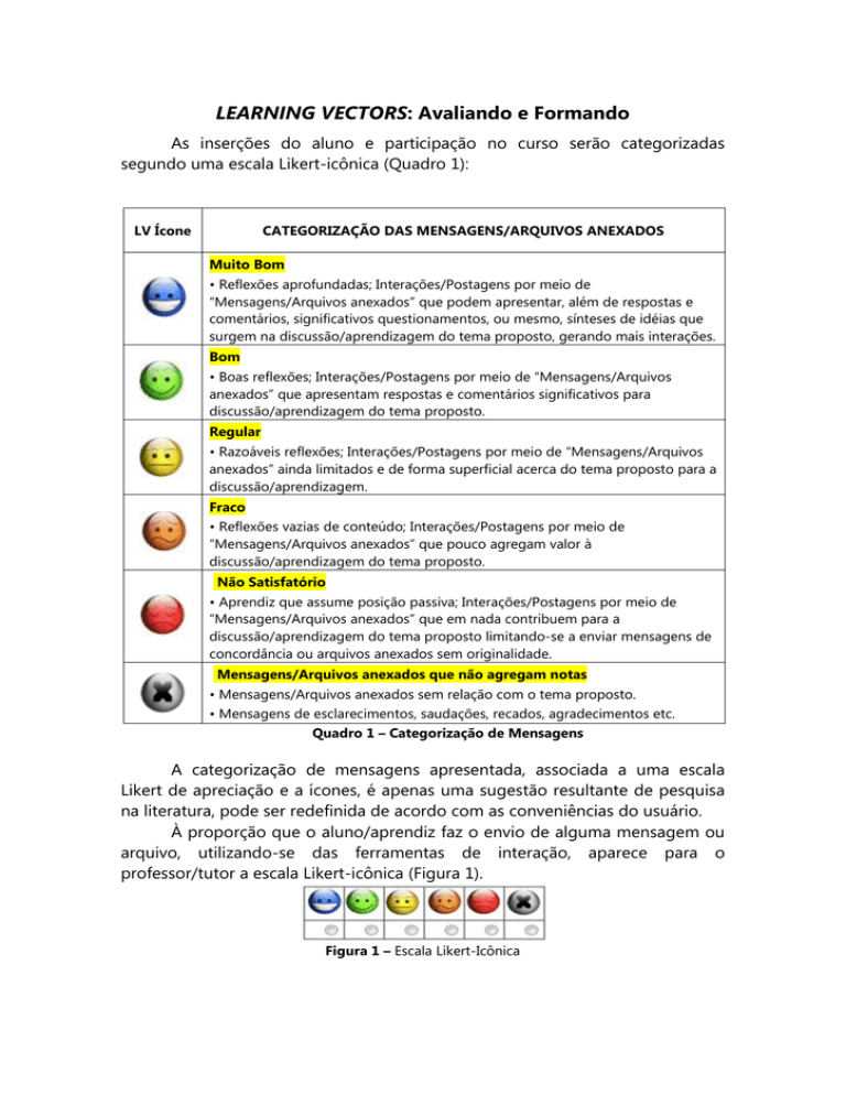 LEARNING VECTORS: Avaliando e Formando As inserções do aluno e participação no curso serão categorizadas segundo uma escala Likert-icônica (Quadro 1): LV Ícone CATEGORIZAÇÃO DAS MENSAGENS/ARQUIVOS ANEXADOS Muito Bom • Reflexões aprofundadas; Interações/Postagens por meio de “Mensagens/Arquivos anexados” que podem apresentar, além de respostas e comentários, significativos questionamentos, ou mesmo, sínteses de idéias que surgem na discussão/aprendizagem do tema proposto, gerando mais interações. Bom • Boas reflexões; Interações/Postagens por meio de “Mensagens/Arquivos anexados” que apresentam respostas e comentários significativos para discussão/aprendizagem do tema proposto. Regular • Razoáveis reflexões; Interações/Postagens por meio de “Mensagens/Arquivos anexados” ainda limitados e de forma superficial acerca do tema proposto para a discussão/aprendizagem. Fraco • Reflexões vazias de conteúdo; Interações/Postagens por meio de “Mensagens/Arquivos anexados” que pouco agregam valor à discussão/aprendizagem do tema proposto. Não Satisfatório • Aprendiz que assume posição passiva; Interações/Postagens por meio de “Mensagens/Arquivos anexados” que em nada contribuem para a discussão/aprendizagem do tema proposto limitando-se a enviar mensagens de concordância ou arquivos anexados sem originalidade. Mensagens/Arquivos anexados que não agregam notas • Mensagens/Arquivos anexados sem relação com o tema proposto. • Mensagens de esclarecimentos, saudações, recados, agradecimentos etc. Quadro 1 – Categorização de Mensagens A categorização de mensagens apresentada, associada a uma escala Likert de apreciação e a ícones, é apenas uma sugestão resultante de pesquisa na literatura, pode ser redefinida de acordo com as conveniências do usuário. À proporção que o aluno/aprendiz faz o envio de alguma mensagem ou arquivo, utilizando-se das ferramentas de interação, aparece para o professor/tutor a escala Likert-icônica (Figura 1). Figura 1 – Escala Likert-Icônica Ao clicar em um destes LV Ícones o professor/tutor faz sua avaliação da mensagem/arquivo anexado enviado pelo aluno, a qual será endereçada somente para seu emissor, único a visualizar a ação do tutor, o que garante sua privacidade. Embora ao LV Ícone “Bola X” não se agregue notas, ele serve para computar presença do aluno na atividade. Durante o processo de aprendizagem o aluno poderá consultar seu Vetor-Aprendizagem (Figura 2), que consta de uma representação geométrica onde a projeção horizontal do LV, vetor azul, relaciona-se à positividade de desempenho e a projeção vertical do LV, à negatividade de desempenho, representadas, respectivamente, pelas faixas verde e vermelha (SALES, 2008). A relação entre estes fatores, positividade-negatividade (FREDRICKSON e LOSADA, 2005; ARAÚJO e FILHO, 2005), denominado Fator β, revela a natureza qualitativa da ferramenta LV. Devidamente adaptado aos LV, tal fator relaciona os resultados positivos e negativos das contribuições dos alunos nas atividades colaborativas desenvolvidas. Figura 2 – Vetor-Aprendizagem Face não se poder representar no Vetor-Aprendizagem todas as possíveis notas, 24 ao todo (Tabela 1), foi criada a idéia de ponto. O conceito de ponto, que simboliza uma nota, está relacionado à separação entre duas marcas brancas consecutivas no Vetor-Aprendizagem. 0,0 0,7 1,3 2,0 2,6 3,2 3,8 4,4 5,0 5, 6 6,1 6,6 7,1 7,5 7,9 8,3 8,7 9,0 9,2 9,5 9,7 9,8 9,9 10,0 10,0 Tabela 1 – Nota Expressa no Vetor-Aprendizagem A cada atividade virtual ou presencial é atribuído um peso determinado por sua significância. A Significância é um percentual relacionado à importância da atividade e definida inicialmente pelos gestores do curso ou disciplina no ato de sua configuração, momento ainda em que se definem e se editam todas as atividades presenciais ou a distância no AVA. Fórum LV Apresenta-se a seguir (Figura 3), algo mais didático, com fins de esclarecer os critérios de avaliação nas interações com LV Fórum e, desta forma, mostrar-se mais compreensível aos usuários. 1ª Mensagem LV Ícone Valor Associado LV Ícone 7,1 5,6 3ª Mensagem em diante Pontos LV Avanço(+) Ícone Recuo (-) 2ª Mensagem Pontos Avanço + 12 + +9 Vetor-Aprendizagem +2 + +2 3,8 +6 +2 2,0 +3 -2 0,0 0 -2 - 0 0 Figura 3 – Mensagens em Fórum LV e Valores Associados aos LV Ícones Seja um aluno que inicia um Fórum LV com uma mensagem categorizada com LV Ícone Amarelo – 1ª mensagem (3,8 na nota), a seguir recebe uma seqüência de LV Ícones: Amarelo – 2ª mensagem (mais 6 pontos); Verde – 3ª mensagem (mais 2 pontos); Azul - 4ª mensagem (mais 2 pontos) e Bola X – 5ª mensagem (LV Ícone que não agrega valor de nota - 0 pontos), seu LV avança 10 pontos, resultando na nota parcial 8,66. Para concluir, em sua última mensagem, recebe um LV Ícone Laranja (penalização de 2 pontos), sua nota ao final do fórum será igual a 7,93. Tarefas LV Em tarefas a seleção de um valor de nota ocorre quando o professor/tutor clicar em uma das caixas localizadas abaixo dos LV Ícones (Figura 4). A visualização da nota será por efeito de mouse-over, ou seja, ao passar o mouse sobre a caixa surge a informação. ● ● ● ● ● ● ● ● ● ● ● ● ● ● ● ● ● ● ● ● ● ● ● ● ● - Figura 4 – Apresentação dos LV Ícones em Tarefas Apresenta-se a seguir (Figura 5), algo mais didático, com fins de esclarecer os critérios de avaliação nas Tarefas LV. LV Tarefa LV Ícone Escala Qualitativa Vetor-Aprendizagem Valores Associados Muito Bom 10,0 9,98 9,91 9,81 9,66 Bom 9,47 9,24 8,97 8,66 8,31 Regular 7,93 7,52 7,07 6,59 6,09 Fraco 5,56 5,00 4,42 3,83 3,21 Não 2,59 1,95 1,31 0,70 0,00 Satisfatório Não Agrega Nota Figura 5 – LV Ícones e Valores de Notas Associados em Tarefa LV Obs: Por enquanto somente os valores sombreados em amarelo estão