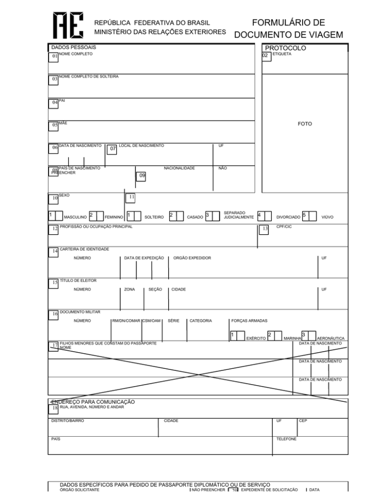 FORMULÁRIO DE DOCUMENTO DE VIAGEM REPÚBLICA FEDERATIVA DO BRASIL MINISTÉRIO DAS RELAÇÕES EXTERIORES DADOS PESSOAIS PROTOCOLO 01 NOME COMPLETO 03 ETIQUETA 02 NOME COMPLETO DE SOLTEIRA 04 PAI 05 MÃE FOTO 06 DATA DE NASCIMENTO 07 LOCAL DE NASCIMENTO 08 PAÍS DE NASCIMENTO PREENCHER 10 NACIONALIDADE 11 MASCULINO 2 FEMININO 1 12 PROFISSÃO OU OCUPAÇÃO PRINCIPAL 14 CARTEIRA DE IDENTIDADE NÚMERO 15 SOLTEIRO 2 CASADO 3 SEPARADO JUDICIALMENTE DIVORCIADO VIÚVO CPF/CIC 13 DATA DE EXPEDIÇÃO 5 ORGÃO EXPEDIDOR UF ZONA SEÇÃO CIDADE UF DOCUMENTO MILITAR NÚMERO RM/DN/COMAR CSM/OAM SÉRIE CATEGORIA FORÇAS ARMADAS 1 17 4 TÍTULO DE ELEITOR NÚMERO 16 NÃO 09 SEXO 1 UF EXÉRCITO 2 3 MARINHA AERONÁUTICA DATA DE NASCIMENTO FILHOS MENORES QUE CONSTAM DO PASSAPORTE NOME DATA DE NASCIMENTO DATA DE NASCIMENTO ENDEREÇO PARA COMUNICAÇÃO 18 RUA, AVENIDA, NÚMERO E ANDAR DISTRITO/BAIRRO PAÍS CIDADE UF CEP TELEFONE DADOS ESPECÍFICOS PARA PEDIDO DE PASSAPORTE DIPLOMÁTICO OU DE SERVIÇO ÓRGÃO SOLICITANTE NÃO PREENCHER 20 EXPEDIENTE DE SOLICITAÇÃO DATA NÚMERO 19 21 CARGO DO TITULAR DO PASSAPORTE A SER CONCEDIDO 23 MISSÃO E PAÍS(ES) A SER(EM) PERCORRIDO(S) 22 PERÍODO DA MISSÃO 24 DOCUMENTO DE VIAGEM PARA DEPENDENTE 1 2 25 ESPOSO(A) FILHO(A) DEPENDENTE DO(A) SENHO(A) 1 2 PAI 3 MÃE TERMO DE RESPONSABILIDADE OUTROS COMPROVANTE DE RECEBIMENTO 27 26 DECLARO VERDADEIRAS E COMPLETAS AS INFORMAÇÕES CONTIDAS NESTE DOCUMENTO LOCAL DATA LOCAL ASSINATURA ASSINATURA ___________________________________________________________________ ___________________________________________________________________ RECEBI E CONFERI O DOCUMENTO DE VIAGEM REQUERIDO DATA USO OFICIAL 28 POSTO DE ORIGEM/DIVISÃO SIGLA 29 MICROFILME CONSULADO-GERAL EM NOVA YORK 30 TIPO DO PEDIDO OU COMUNICAÇÃO NÃO PREENCHER 1 PEDIDO DE PASSAPORTE DIPLOMÁTICO 2 PEDIDO DE PASSAPORTE DE SERVIÇO 3 PEDIDO DE PASSAPORTE TE COMUM 6 PEDIDO DE PRORROGAÇÃO 7 COMUNICAÇÃO DE CANCELAMENTO 8 COMUNICAÇÃO 9 DE RECUPERAÇÃO 4 CONCEDIDO 31 DOCUMENTO NÚMERO 32 EXPEDIENTE DO POSTO NÚMERO AUTORIZAÇÃO DE RETORNO AO BRASIL 5 PEDIDO DE LAISSER-PASSER COMUNICAÇÃO DE PERDA 10 COMUNICAÇÃO DE FURTO/ ROUBO TIPO 33 DATA EMISSÃO EXPEDIENTE DA SERE NÚMERO SOBRE DOCUMENTOS DE VIAGEM RECUPERADOS, PERDIDOS, FURTADOS/ROUBADOS 34 INFORMAÇÕES NÚMERO DO DOCUMENTO DE VIAGEM TIPO ÓRGÃO EXPEDIDOR/CIDADE VALIDADE DATA NÃO PREENCHER DATA DE EXPEDIÇÃO 35 DOCUMENTO CONFERIDO POR 36 DESPACHO ASSINATURA ASSINATURA DO RESPONSÁVEL 37 DATA OBSERVAÇÕES REQUISITOS PARA PASSAPORTE CONCESSÃO DATA 1. Apresentar: a). passaporte expirado; b). certidão de nascimento ou de casamento brasileira ou registro de casamento feito em Repartição brasileira no exterior, constando nome correto e completo do requerente; c). não dispondo dos documentos acima, poderá ser aceita carteira de identidade brasileira, desde que o nome esteja gravado corretamente. 2. Os cidadãos de sexo masculino entre dezoito e quarenta e cinco anos de idade devem apresentar documento que comprove estarem em dia com as obrigações militares, especialmente se o passaporte anterior tiver sido expedido antes de ter o titular completado dezoito anos. 3. Duas fotos recentes,(últimos 6 meses), com data na frente da fotografia, tamanho 2 x 3 polegadas (inches), tiradas de frente para a câmara, preto e branco ou coloridas em fundo branco. No caso de menores, favor identificar a lápis cada foto no verso. Expressão séria de preferência sem óculos. Tamanho do rosto na horizontal : 1.5 polegadas(inches). 4. Taxa consular de US$ 30.00 para cada passaporte, em dinheiro ou "money order”. Em caso de envio pelo correio, favor usar somente “money order”. Em caso de dano ou de extravio do passaporte serão cobrados US$ 60.00 para cada unidade. Não serão aceitos cheques pessoais. 5. Preencher corretamente e sem abreviaturas uma via deste formulário em letra de imprensa, com caneta azul ou preta ou à máquina. 6. Para menores de 18 anos, a autorização para concessão de passaporte para menores, abaixo indicada, deverá ser assinada pelo pai e pela mãe, ou responsável legal, pessoalmente, munido(a) de documento de identificação com nome completo, fotografia e assinatura. A autorização deverá ser assinada no Consulado ou legalizada em Notário Público; nesse caso, é necessário, apresentação de documento de identidade do qual conste assinatura do portador. 7. Para maiores de 18 anos, prova de quitação de obrigações eleitorais (Título de eleitor ou, no caso de residente permanente, green card ou passaporte americano). Observação: Os filhos de brasileiros nascidos nos EUA deverão apresentar o passaporte norteamericano para fins de anotação no passaporte brasileiro. PRORROGAÇÃO O decreto nº 1.983, de 14/08/96 não mais admite a prorrogação de passaportes. OBSERVAÇÃO. 1. Caso o interessado tenha dificuldade na apresentação de algum documento, poderá solicitar o termo de declaração, a critério da autoridade consular. 2. O Consulado-Geral do Brasil em Nova York reserva-se o direito de solicitar documentação complementar, nos termos do § 3º , do inciso IV, do artigo 19, do Decreto nº 637, de 24/08/92. 3. Para restituição pelo correio dos documentos solicitados, será necessário remeter envelope selado, em montante suficiente para devolução do documento e auto-endereçado. AUTORIZAÇÃO PARA EXPEDIÇÃO DE PASSAPORTE PARA MENOR Autorizamos o Consulado-Geral do Brasil em Nova York a emitir documento de viagem para nosso(a) filho(a) menor, identificado(a) no verso: (We hereby authorize the Consulate General of Brazil to issue a travel document to our child, identified in this form) ______________________________________ ASSINATURA DO PAI (Father’s Signature) ______________________________________ ASSINATURA DA MÃE (Mother’s Signature) Observação: Para menores viajando desacompanhados ou na companhia de apenas um dos pais favor contatar o Setor de Legaliz